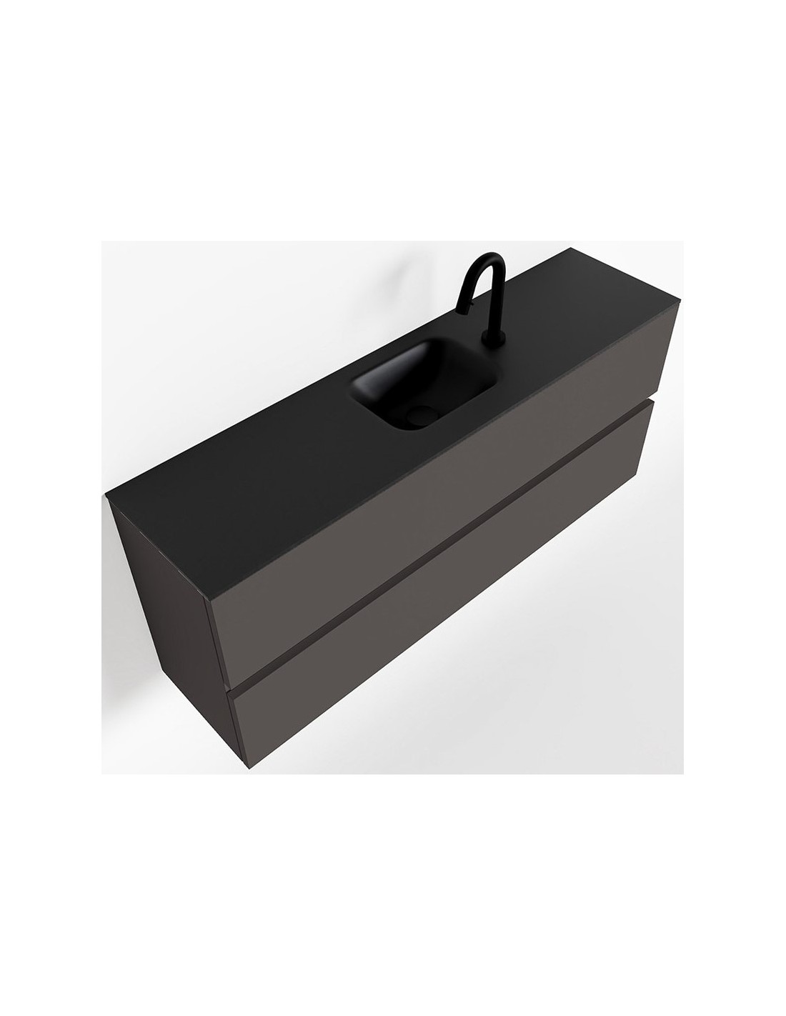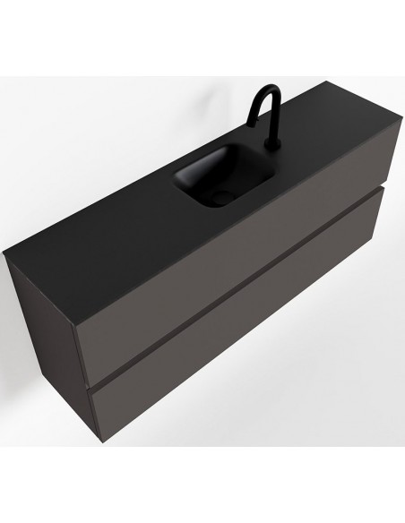 ADA Komplet badmiljø med centreret håndvask til bordmonteret armatur. Badmiljøet kommer med 2 skuffer med fuldt udtræk, og er fremstillet i MDF. Håndvasken er fremstillet i sort solid surface. Badmiljøet måler 120 x 50 cm i bredde og højde. Det viste armatur medfølger ikke i sættet.