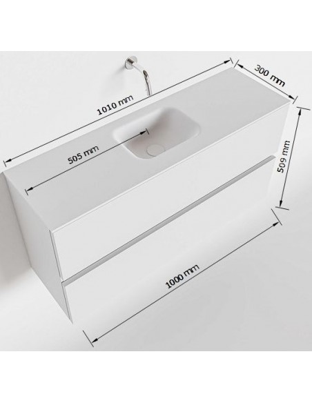 ADA Komplet badmiljø med centreret håndvask til bordmonteret armatur. Badmiljøet kommer med 2 skuffer med fuldt udtræk, og er fremstillet i MDF med design af vasket eg. Håndvasken er fremstillet i sort solid surface. Badmiljøet måler 100 x 50 cm i bredde og højde. Det viste armatur medfølger ikke i sættet.