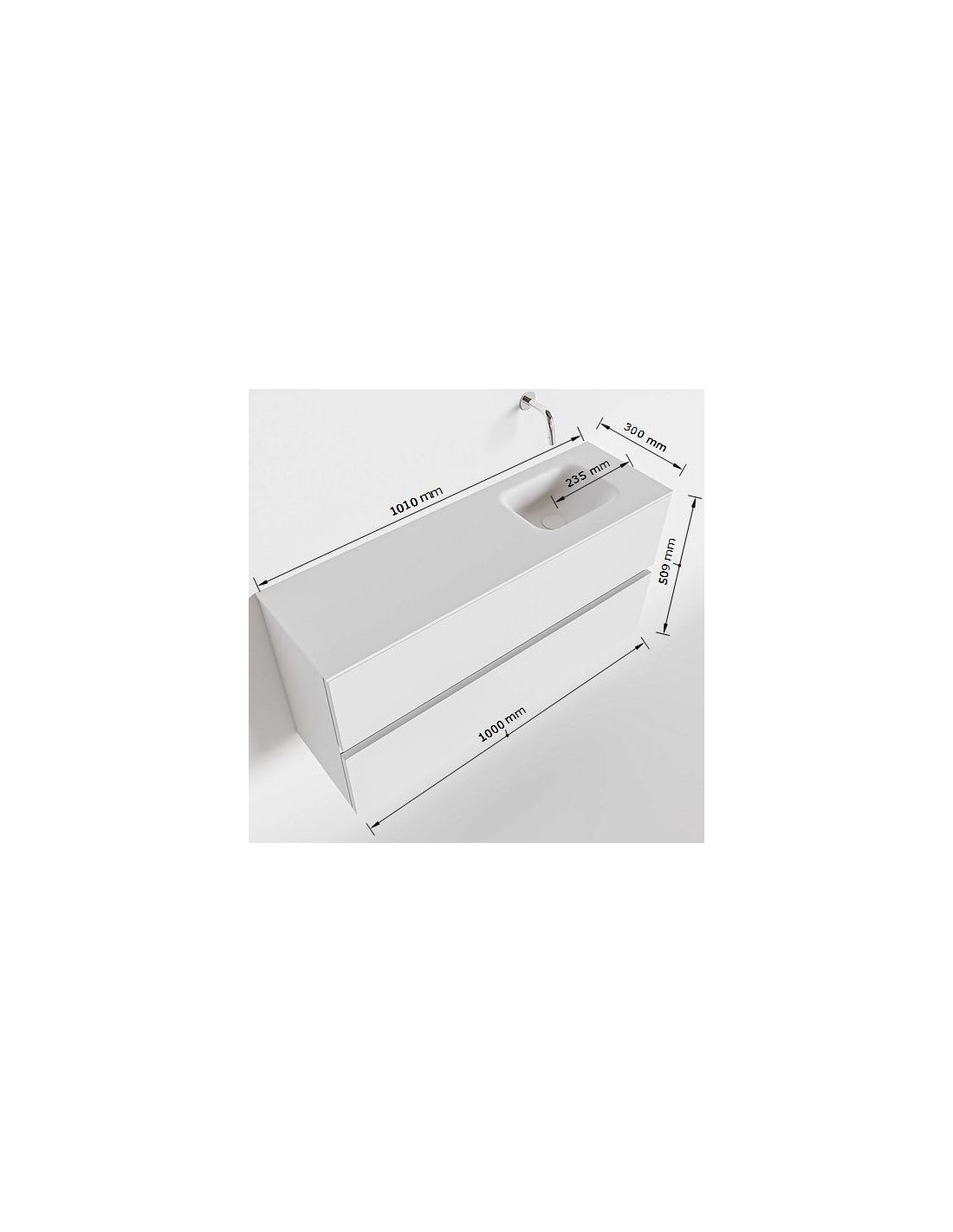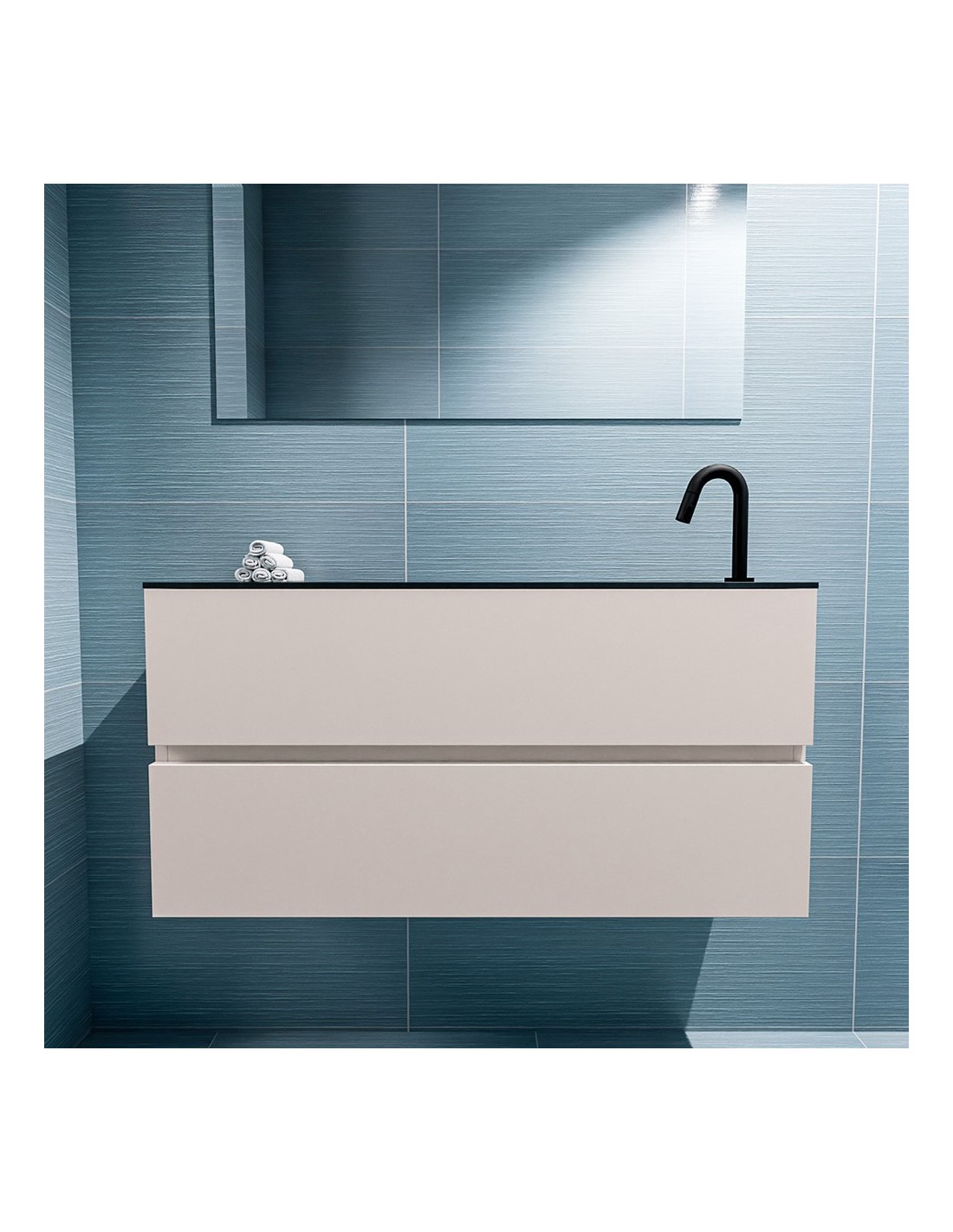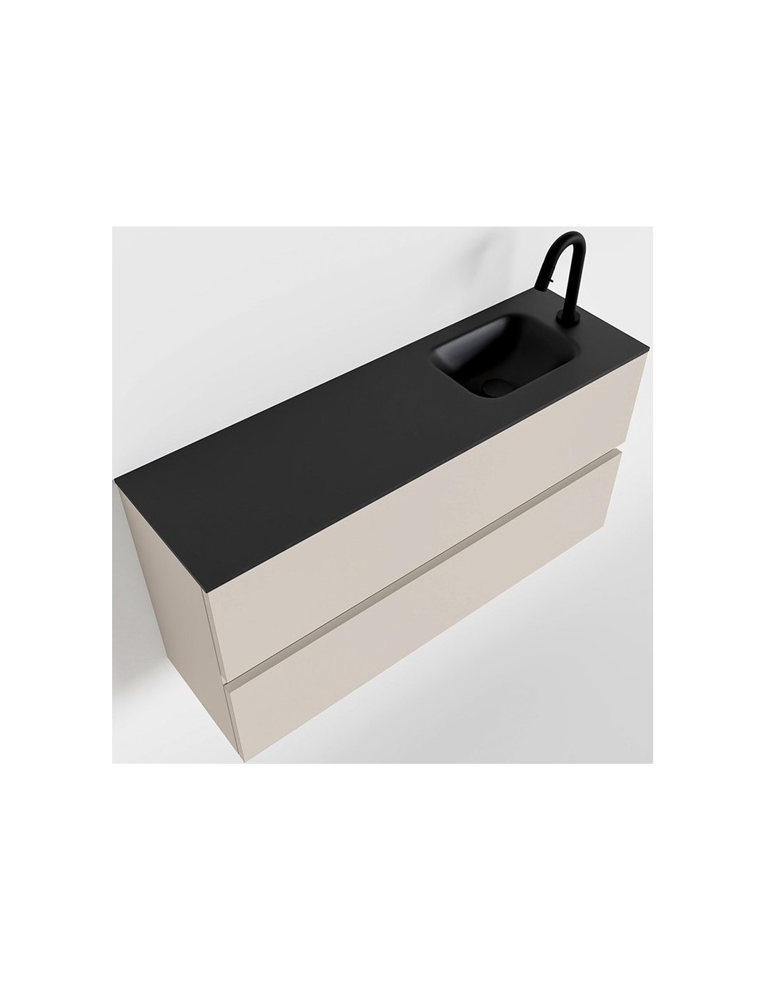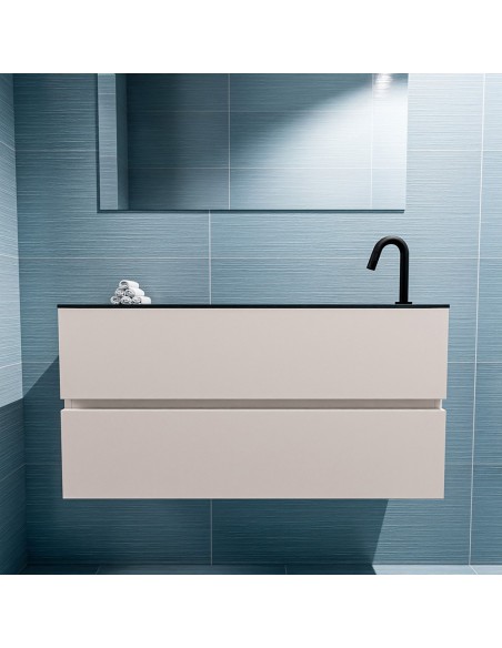 ADA Komplet badmiljø med højrevendt håndvask til bordmonteret armatur. Badmiljøet kommer med 2 skuffer med fuldt udtræk, og er fremstillet i MDF. Håndvasken er fremstillet i sort solid surface. Badmiljøet måler 100 x 50 cm i bredde og højde. Det viste armatur medfølger ikke i sættet.