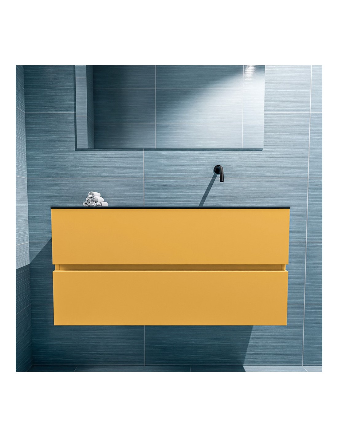 ADA Komplet badmiljø med højrevendt håndvask til vægmonteret armatur. Badmiljøet kommer med 2 skuffer med fuldt udtræk, og er fremstillet i MDF. Håndvasken er fremstillet i sort solid surface. Badmiljøet måler 100 x 50 cm i bredde og højde. Det viste armatur medfølger ikke i sættet.