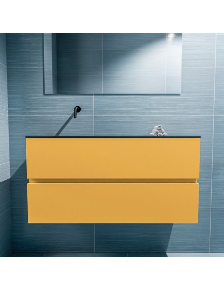 ADA Komplet badmiljø med venstrevendt håndvask til vægmonteret armatur. Badmiljøet kommer med 2 skuffer med fuldt udtræk, og er fremstillet i MDF. Håndvasken er fremstillet i sort solid surface. Badmiljøet måler 100 x 50 cm i bredde og højde. Det viste armatur medfølger ikke i sættet.