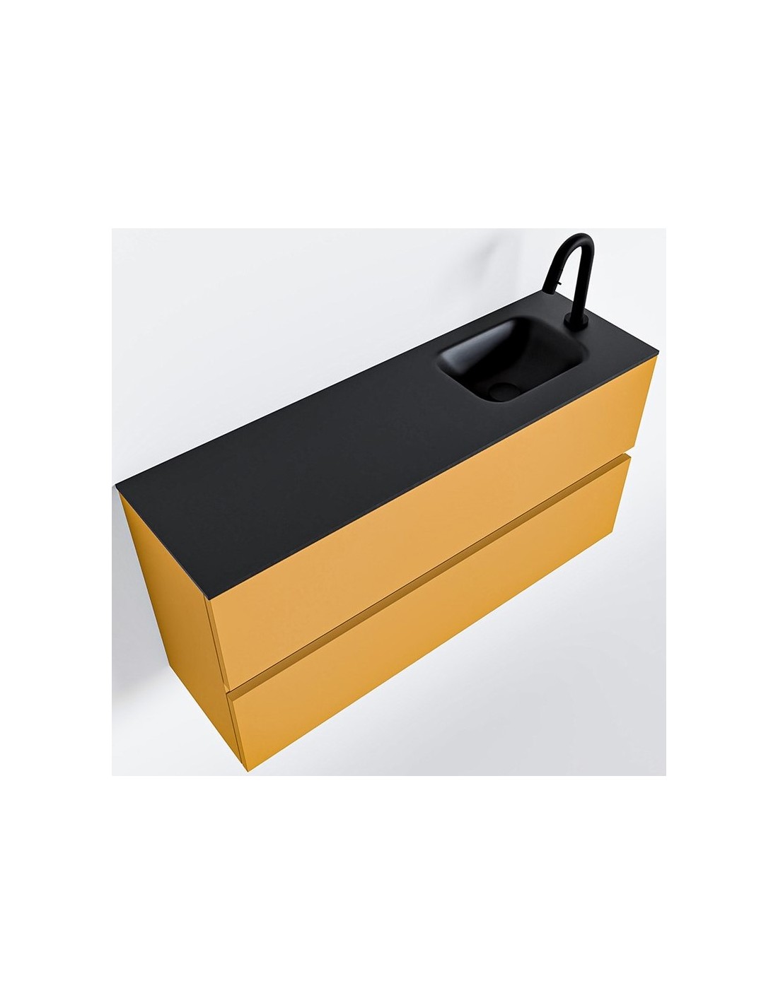 ADA Komplet badmiljø med højrevendt håndvask til bordmonteret armatur. Badmiljøet kommer med 2 skuffer med fuldt udtræk, og er fremstillet i MDF. Håndvasken er fremstillet i sort solid surface. Badmiljøet måler 100 x 50 cm i bredde og højde. Det viste armatur medfølger ikke i sættet.