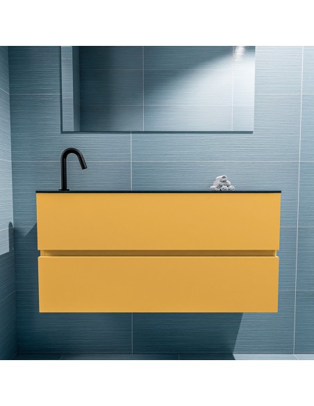 ADA Komplet badmiljø med venstrevendt håndvask til bordmonteret armatur. Badmiljøet kommer med 2 skuffer med fuldt udtræk, og er fremstillet i MDF. Håndvasken er fremstillet i sort solid surface. Badmiljøet måler 100 x 50 cm i bredde og højde. Det viste armatur medfølger ikke i sættet.