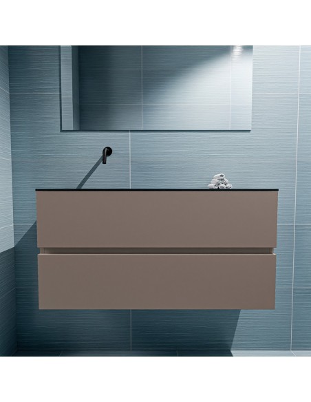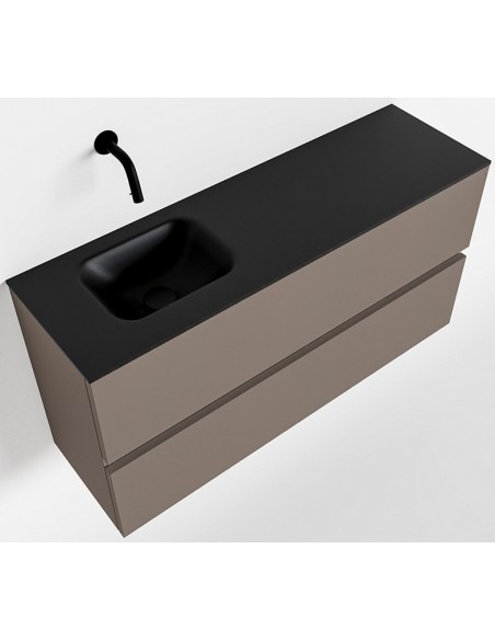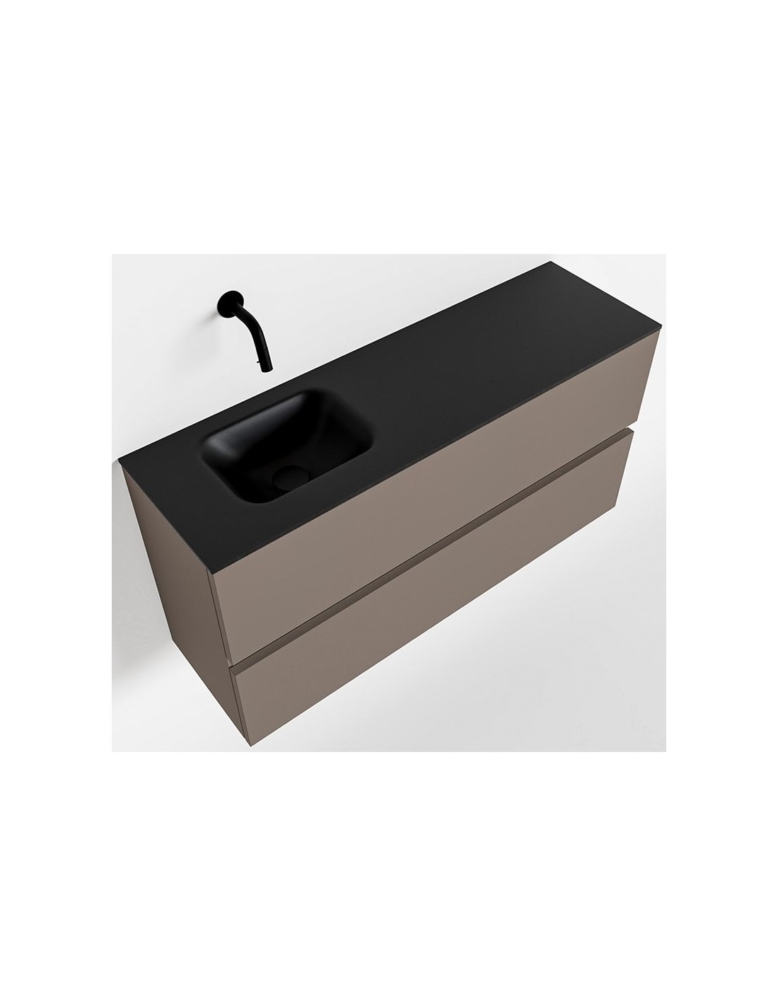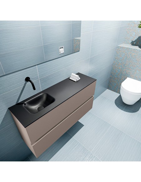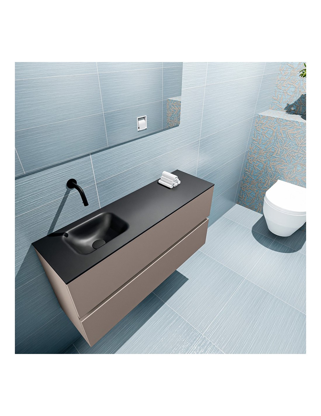 ADA Komplet badmiljø med venstrevendt håndvask til vægmonteret armatur. Badmiljøet kommer med 2 skuffer med fuldt udtræk, og er fremstillet i MDF. Håndvasken er fremstillet i sort solid surface. Badmiljøet måler 100 x 50 cm i bredde og højde. Det viste armatur medfølger ikke i sættet.