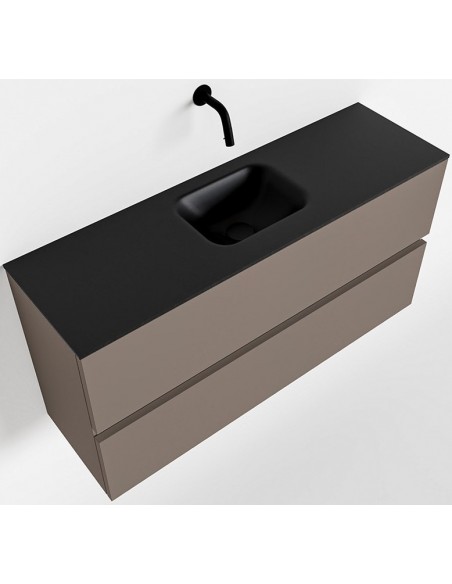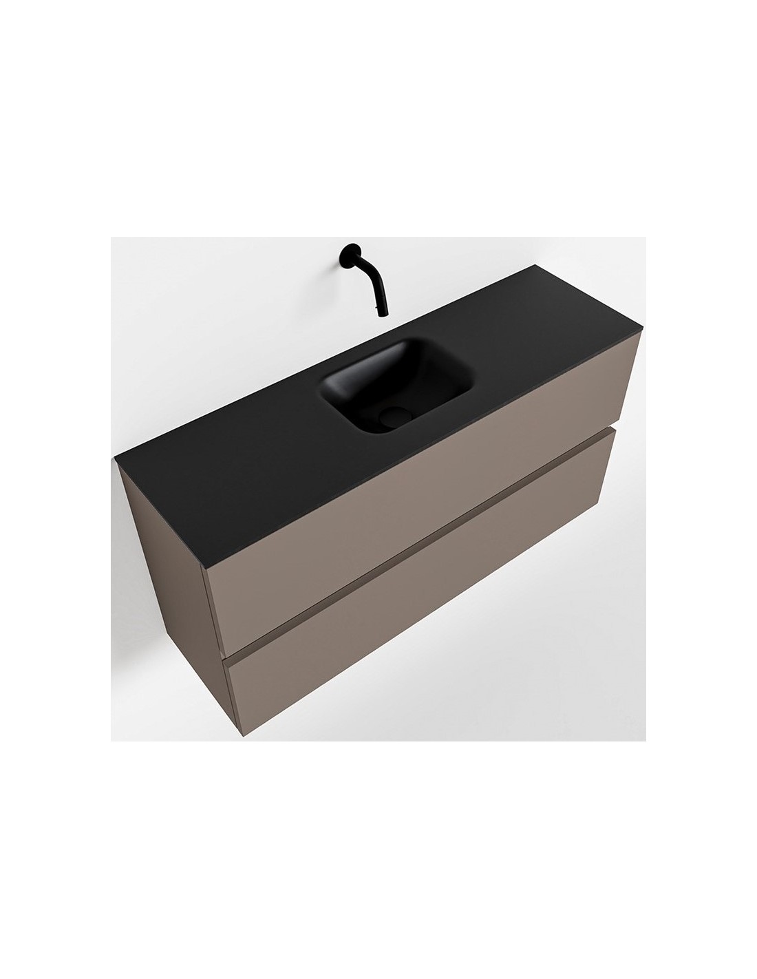 ADA Komplet badmiljø med centreret håndvask til vægmonteret armatur. Badmiljøet kommer med 2 skuffer med fuldt udtræk, og er fremstillet i MDF. Håndvasken er fremstillet i sort solid surface. Badmiljøet måler 100 x 50 cm i bredde og højde. Det viste armatur medfølger ikke i sættet.