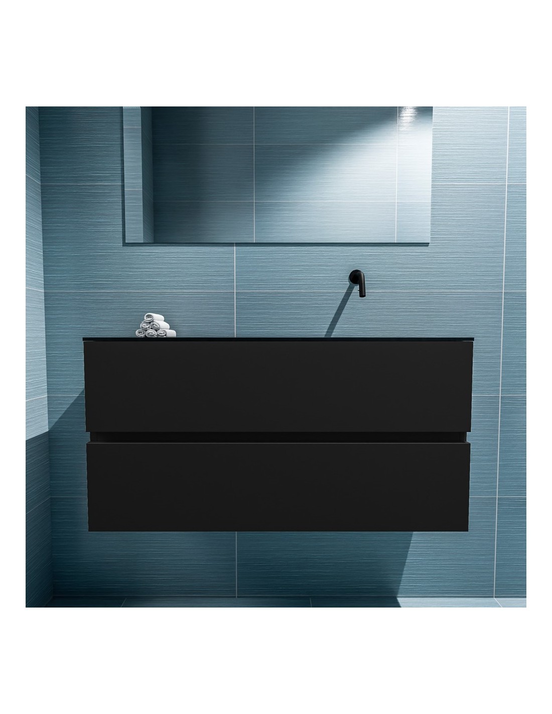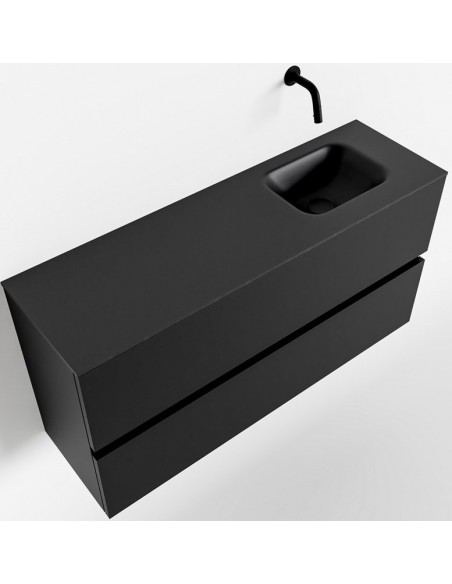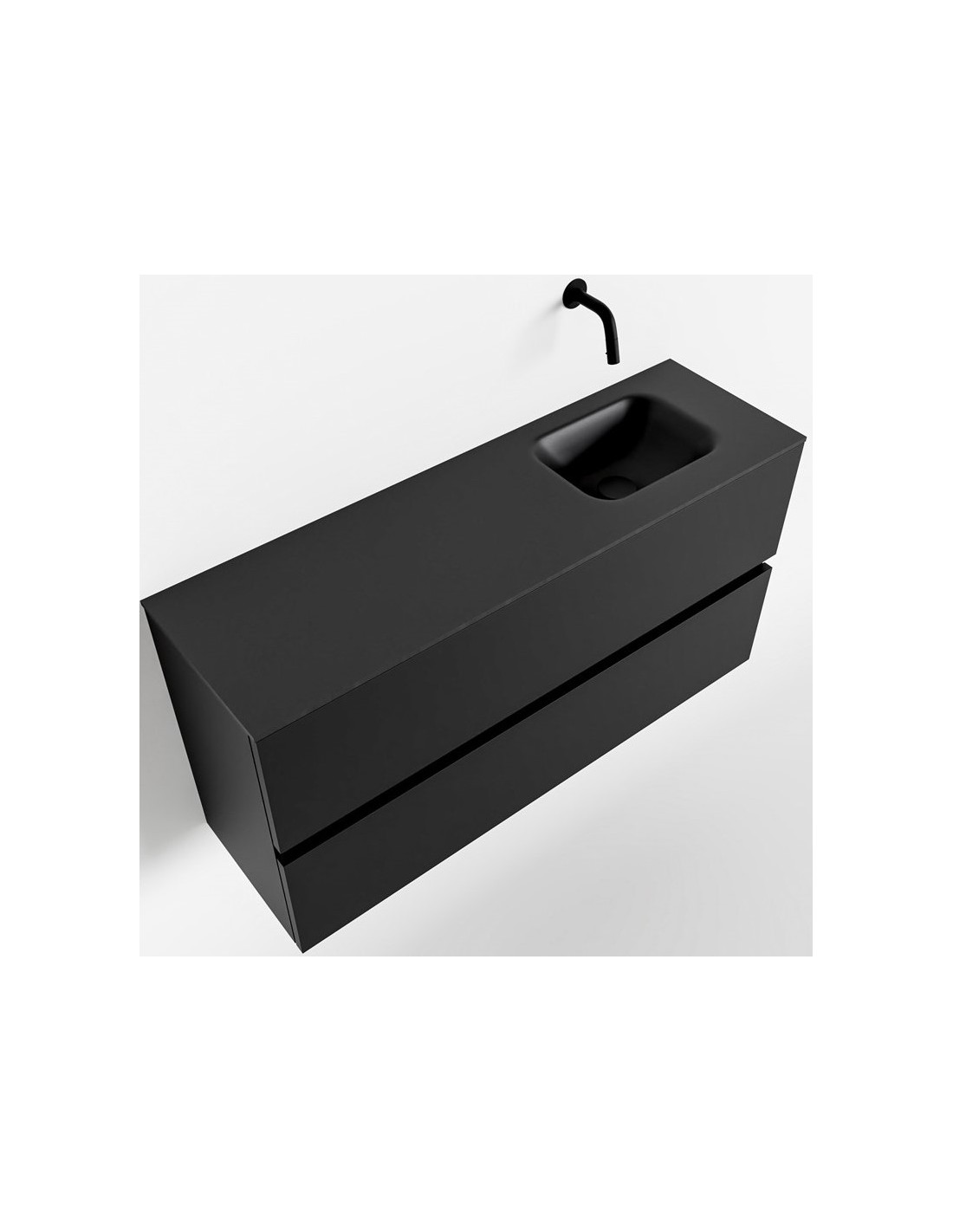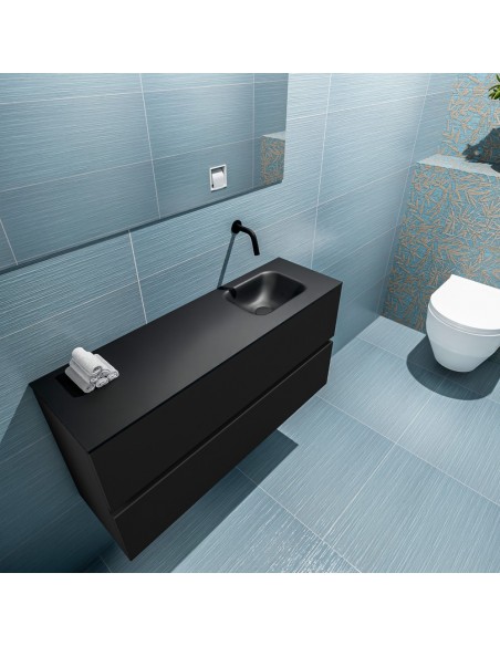 ADA Komplet badmiljø med højrevendt håndvask til vægmonteret armatur. Badmiljøet kommer med 2 skuffer med fuldt udtræk, og er fremstillet i MDF. Håndvasken er fremstillet i sort solid surface. Badmiljøet måler 100 x 50 cm i bredde og højde. Det viste armatur medfølger ikke i sættet.
