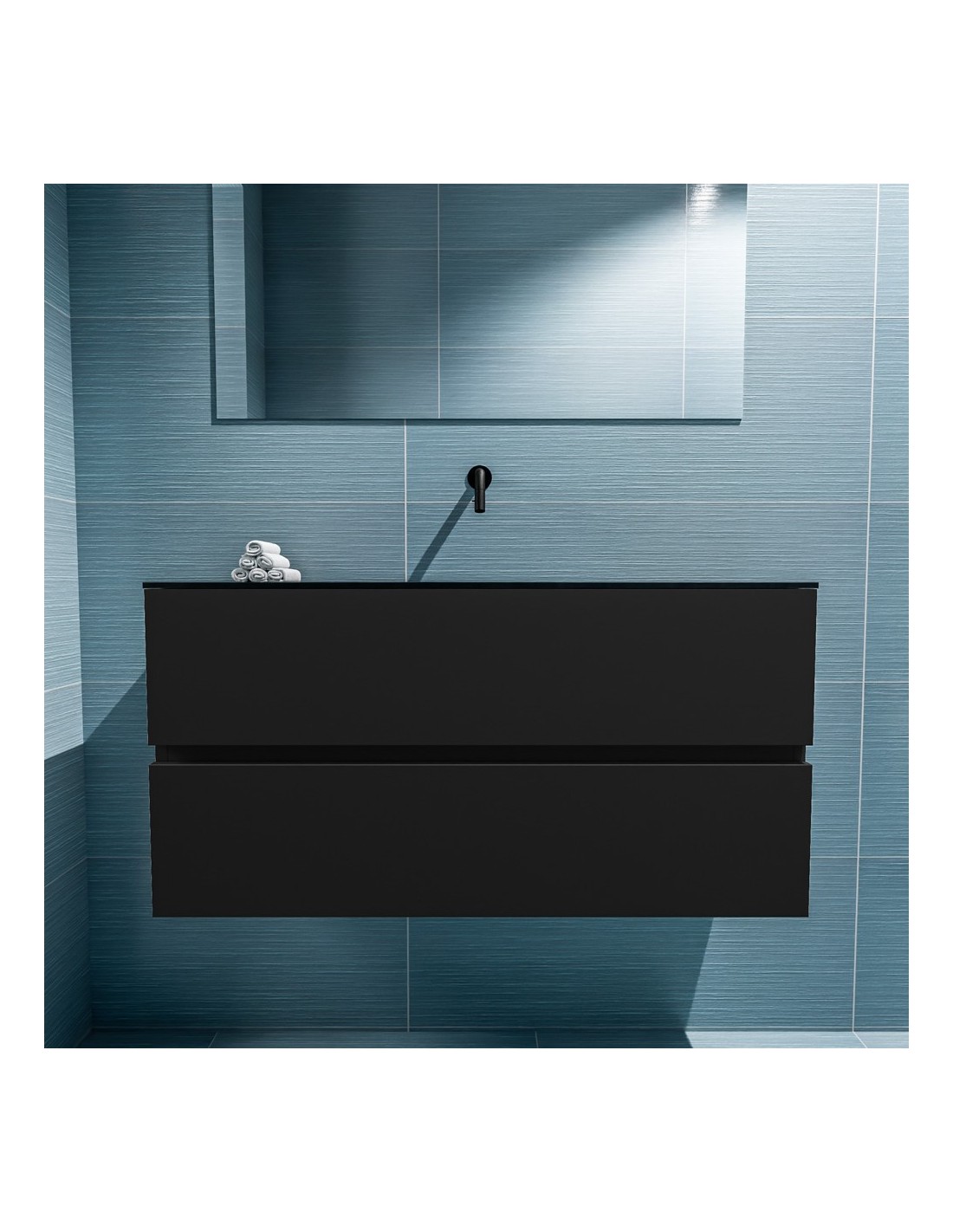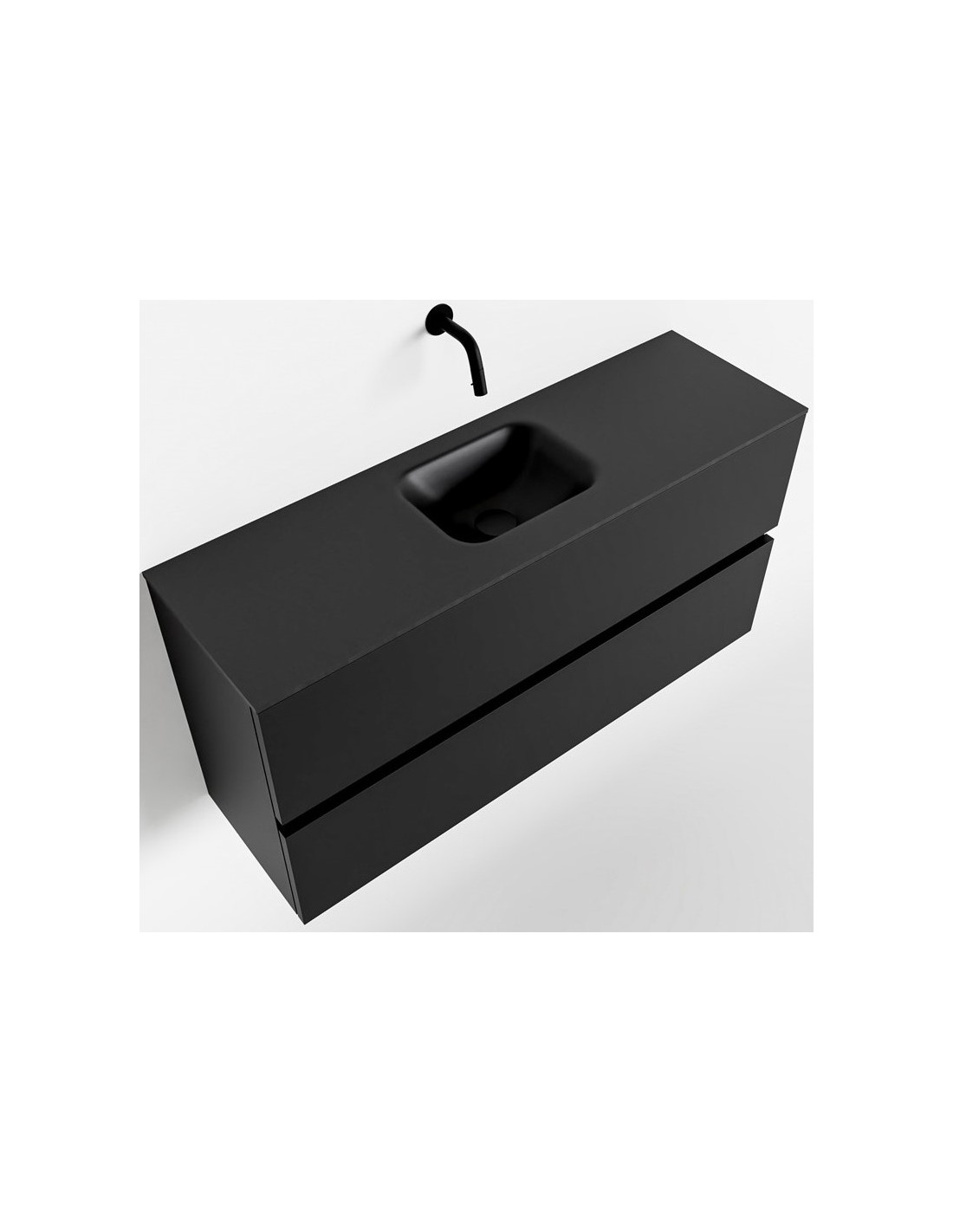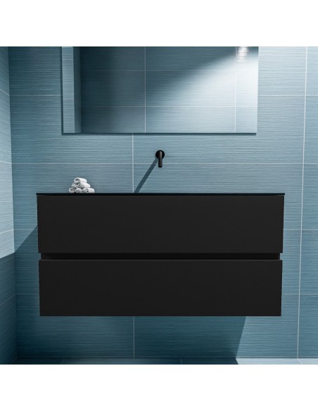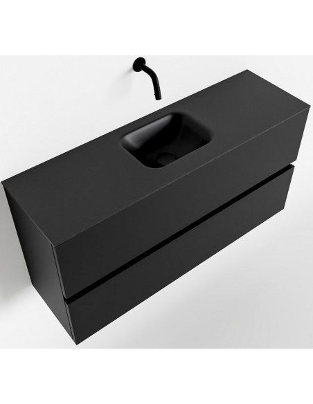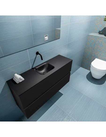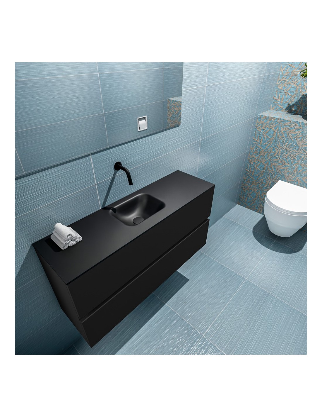 ADA Komplet badmiljø med centreret håndvask til vægmonteret armatur. Badmiljøet kommer med 2 skuffer med fuldt udtræk, og er fremstillet i MDF. Håndvasken er fremstillet i sort solid surface. Badmiljøet måler 100 x 50 cm i bredde og højde. Det viste armatur medfølger ikke i sættet.
