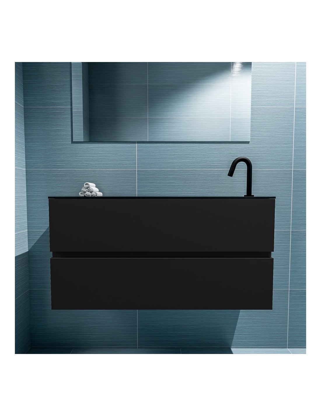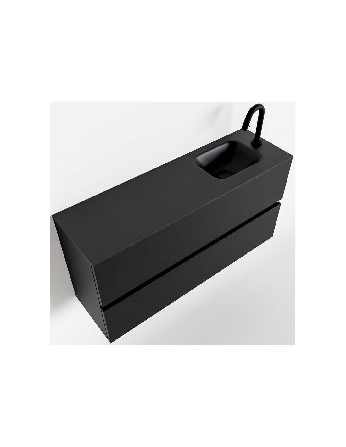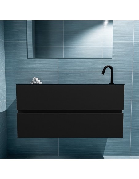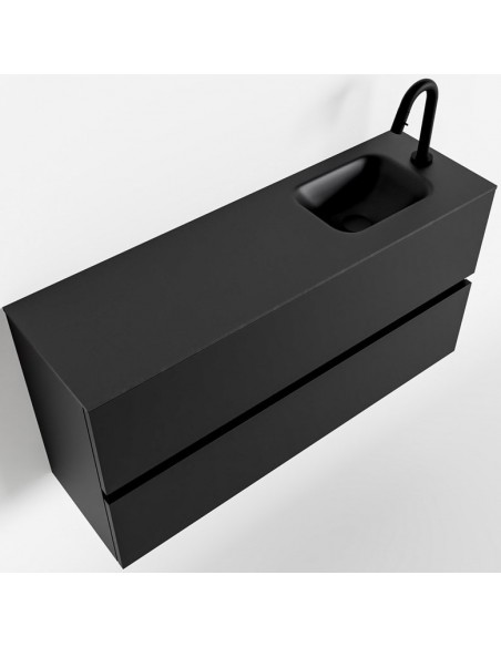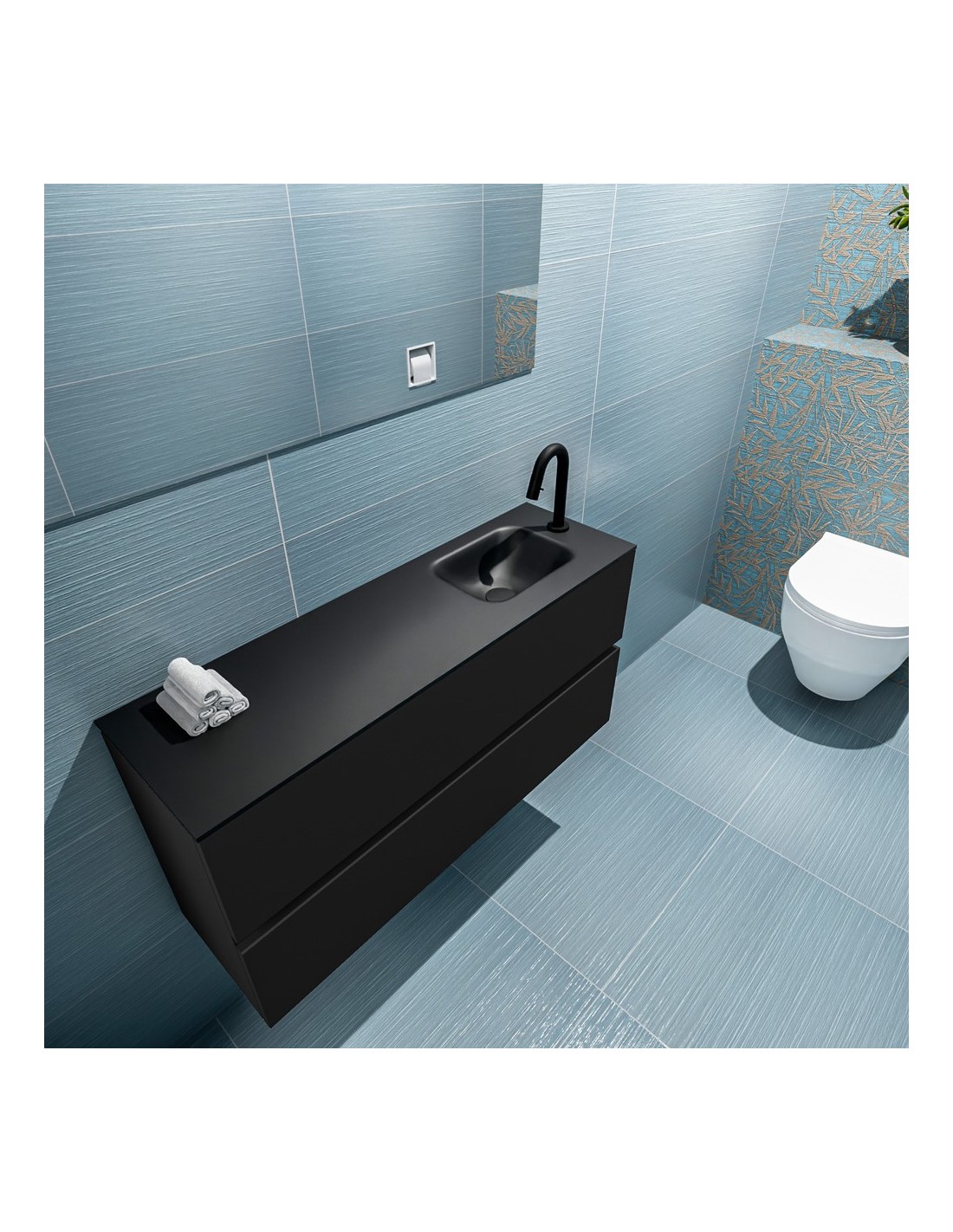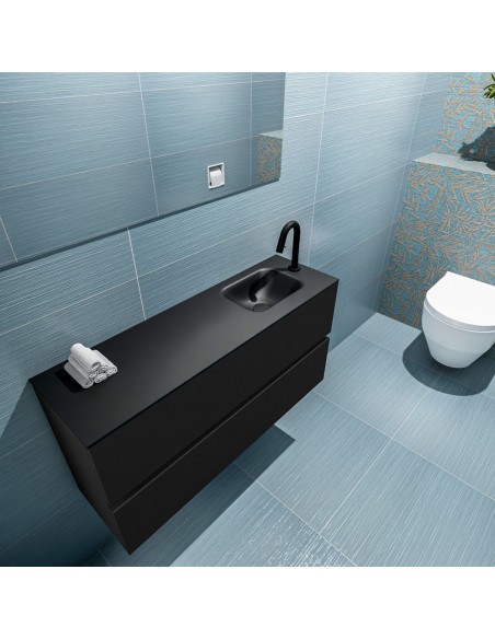 ADA Komplet badmiljø med højrevendt håndvask til bordmonteret armatur. Badmiljøet kommer med 2 skuffer med fuldt udtræk, og er fremstillet i MDF. Håndvasken er fremstillet i sort solid surface. Badmiljøet måler 100 x 50 cm i bredde og højde. Det viste armatur medfølger ikke i sættet.