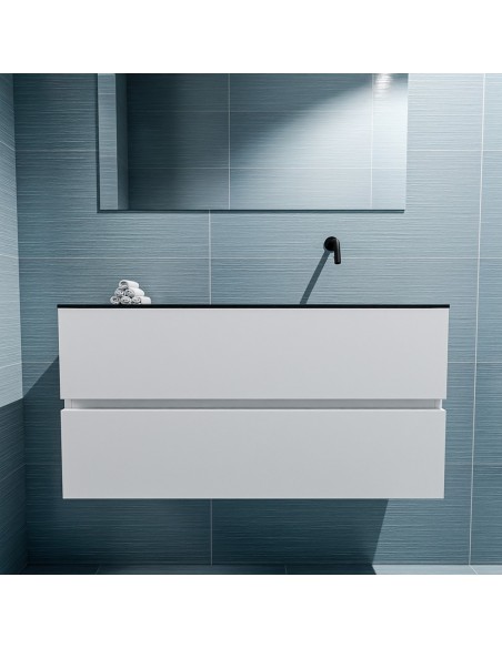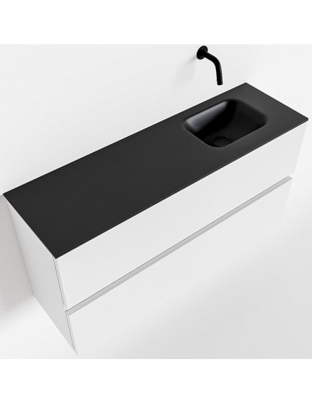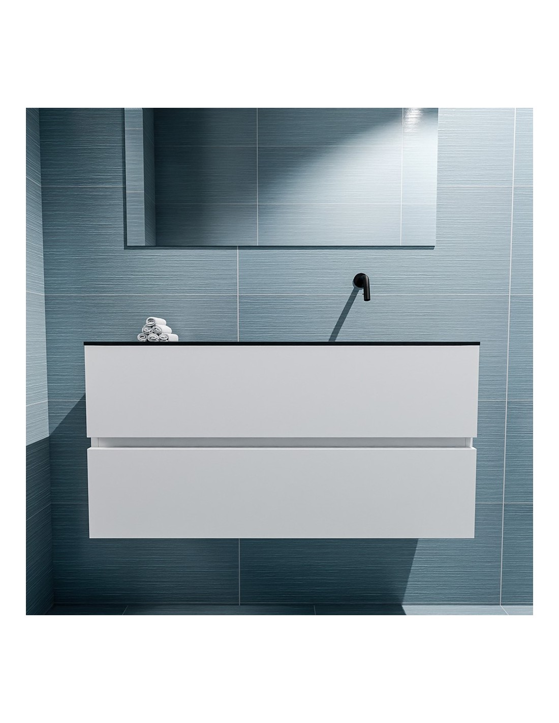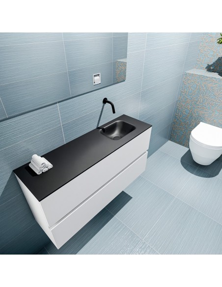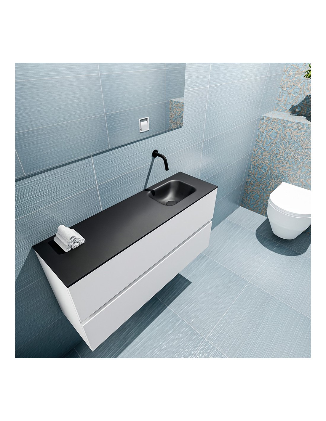 ADA Komplet badmiljø med højrevendt håndvask til vægmonteret armatur. Badmiljøet kommer med 2 skuffer med fuldt udtræk, og er fremstillet i MDF. Håndvasken er fremstillet i sort solid surface. Badmiljøet måler 100 x 50 cm i bredde og højde. Det viste armatur medfølger ikke i sættet.