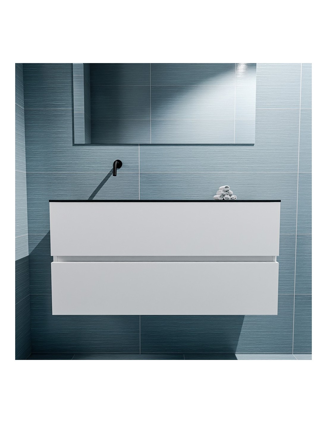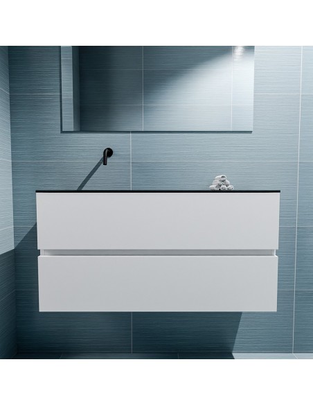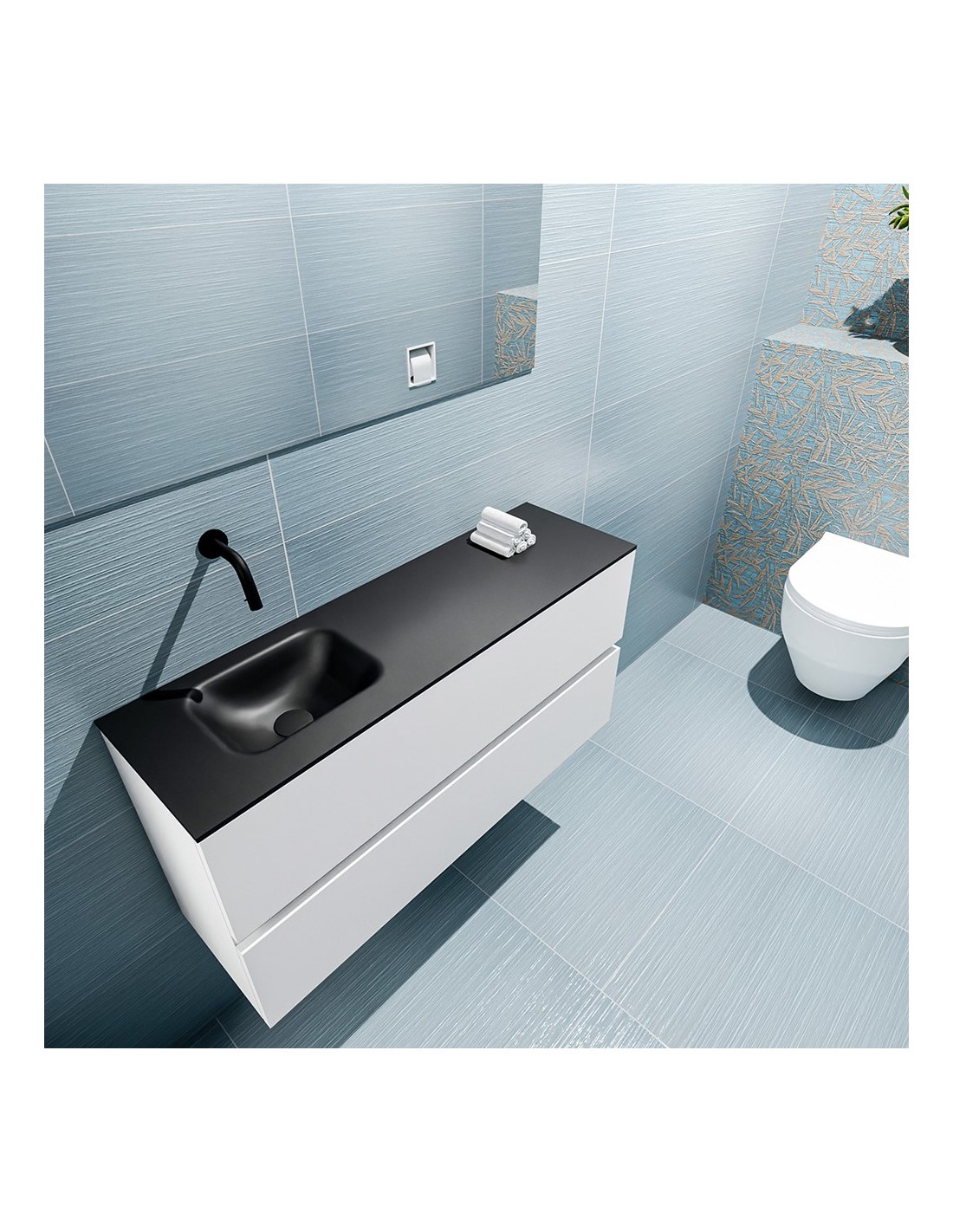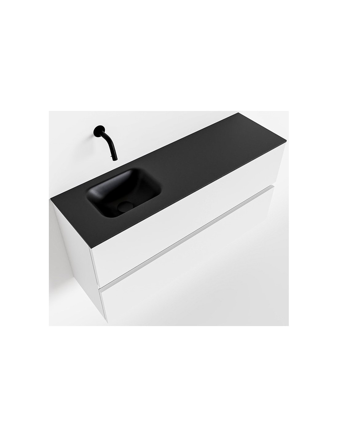 ADA Komplet badmiljø med venstrevendt håndvask til vægmonteret armatur. Badmiljøet kommer med 2 skuffer med fuldt udtræk, og er fremstillet i MDF. Håndvasken er fremstillet i sort solid surface. Badmiljøet måler 100 x 50 cm i bredde og højde. Det viste armatur medfølger ikke i sættet.