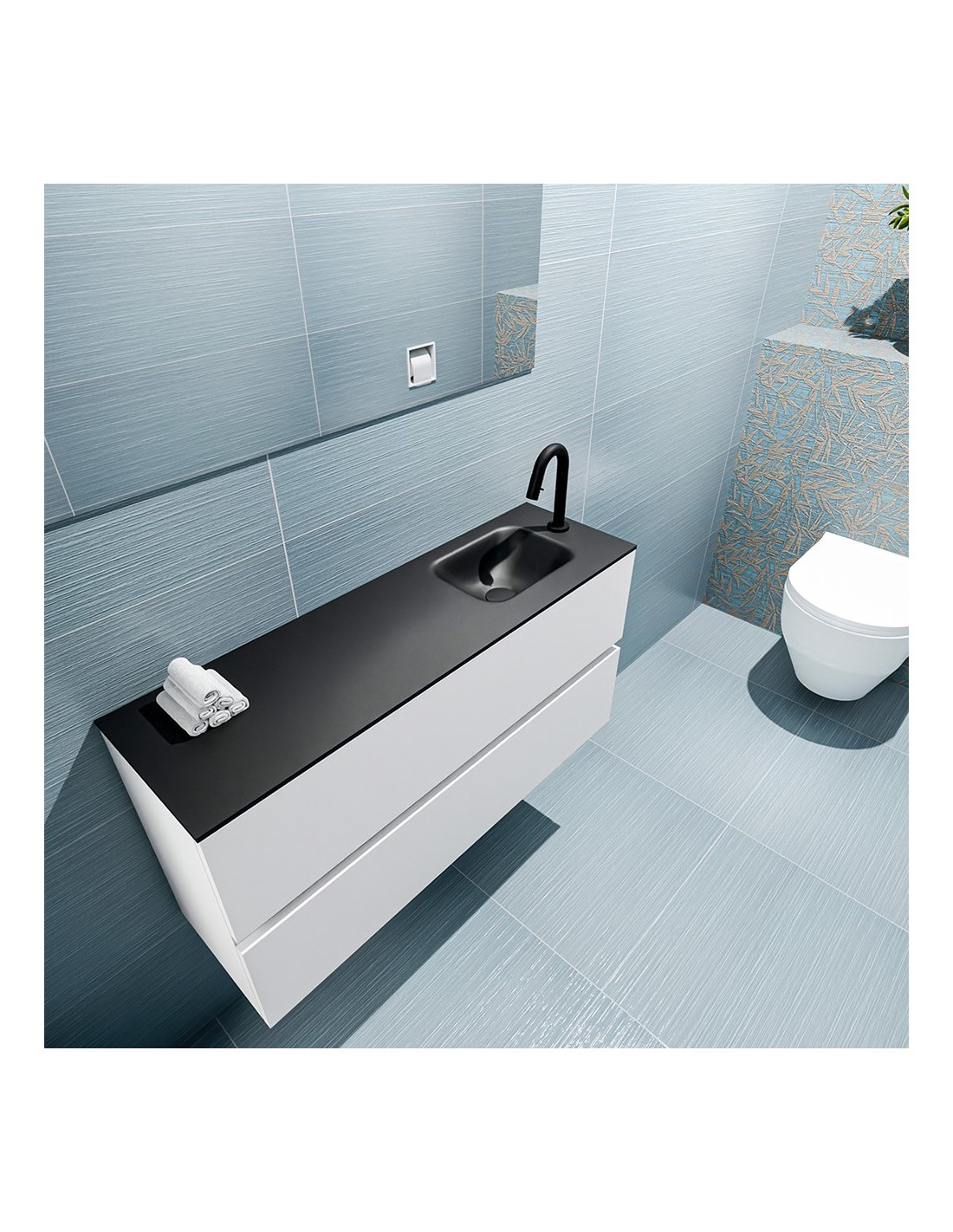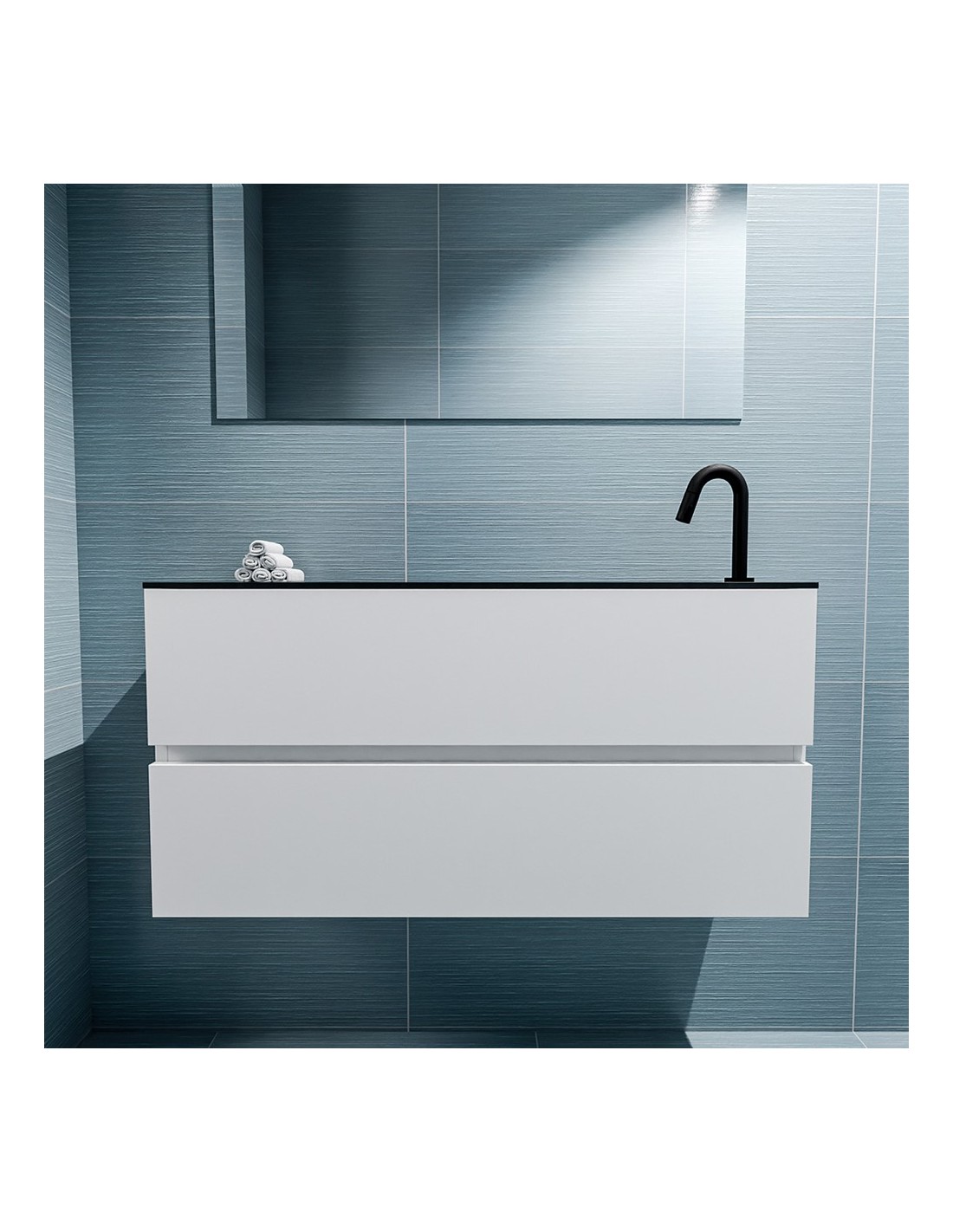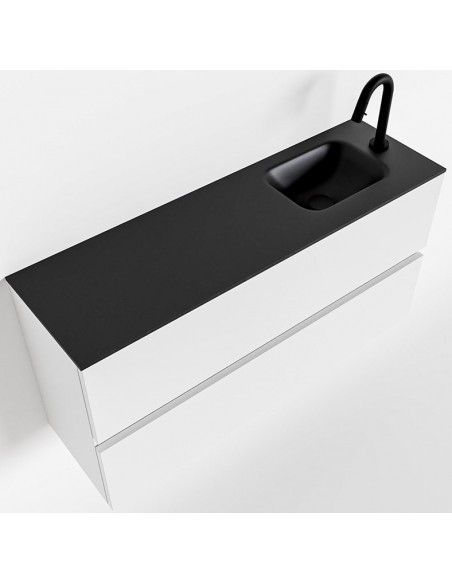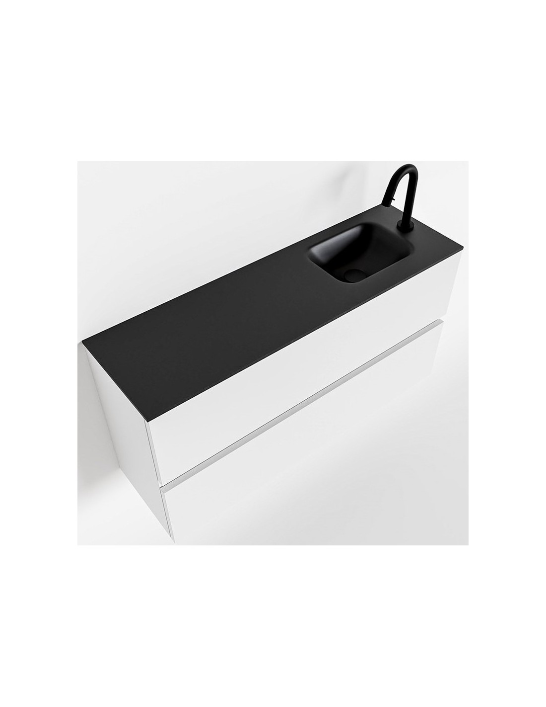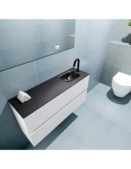 ADA Komplet badmiljø med højrevendt håndvask til bordmonteret armatur. Badmiljøet kommer med 2 skuffer med fuldt udtræk, og er fremstillet i MDF. Håndvasken er fremstillet i sort solid surface. Badmiljøet måler 100 x 50 cm i bredde og højde. Det viste armatur medfølger ikke i sættet.