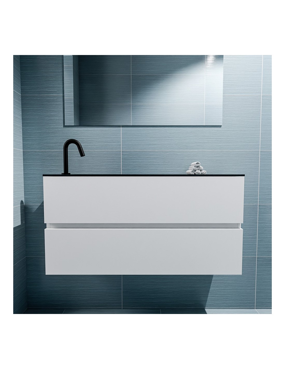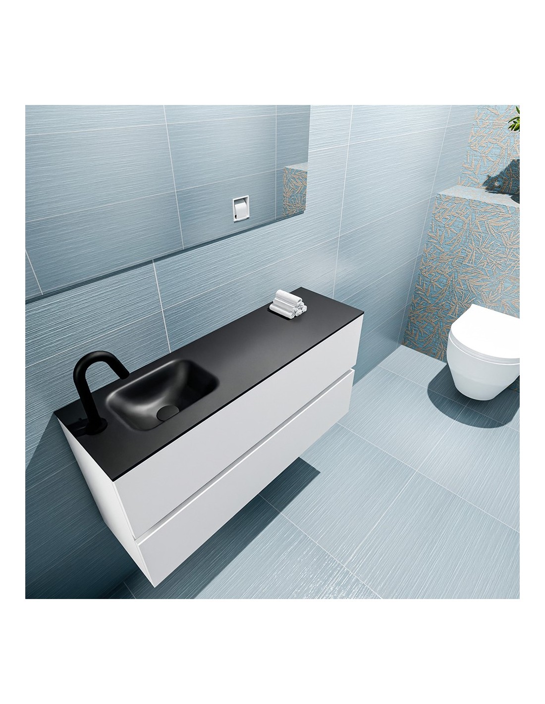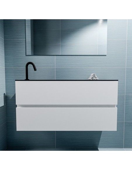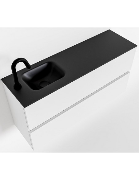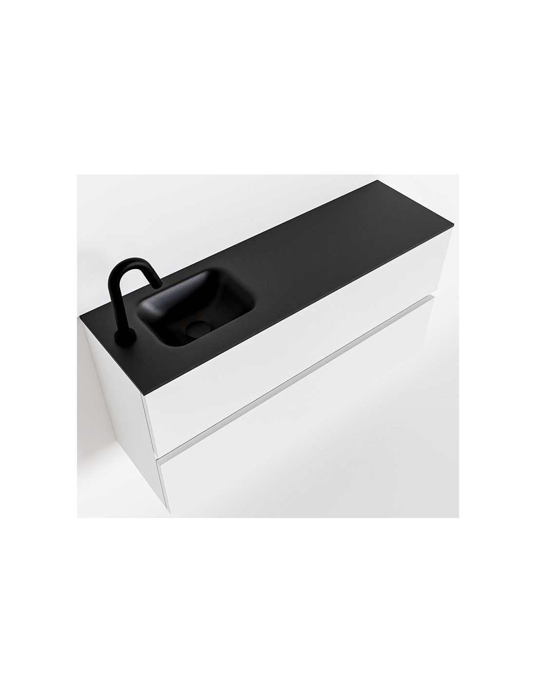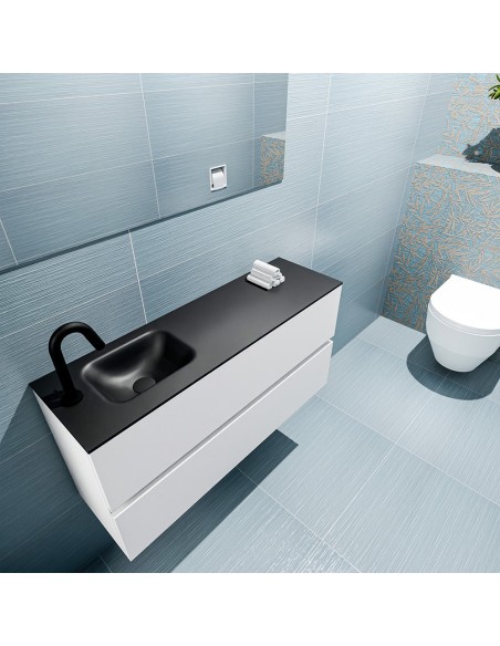 ADA Komplet badmiljø med venstrevendt håndvask til bordmonteret armatur. Badmiljøet kommer med 2 skuffer med fuldt udtræk, og er fremstillet i MDF. Håndvasken er fremstillet i sort solid surface. Badmiljøet måler 100 x 50 cm i bredde og højde. Det viste armatur medfølger ikke i sættet.