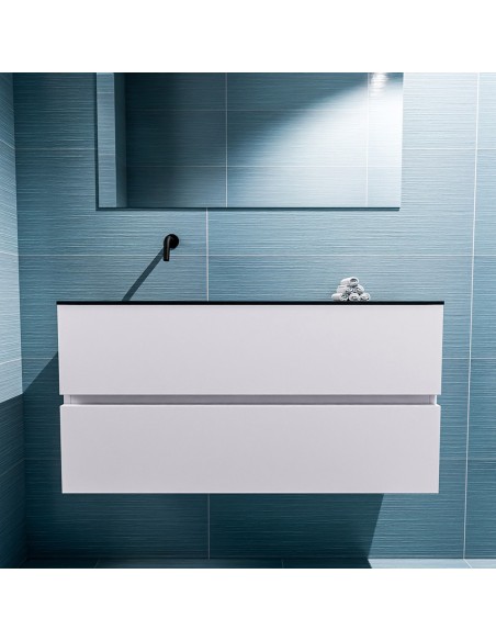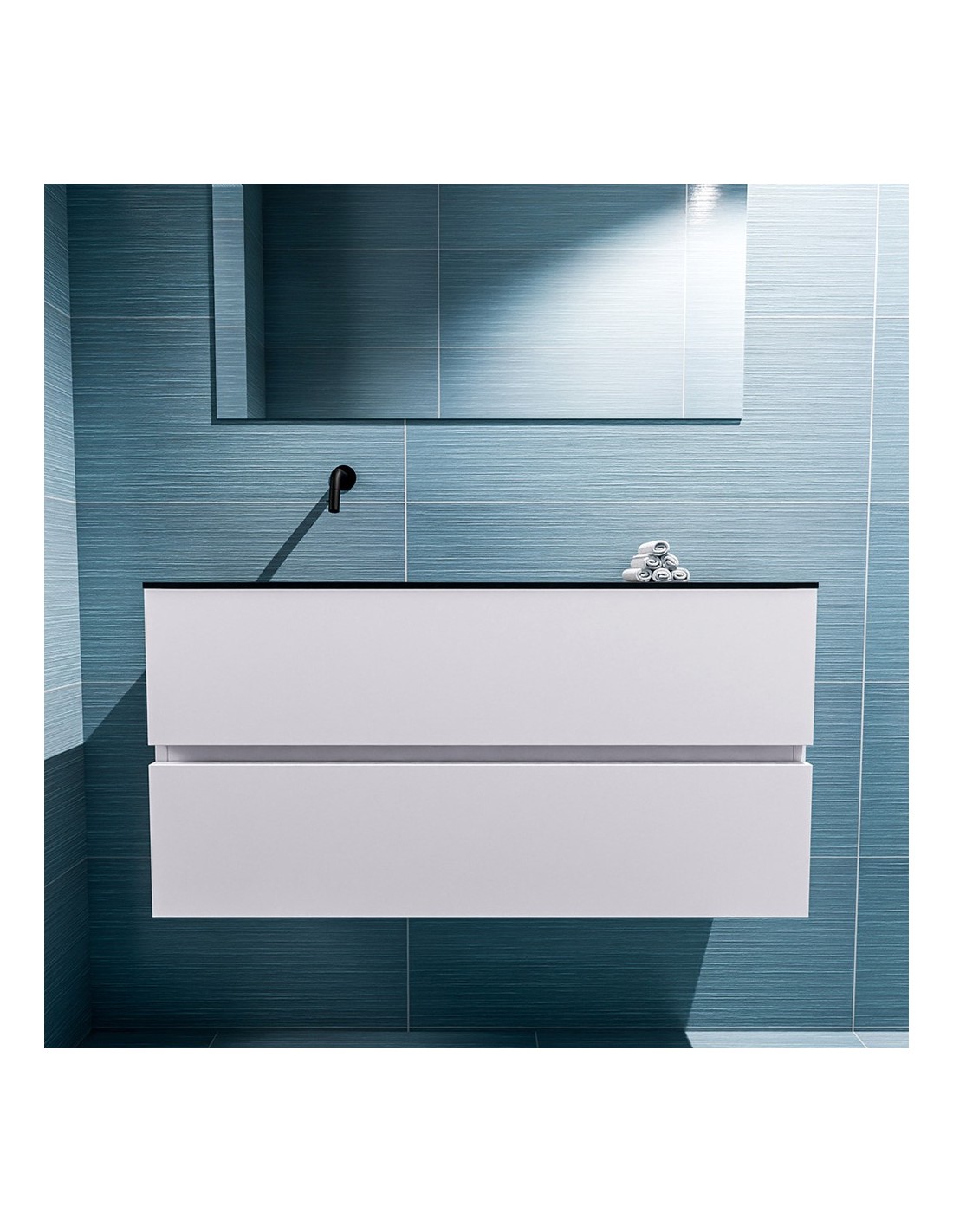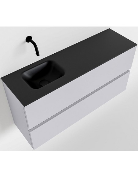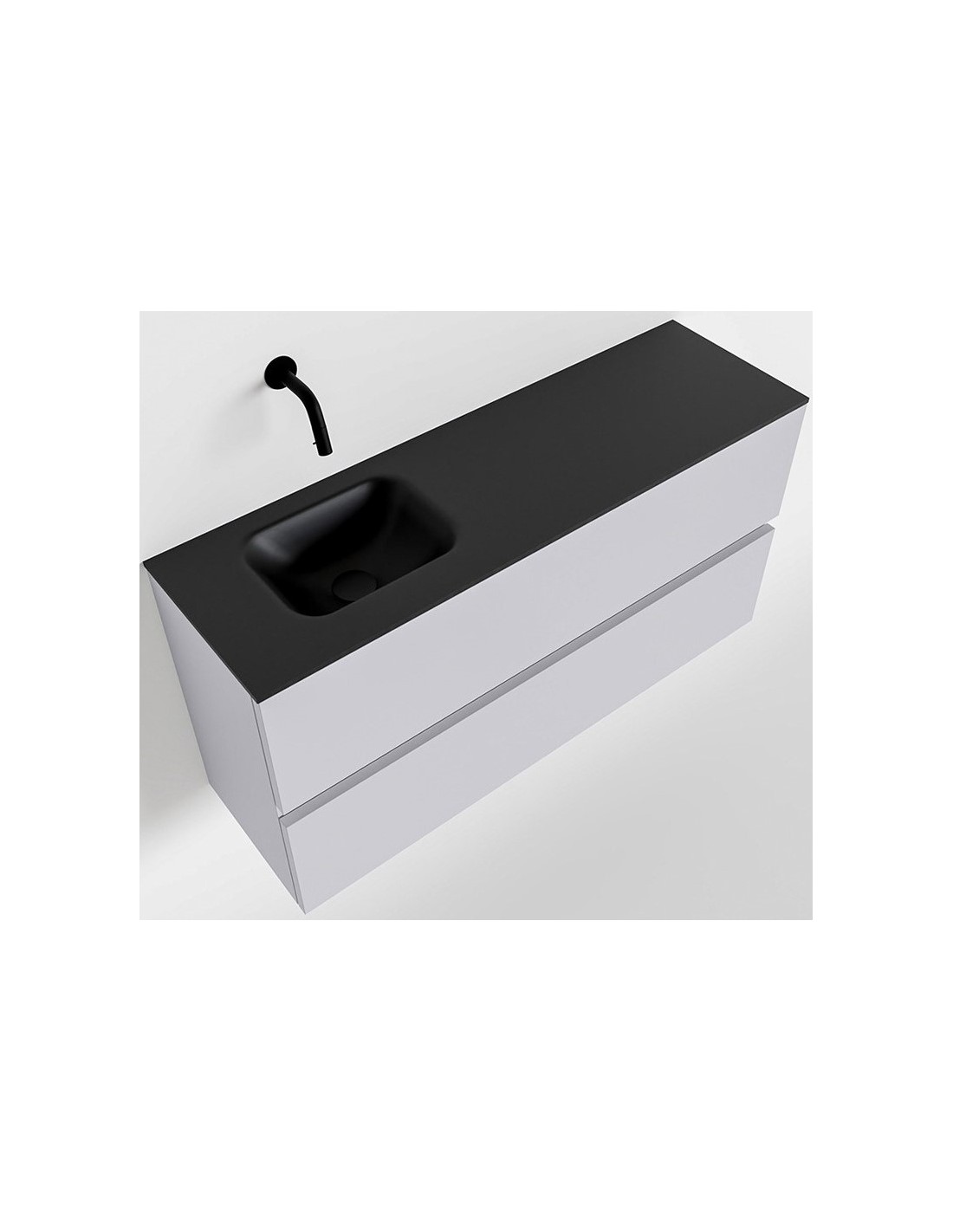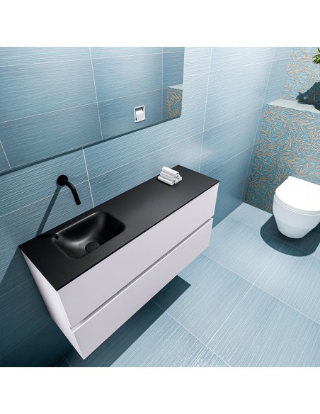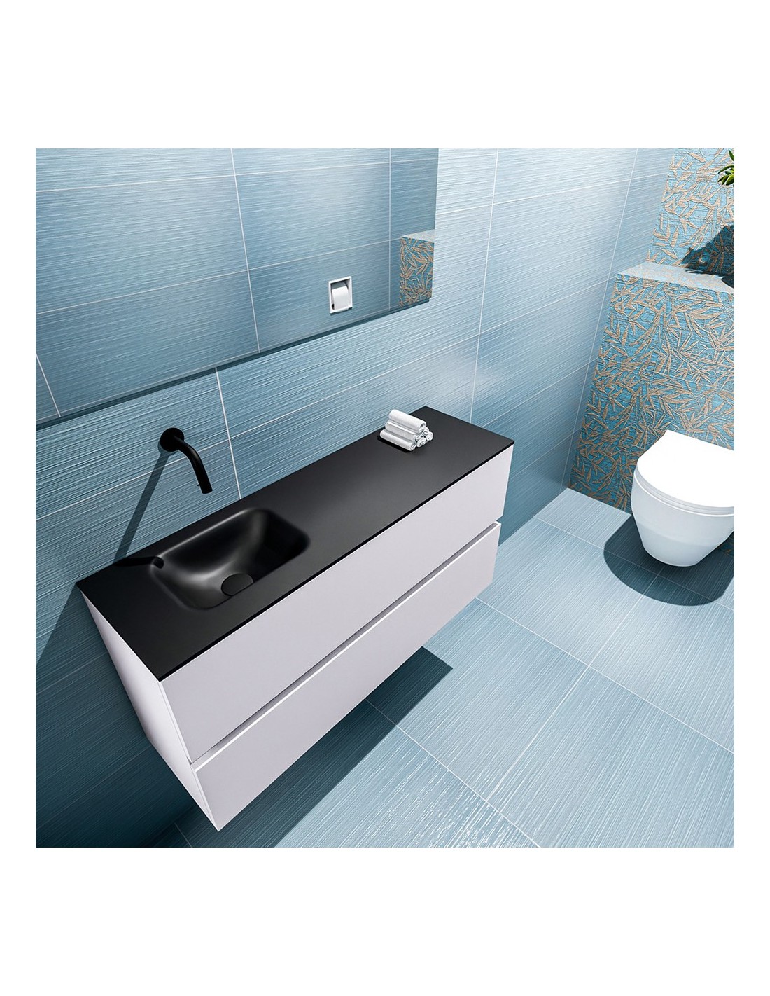 ADA Komplet badmiljø med venstrevendt håndvask til vægmonteret armatur. Badmiljøet kommer med 2 skuffer med fuldt udtræk, og er fremstillet i MDF. Håndvasken er fremstillet i sort solid surface. Badmiljøet måler 100 x 50 cm i bredde og højde. Det viste armatur medfølger ikke i sættet.