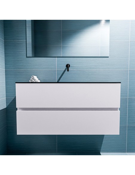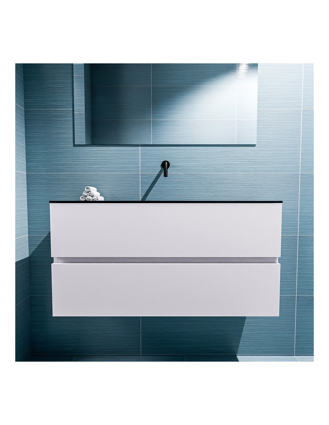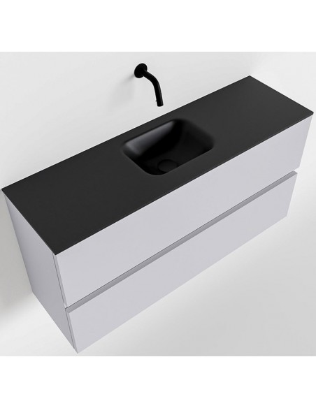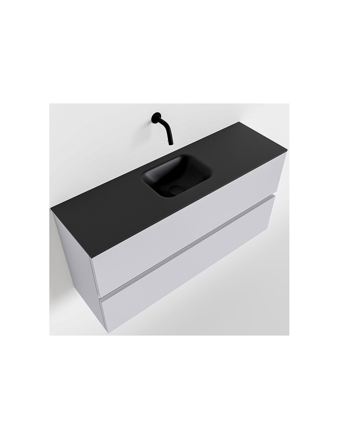 ADA Komplet badmiljø med centreret håndvask til vægmonteret armatur. Badmiljøet kommer med 2 skuffer med fuldt udtræk, og er fremstillet i MDF. Håndvasken er fremstillet i sort solid surface. Badmiljøet måler 100 x 50 cm i bredde og højde. Det viste armatur medfølger ikke i sættet.