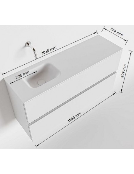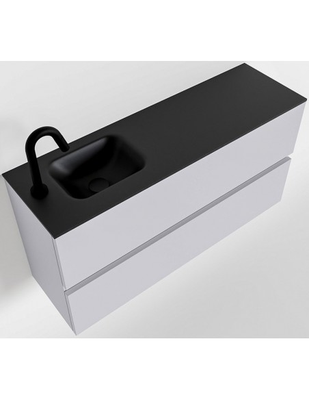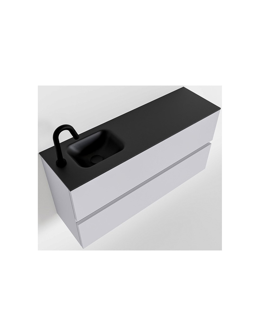 ADA Komplet badmiljø med venstrevendt håndvask til bordmonteret armatur. Badmiljøet kommer med 2 skuffer med fuldt udtræk, og er fremstillet i MDF. Håndvasken er fremstillet i sort solid surface. Badmiljøet måler 100 x 50 cm i bredde og højde. Det viste armatur medfølger ikke i sættet.