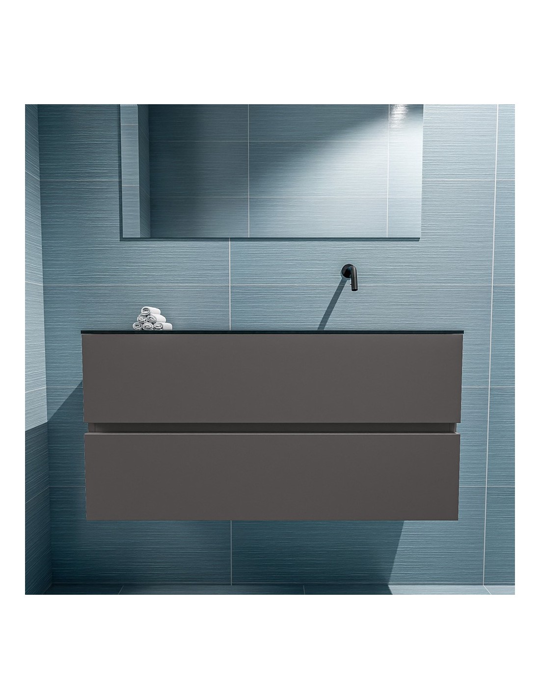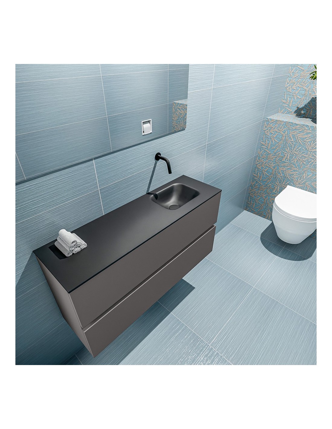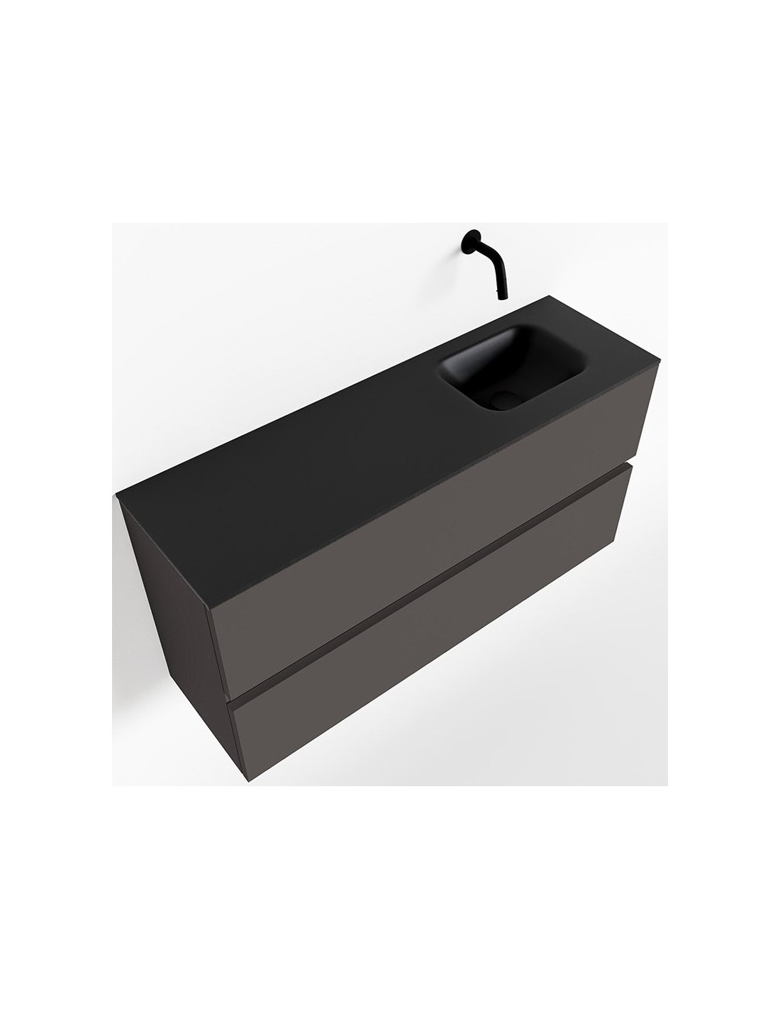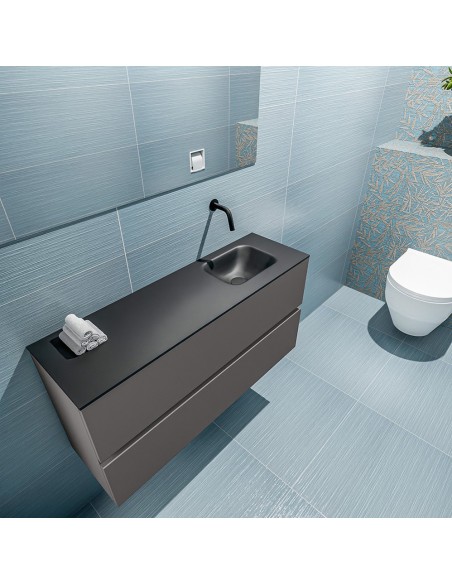 ADA Komplet badmiljø med højrevendt håndvask til vægmonteret armatur. Badmiljøet kommer med 2 skuffer med fuldt udtræk, og er fremstillet i MDF. Håndvasken er fremstillet i sort solid surface. Badmiljøet måler 100 x 50 cm i bredde og højde. Det viste armatur medfølger ikke i sættet.