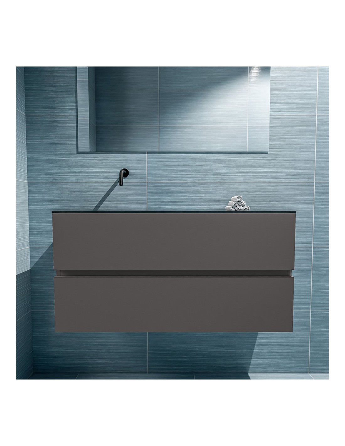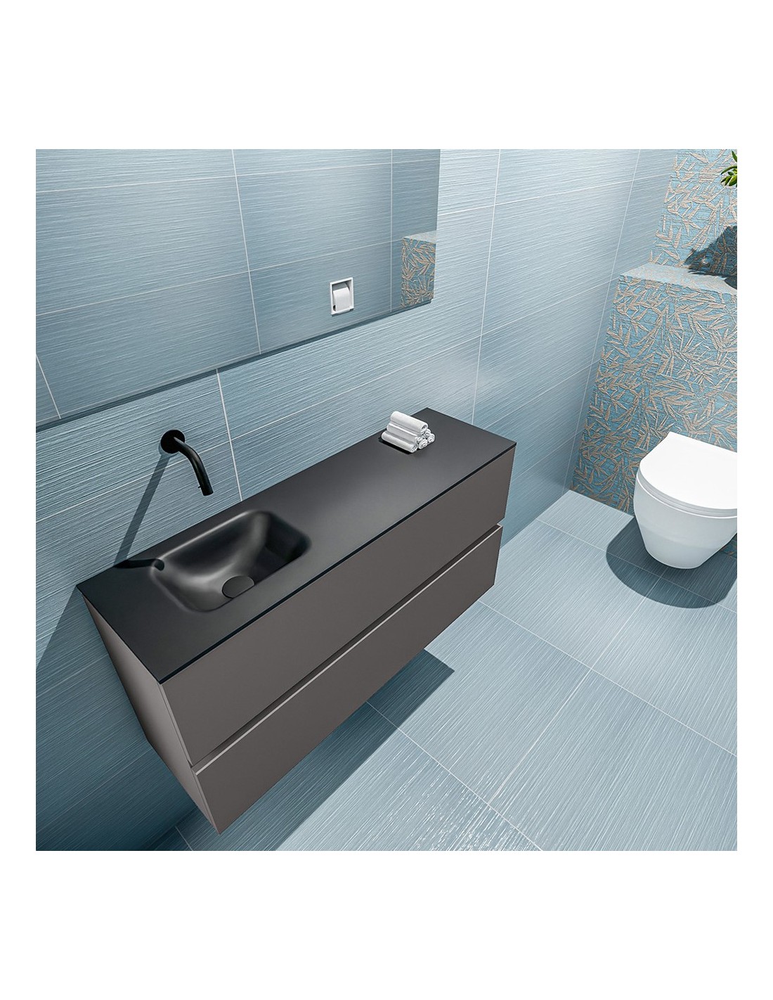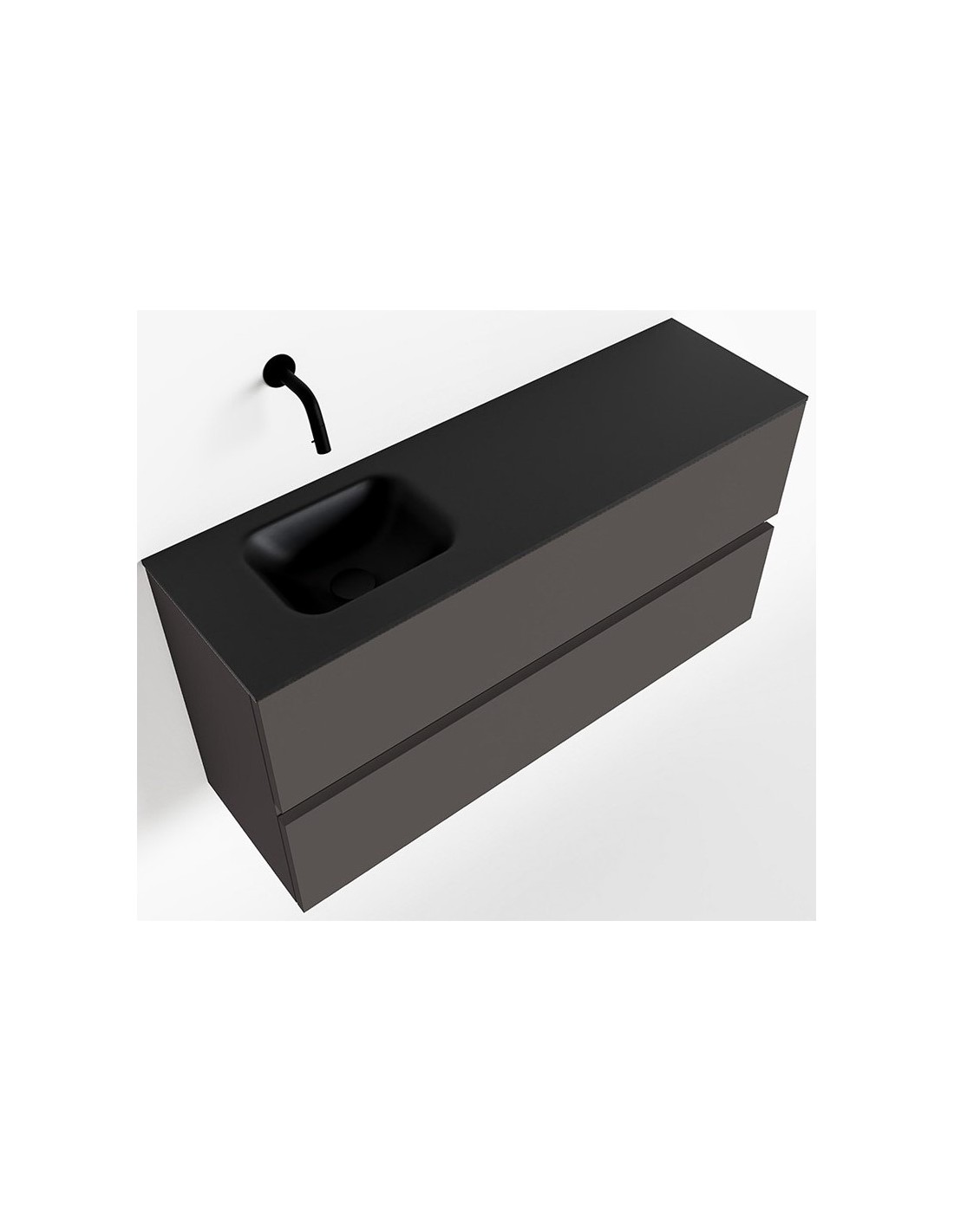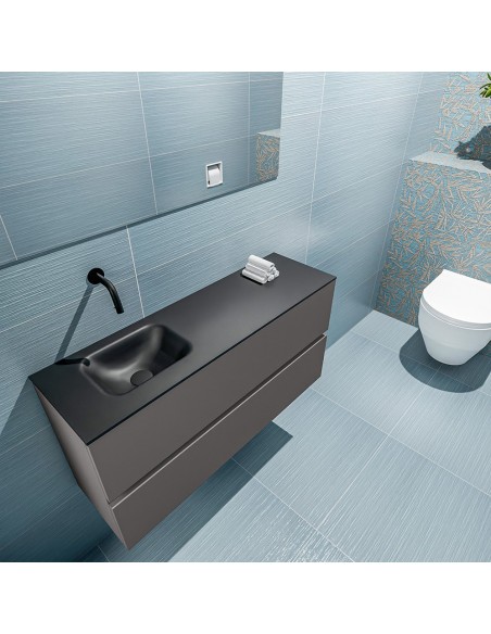 ADA Komplet badmiljø med venstrevendt håndvask til vægmonteret armatur. Badmiljøet kommer med 2 skuffer med fuldt udtræk, og er fremstillet i MDF. Håndvasken er fremstillet i sort solid surface. Badmiljøet måler 100 x 50 cm i bredde og højde. Det viste armatur medfølger ikke i sættet.