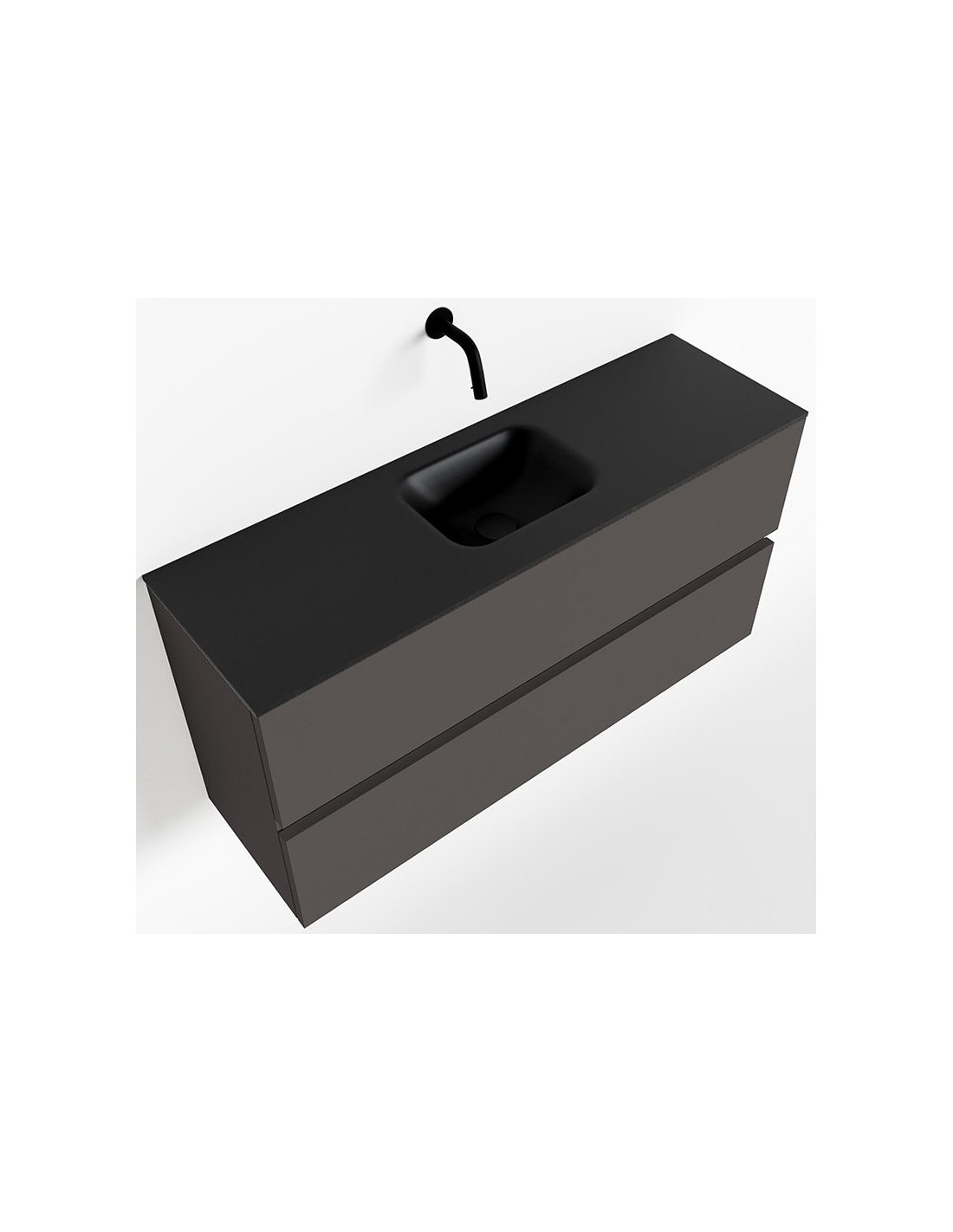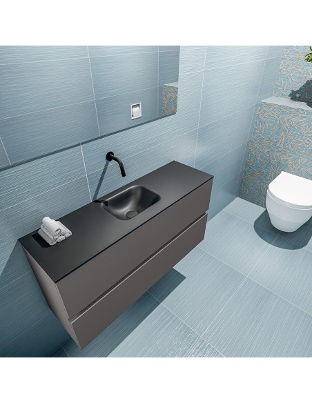 ADA Komplet badmiljø med centreret håndvask til vægmonteret armatur. Badmiljøet kommer med 2 skuffer med fuldt udtræk, og er fremstillet i MDF. Håndvasken er fremstillet i sort solid surface. Badmiljøet måler 100 x 50 cm i bredde og højde. Det viste armatur medfølger ikke i sættet.