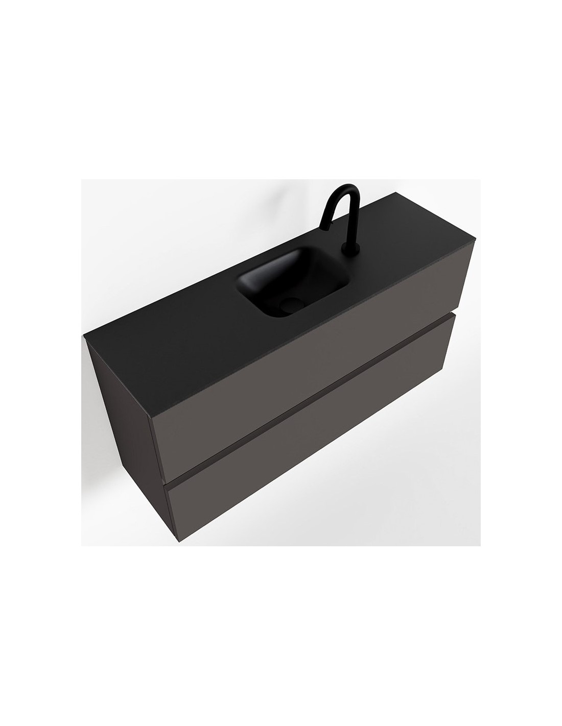 ADA Komplet badmiljø med centreret håndvask til bordmonteret armatur. Badmiljøet kommer med 2 skuffer med fuldt udtræk, og er fremstillet i MDF. Håndvasken er fremstillet i sort solid surface. Badmiljøet måler 100 x 50 cm i bredde og højde. Det viste armatur medfølger ikke i sættet.
