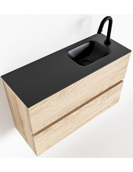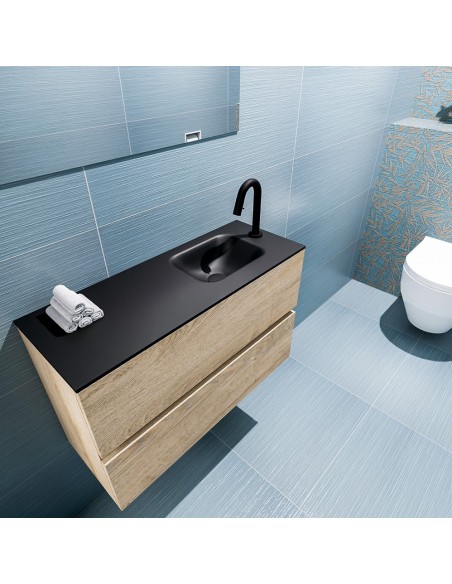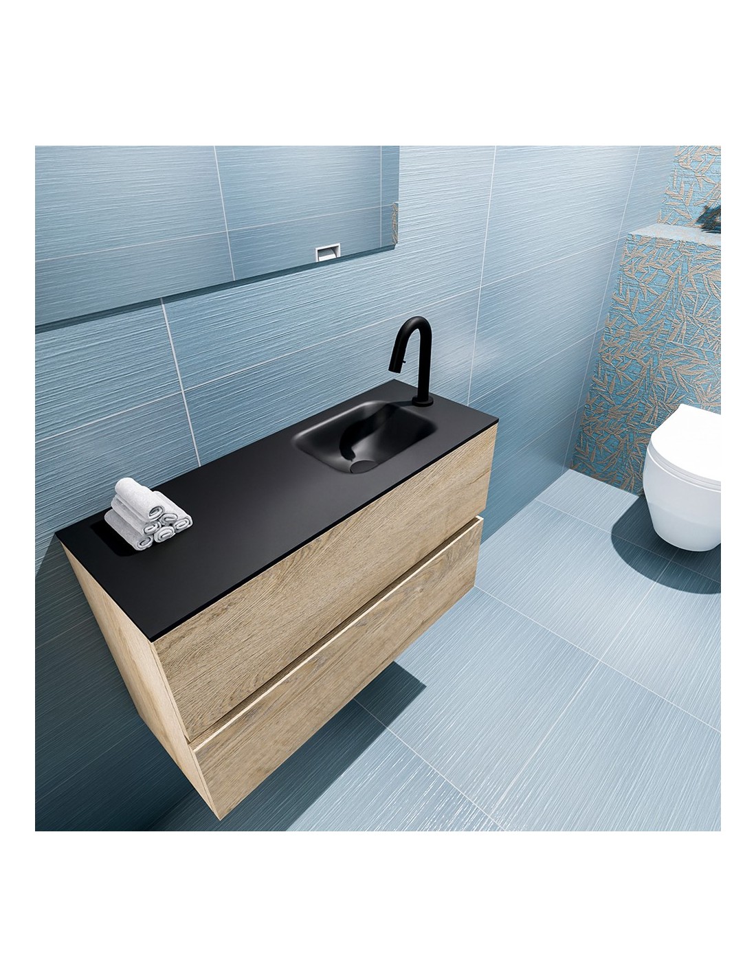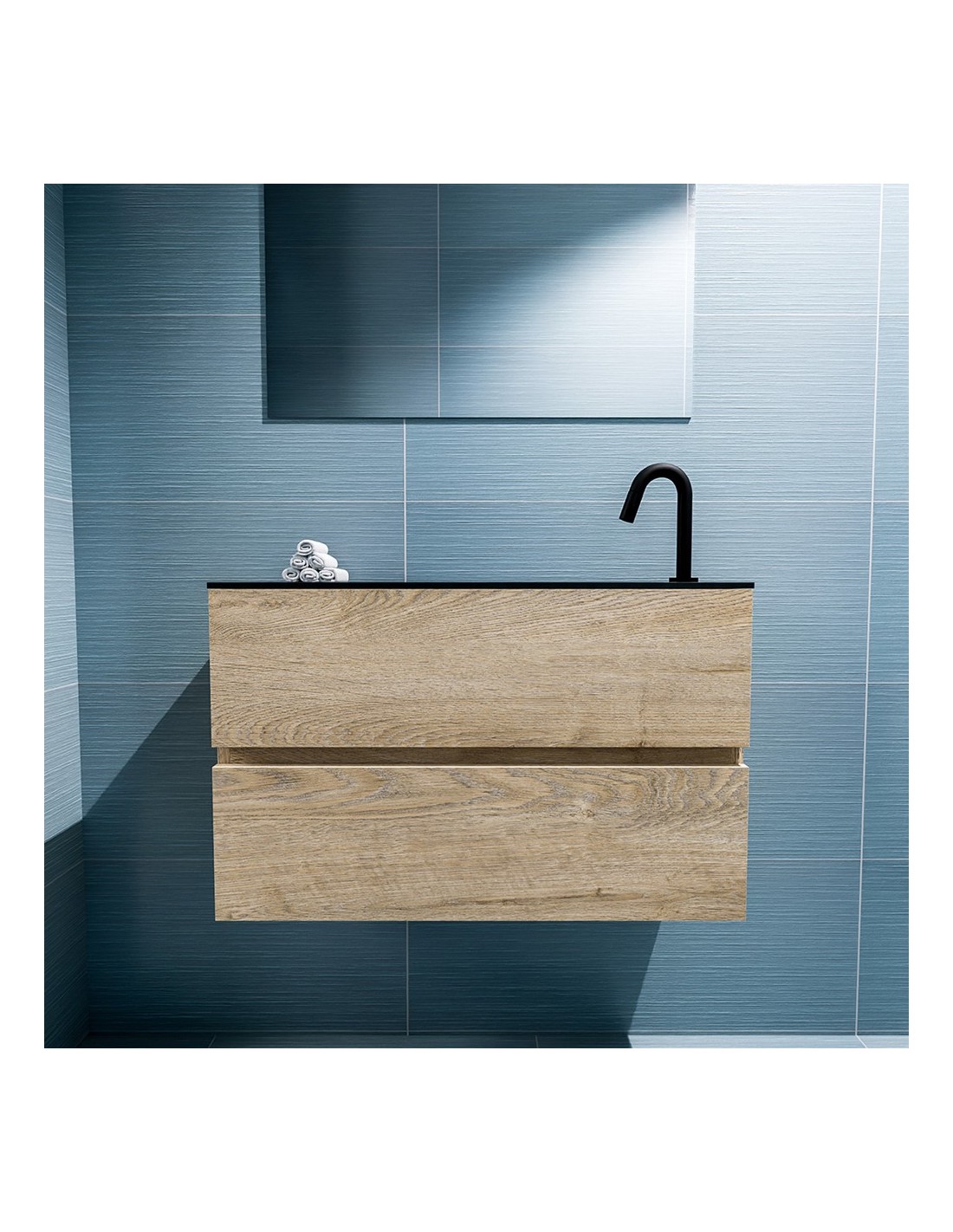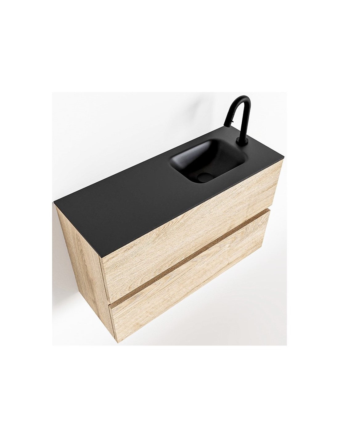 ADA Komplet badmiljø med højrevendt håndvask til bordmonteret armatur. Badmiljøet kommer med 2 skuffer med fuldt udtræk, og er fremstillet i MDF med design af vasket eg. Håndvasken er fremstillet i sort solid surface. Badmiljøet måler 80 x 50 cm i bredde og højde. Det viste armatur medfølger ikke i sættet.