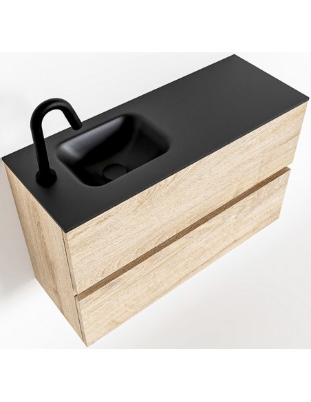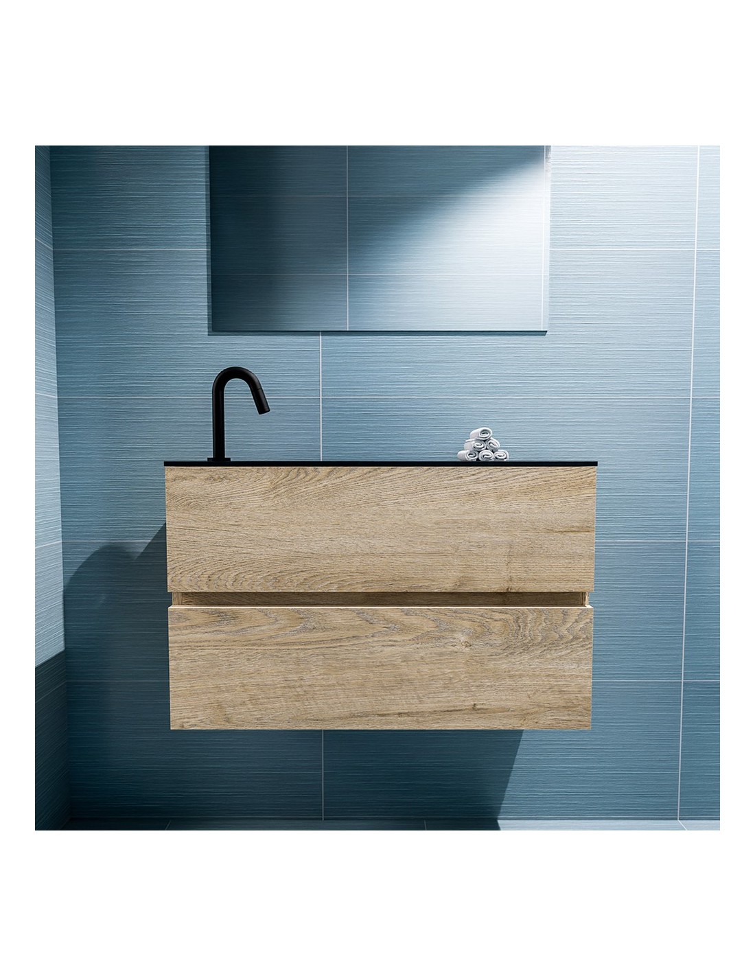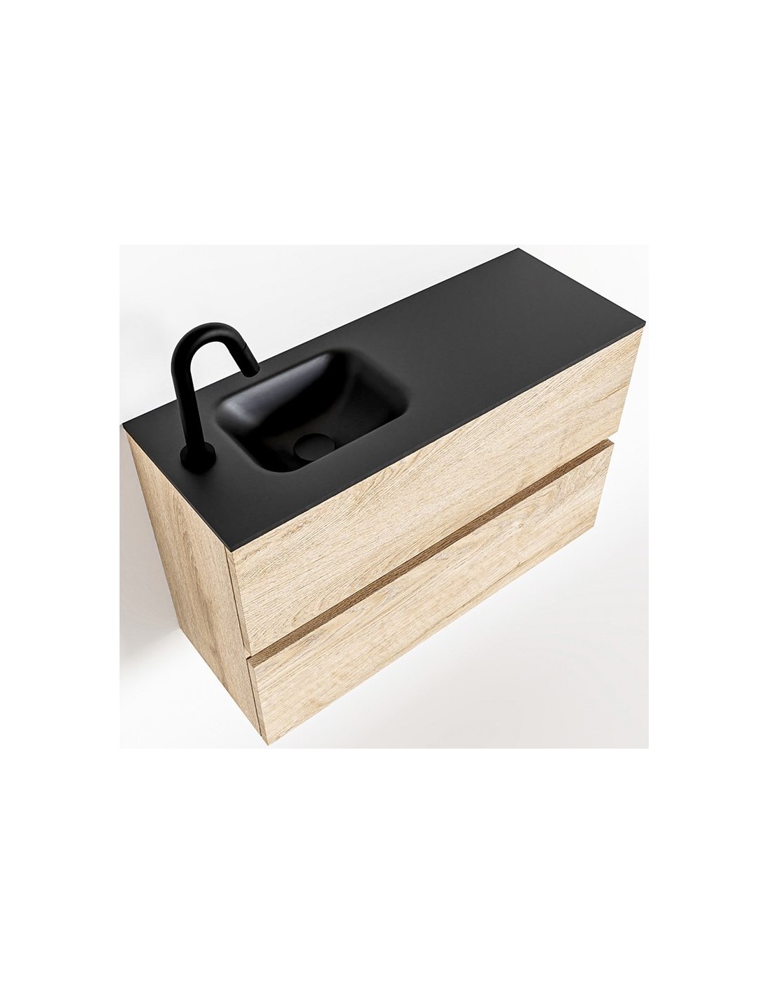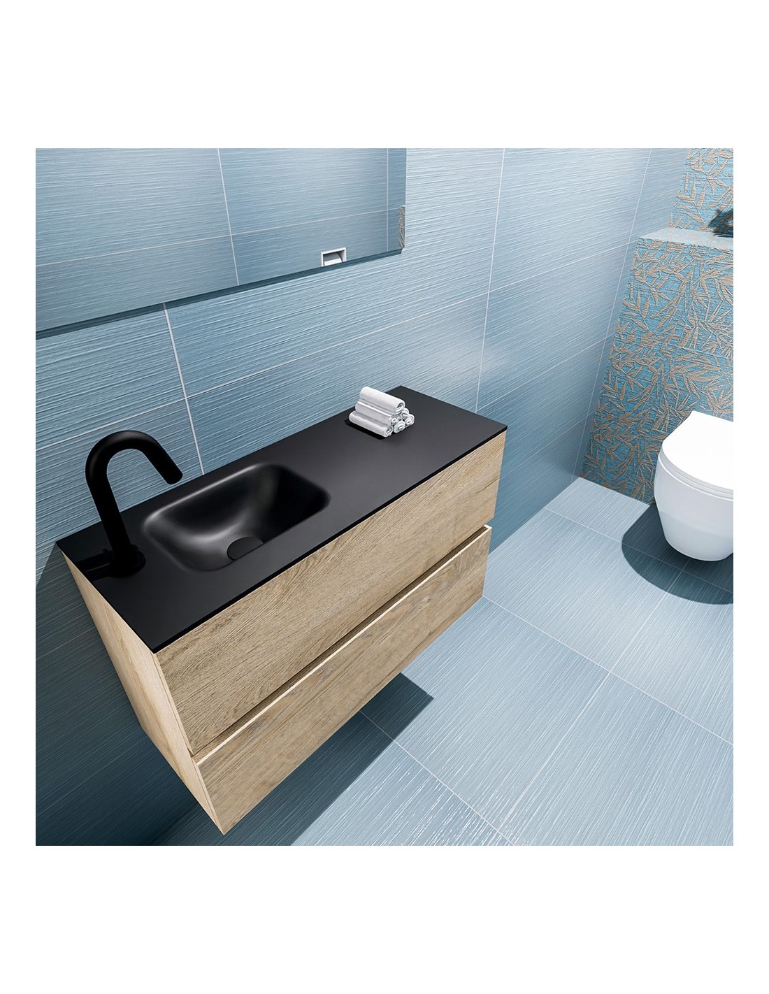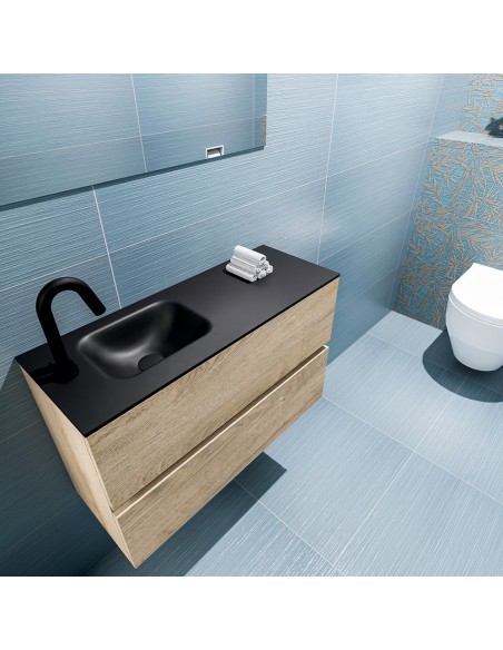 ADA Komplet badmiljø med venstrevendt håndvask til bordmonteret armatur. Badmiljøet kommer med 2 skuffer med fuldt udtræk, og er fremstillet i MDF med design af vasket eg. Håndvasken er fremstillet i sort solid surface. Badmiljøet måler 80 x 50 cm i bredde og højde. Det viste armatur medfølger ikke i sættet.