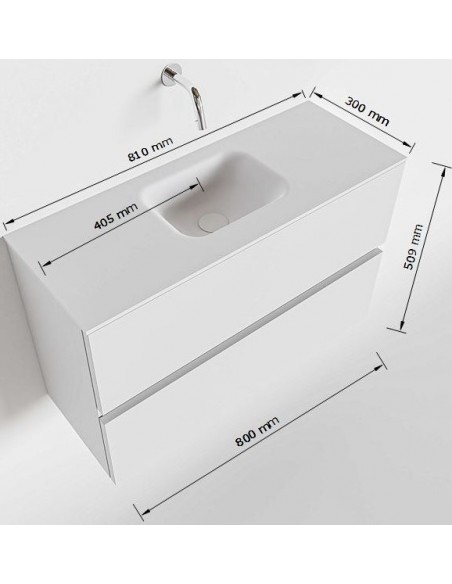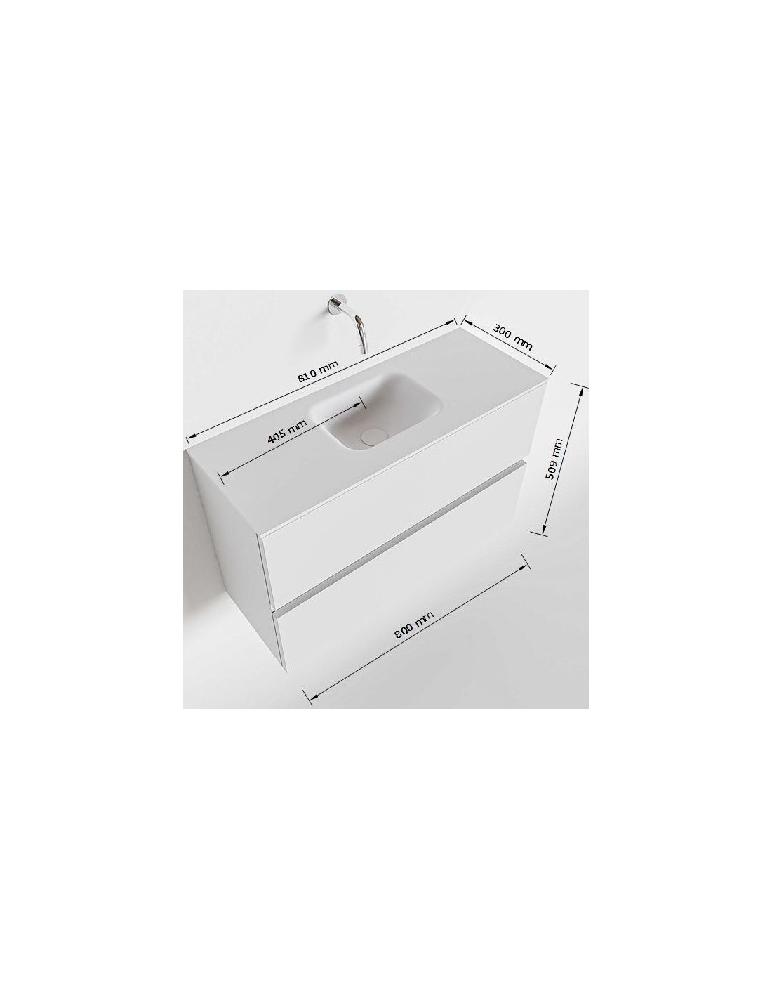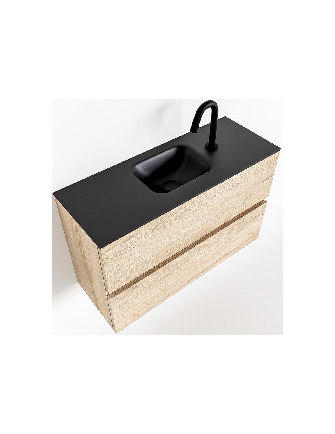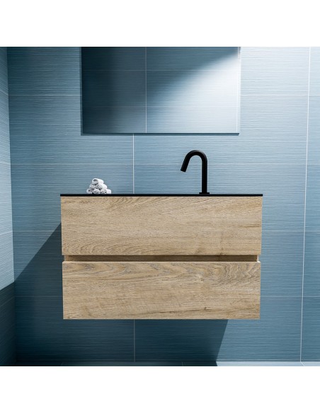 ADA Komplet badmiljø med centreret håndvask til bordmonteret armatur. Badmiljøet kommer med 2 skuffer med fuldt udtræk, og er fremstillet i MDF med design af vasket eg. Håndvasken er fremstillet i sort solid surface. Badmiljøet måler 80 x 50 cm i bredde og højde. Det viste armatur medfølger ikke i sættet.