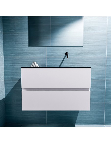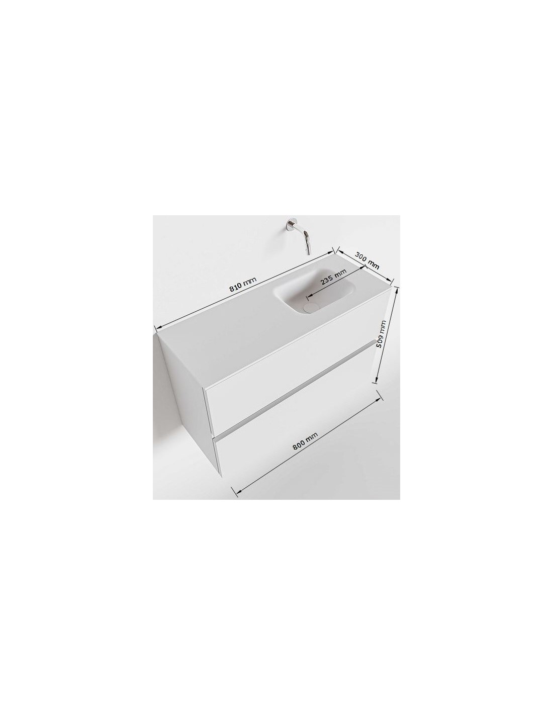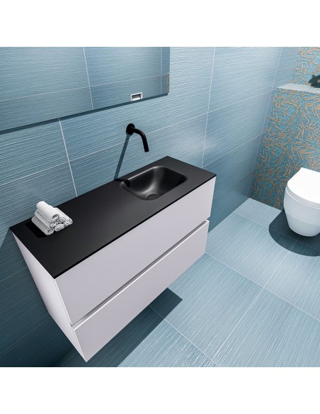 ADA Komplet badmiljø med højrevendt håndvask til vægmonteret armatur. Badmiljøet kommer med 2 skuffer med fuldt udtræk, og er fremstillet i MDF. Håndvasken er fremstillet i sort solid surface. Badmiljøet måler 80 x 50 cm i bredde og højde. Det viste armatur medfølger ikke i sættet.