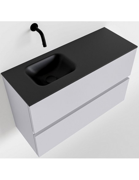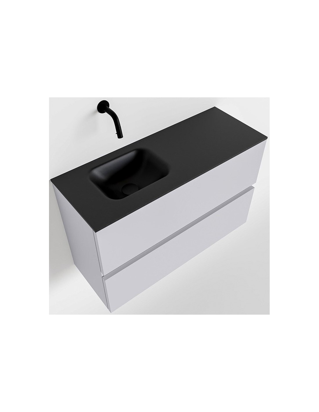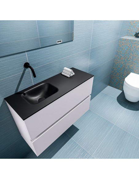 ADA Komplet badmiljø med venstrevendt håndvask til vægmonteret armatur. Badmiljøet kommer med 2 skuffer med fuldt udtræk, og er fremstillet i MDF. Håndvasken er fremstillet i sort solid surface. Badmiljøet måler 80 x 50 cm i bredde og højde. Det viste armatur medfølger ikke i sættet.