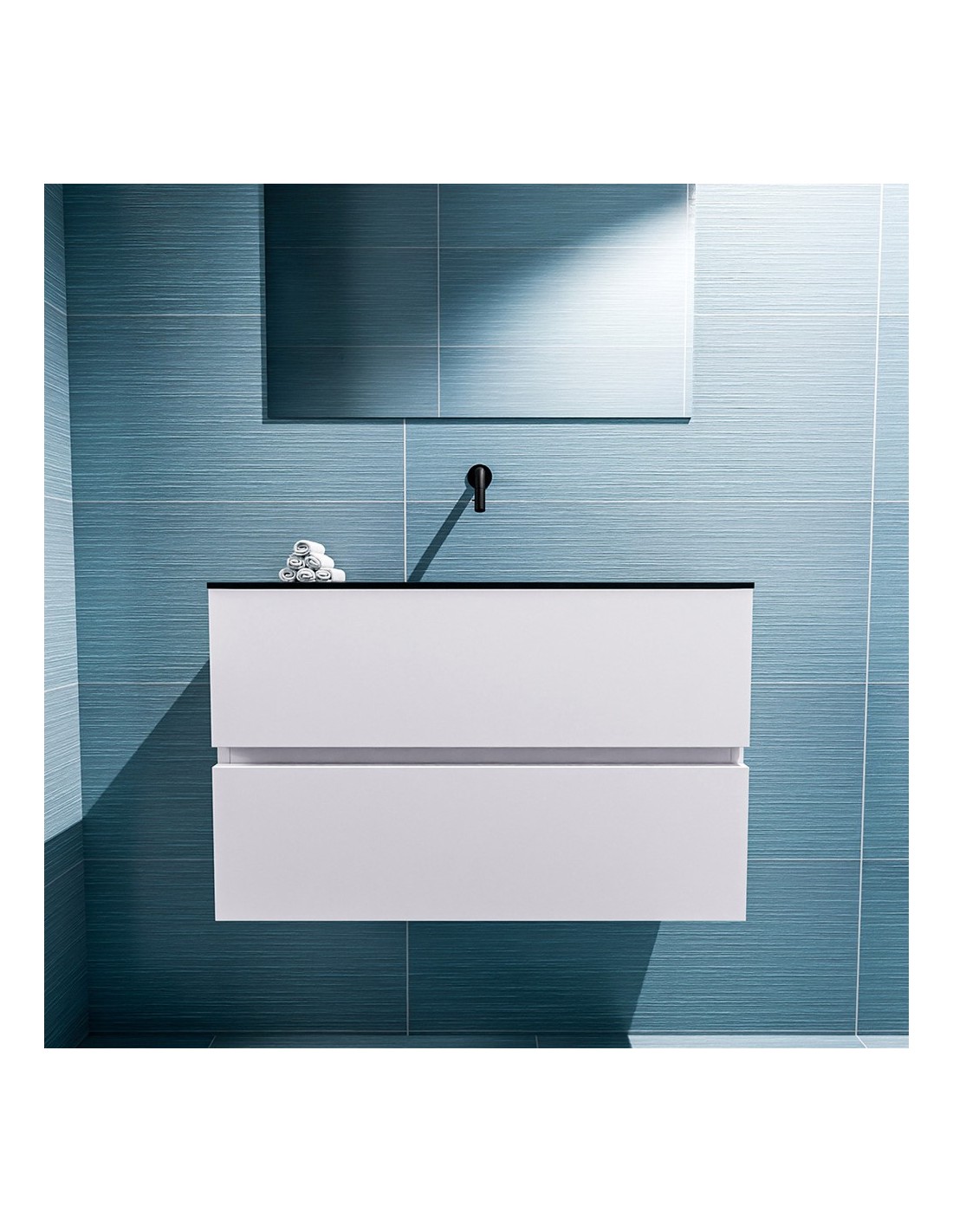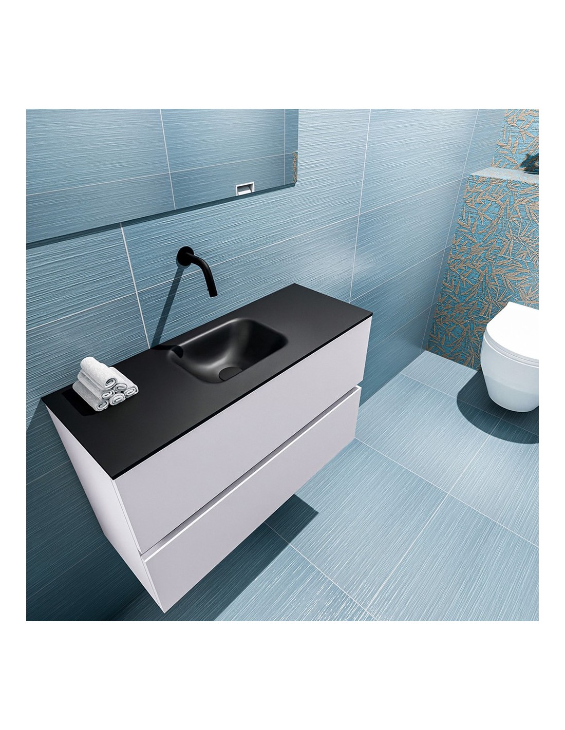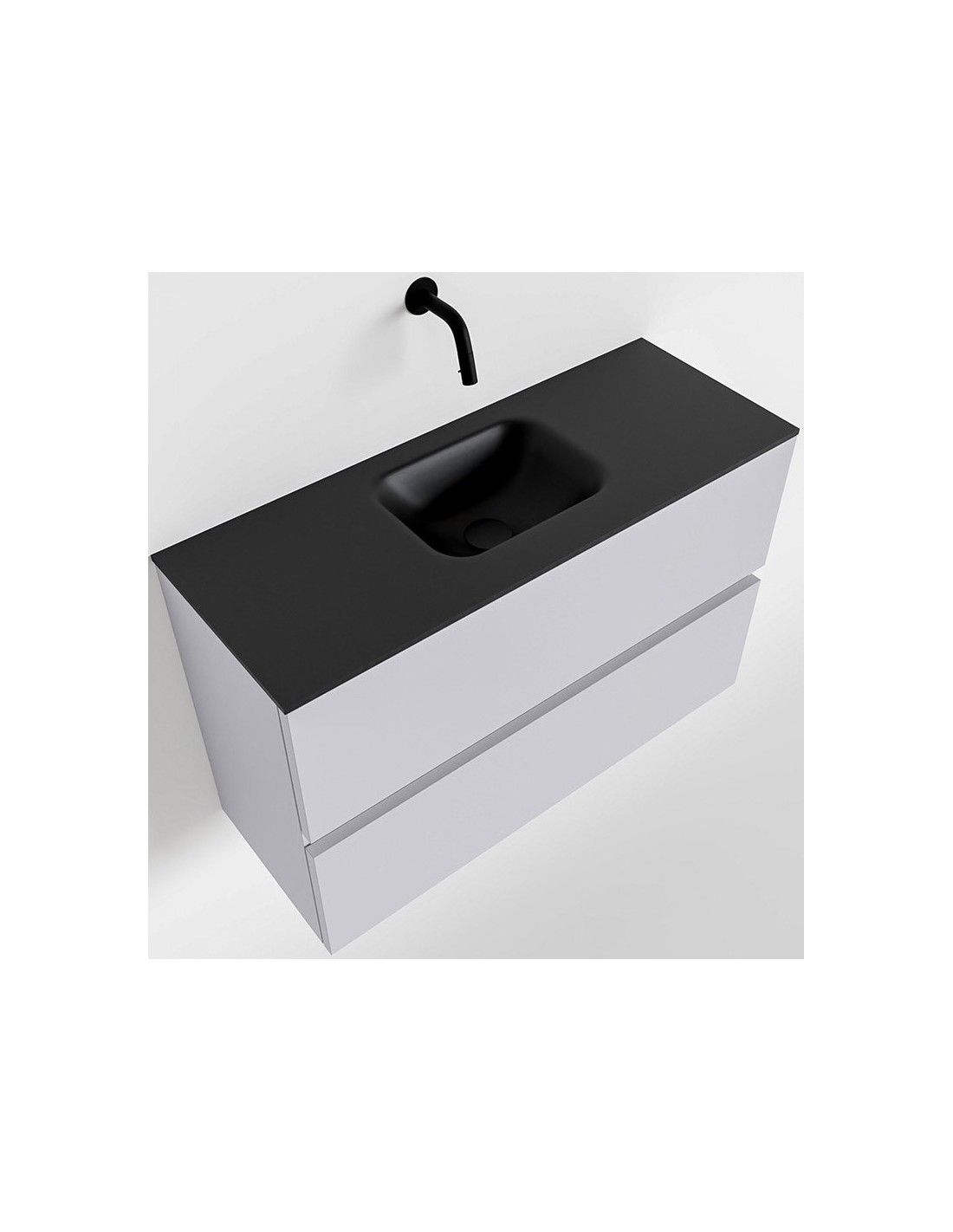 ADA Komplet badmiljø med centreret håndvask til vægmonteret armatur. Badmiljøet kommer med 2 skuffer med fuldt udtræk, og er fremstillet i MDF. Håndvasken er fremstillet i sort solid surface. Badmiljøet måler 80 x 50 cm i bredde og højde. Det viste armatur medfølger ikke i sættet.
