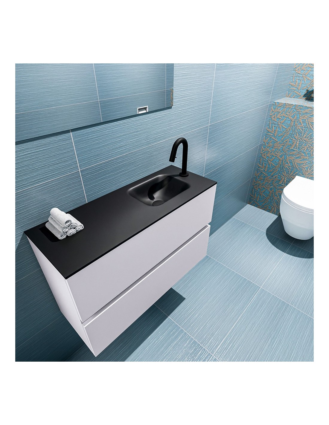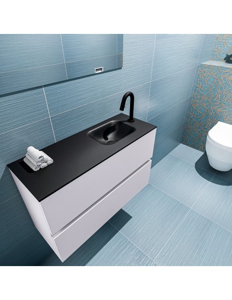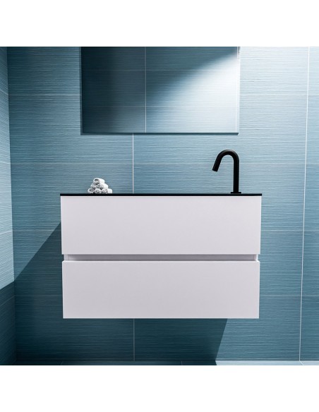 ADA Komplet badmiljø med højrevendt håndvask til bordmonteret armatur. Badmiljøet kommer med 2 skuffer med fuldt udtræk, og er fremstillet i MDF. Håndvasken er fremstillet i sort solid surface. Badmiljøet måler 80 x 50 cm i bredde og højde. Det viste armatur medfølger ikke i sættet.