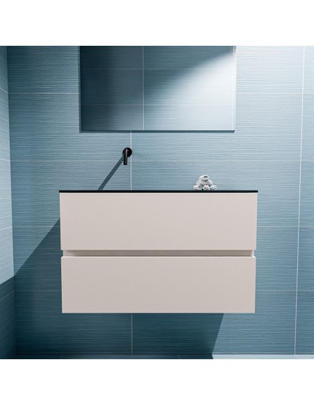 ADA Komplet badmiljø med venstrevendt håndvask til vægmonteret armatur. Badmiljøet kommer med 2 skuffer med fuldt udtræk, og er fremstillet i MDF. Håndvasken er fremstillet i sort solid surface. Badmiljøet måler 80 x 50 cm i bredde og højde. Det viste armatur medfølger ikke i sættet.
