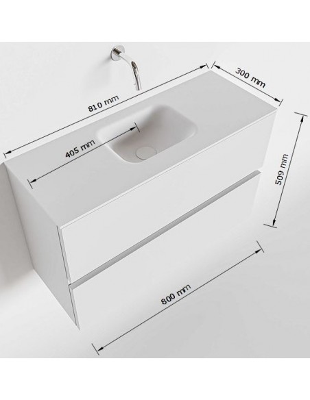 ADA Komplet badmiljø med centreret håndvask til vægmonteret armatur. Badmiljøet kommer med 2 skuffer med fuldt udtræk, og er fremstillet i MDF. Håndvasken er fremstillet i sort solid surface. Badmiljøet måler 80 x 50 cm i bredde og højde. Det viste armatur medfølger ikke i sættet.
