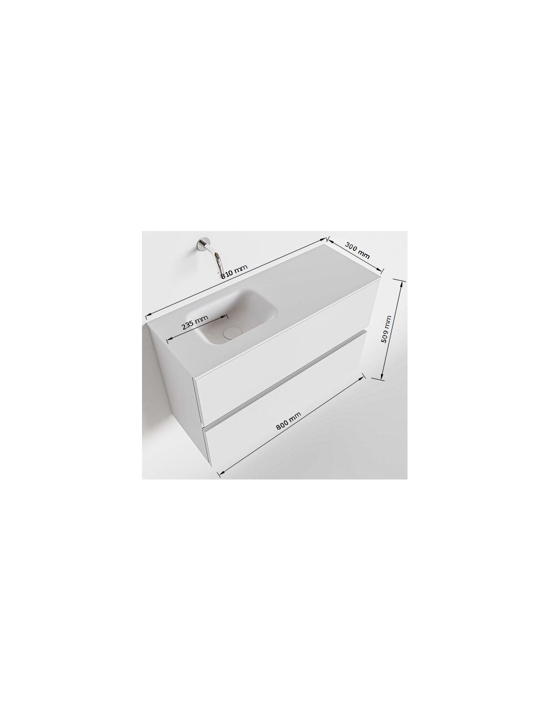 ADA Komplet badmiljø med venstrevendt håndvask til vægmonteret armatur. Badmiljøet kommer med 2 skuffer med fuldt udtræk, og er fremstillet i MDF. Håndvasken er fremstillet i sort solid surface. Badmiljøet måler 80 x 50 cm i bredde og højde. Det viste armatur medfølger ikke i sættet.