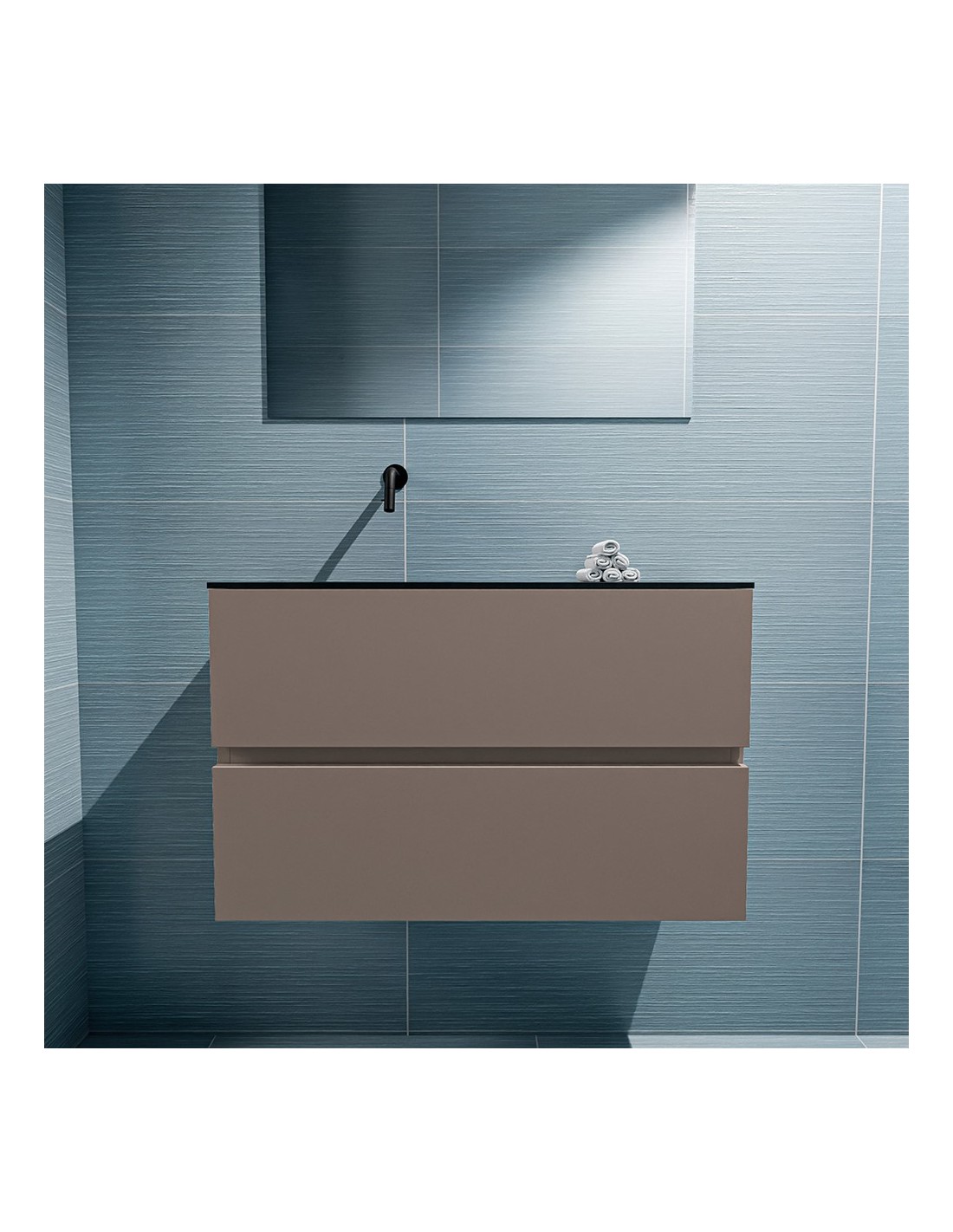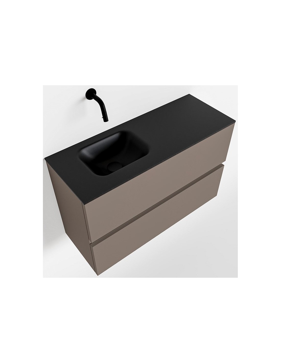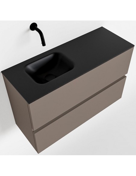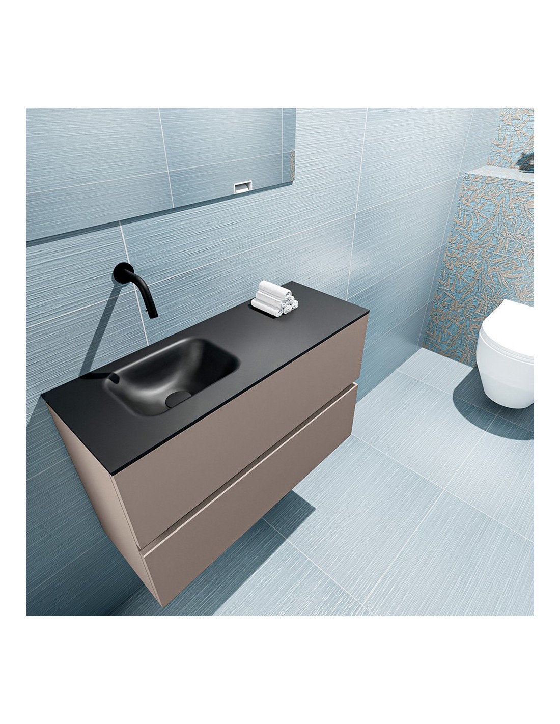 ADA Komplet badmiljø med venstrevendt håndvask til vægmonteret armatur. Badmiljøet kommer med 2 skuffer med fuldt udtræk, og er fremstillet i MDF. Håndvasken er fremstillet i sort solid surface. Badmiljøet måler 80 x 50 cm i bredde og højde. Det viste armatur medfølger ikke i sættet.