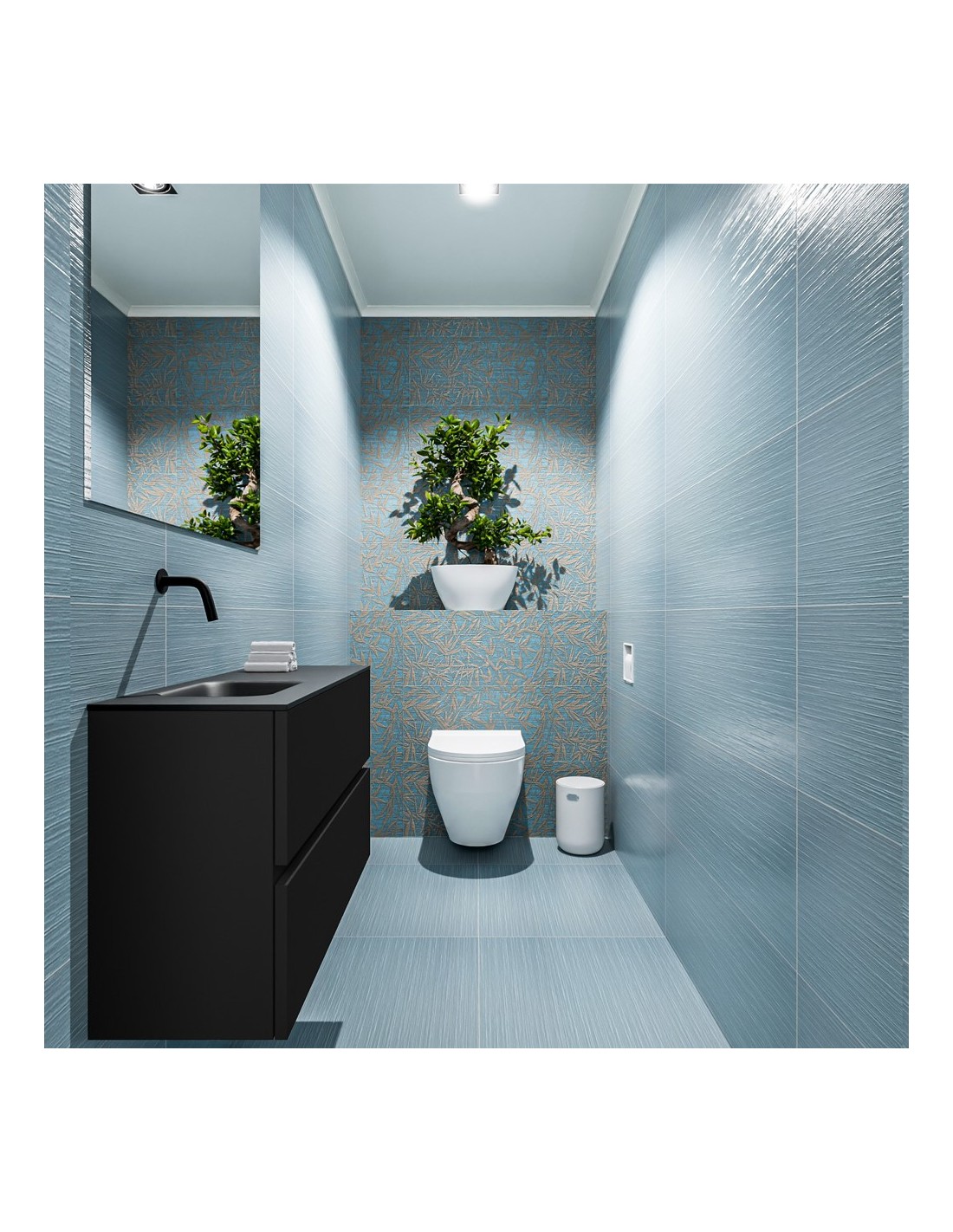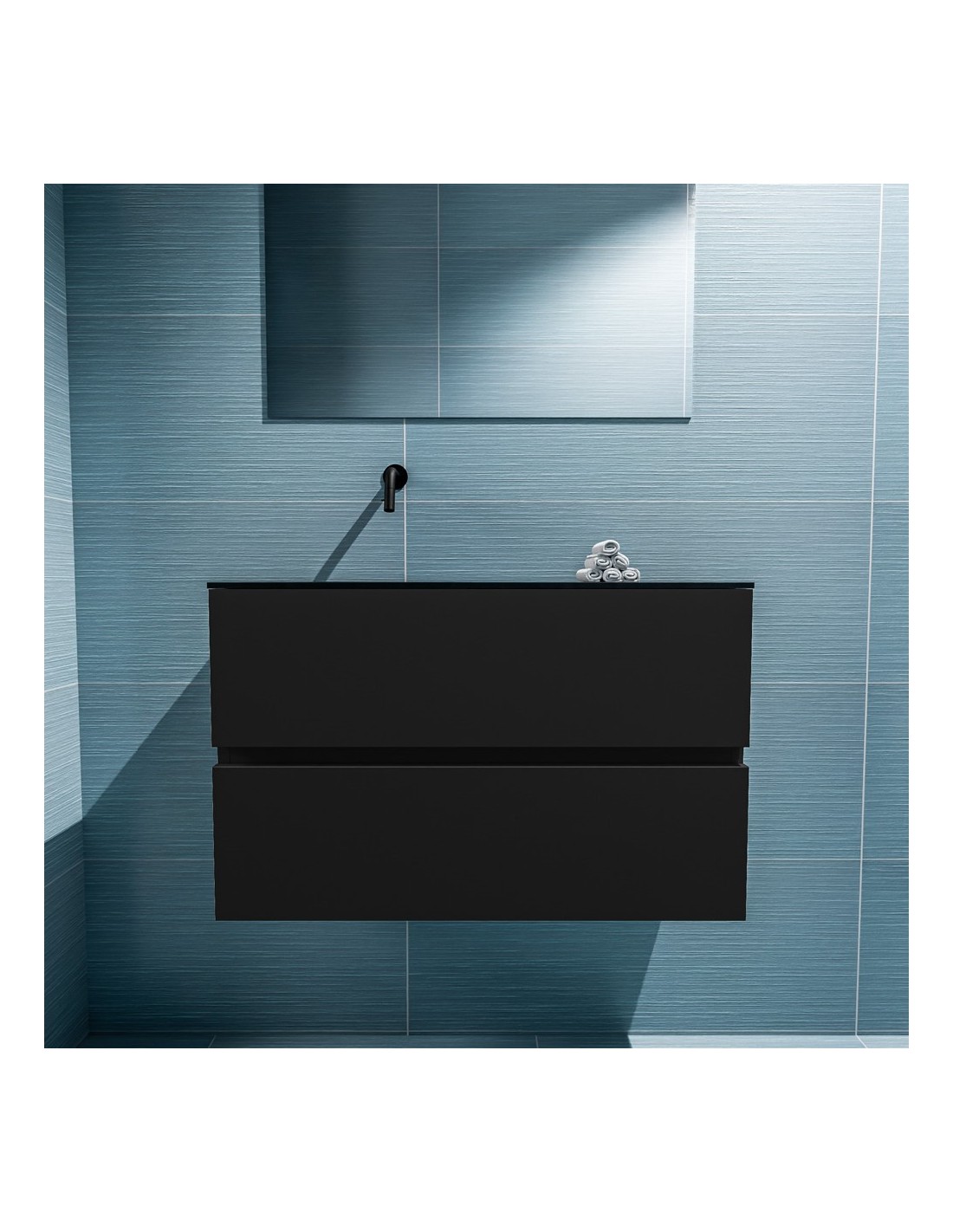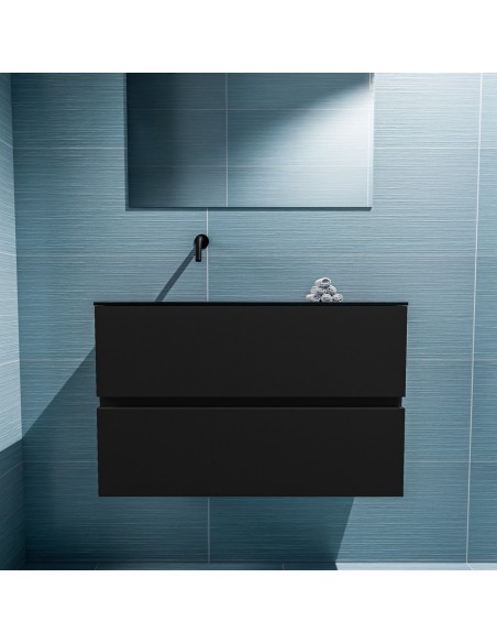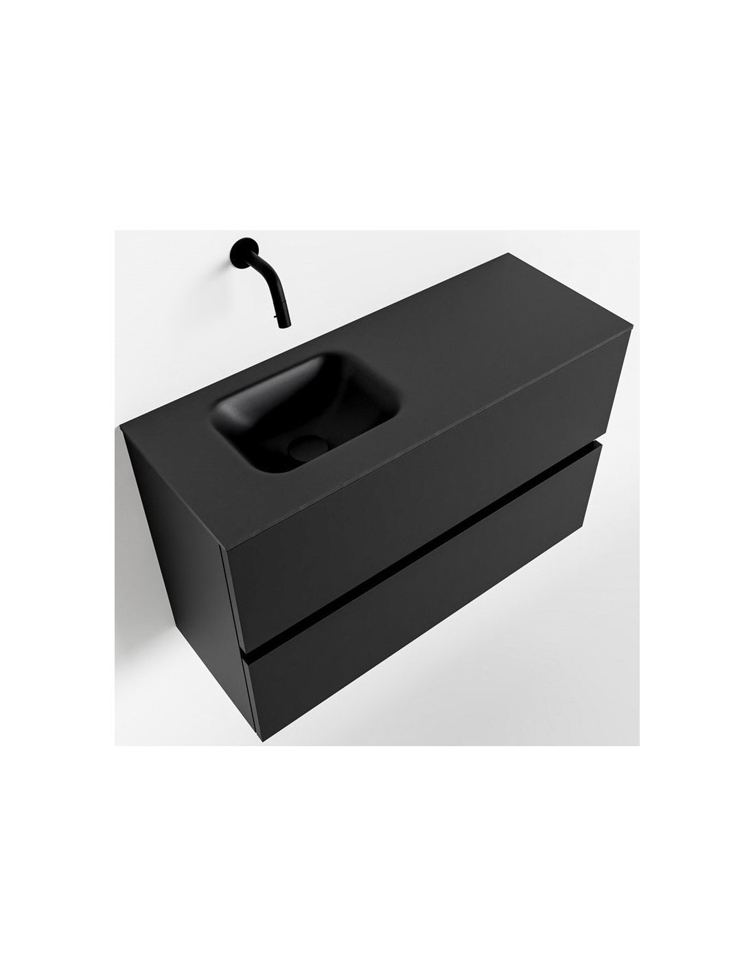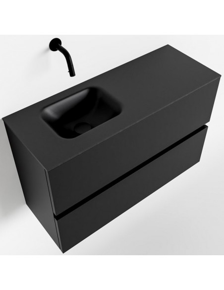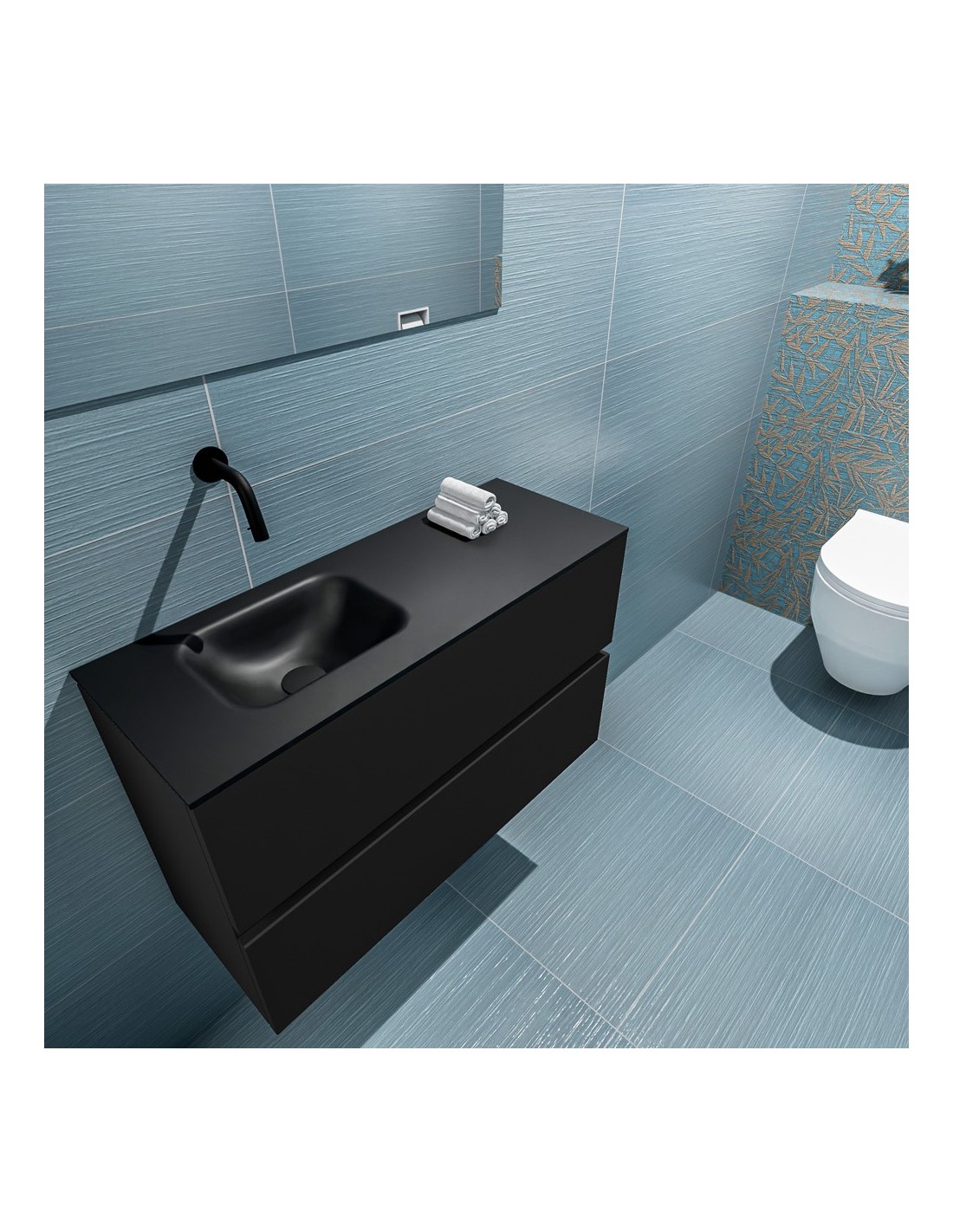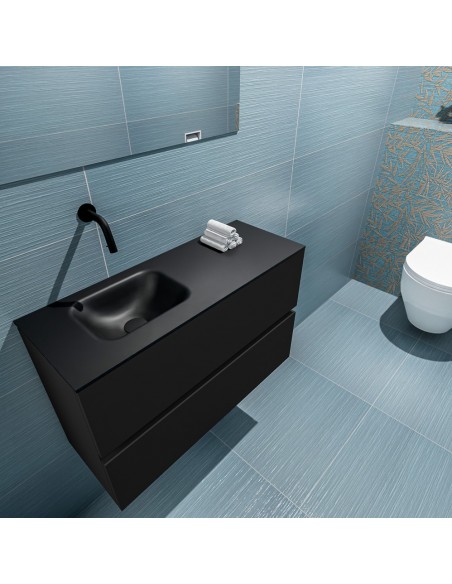 ADA Komplet badmiljø med venstrevendt håndvask til vægmonteret armatur. Badmiljøet kommer med 2 skuffer med fuldt udtræk, og er fremstillet i MDF. Håndvasken er fremstillet i sort solid surface. Badmiljøet måler 80 x 50 cm i bredde og højde. Det viste armatur medfølger ikke i sættet.