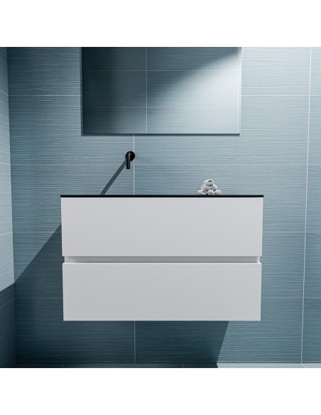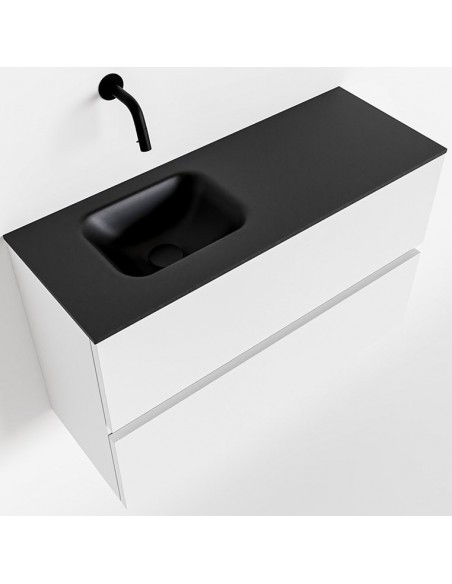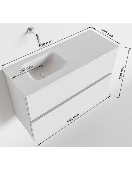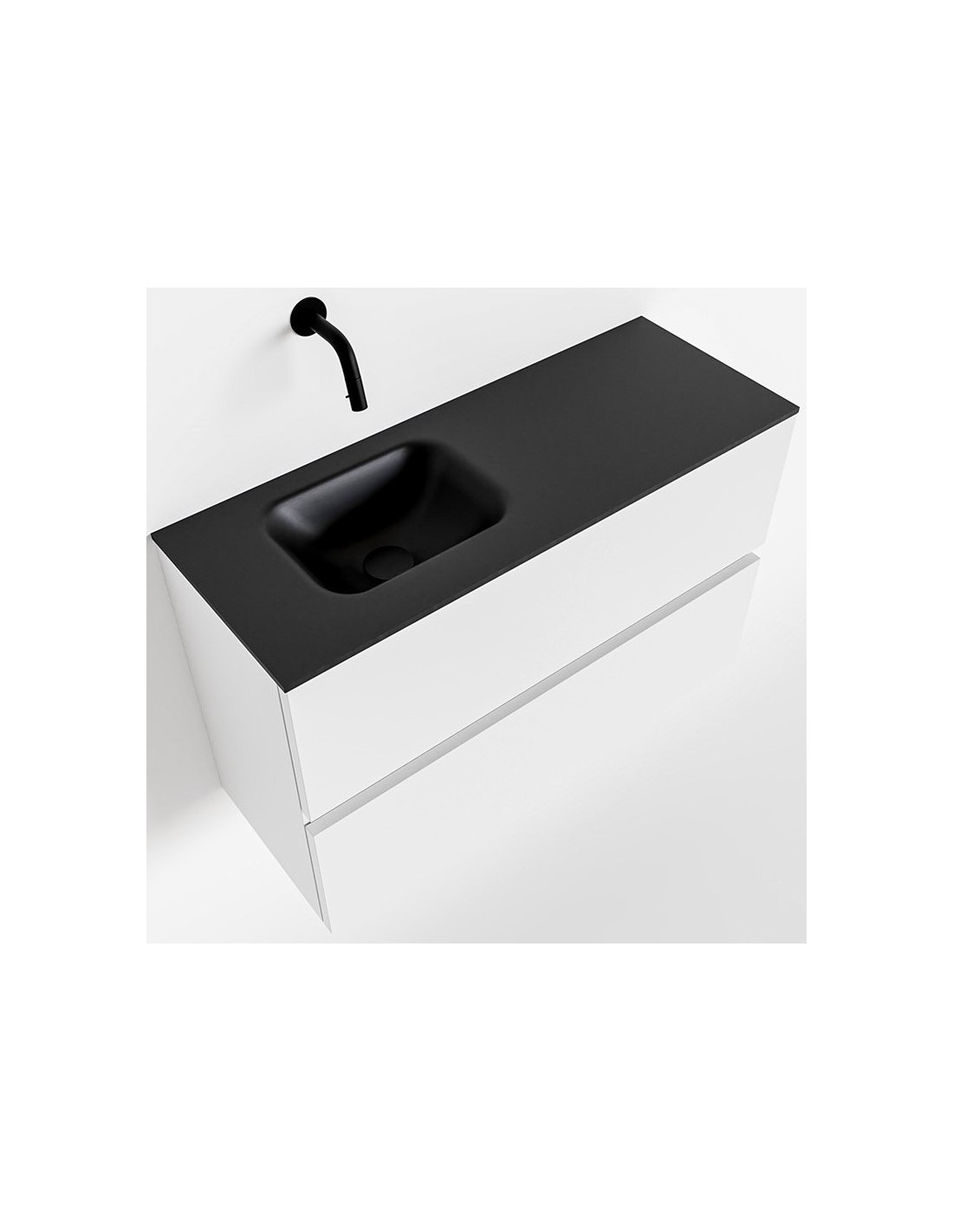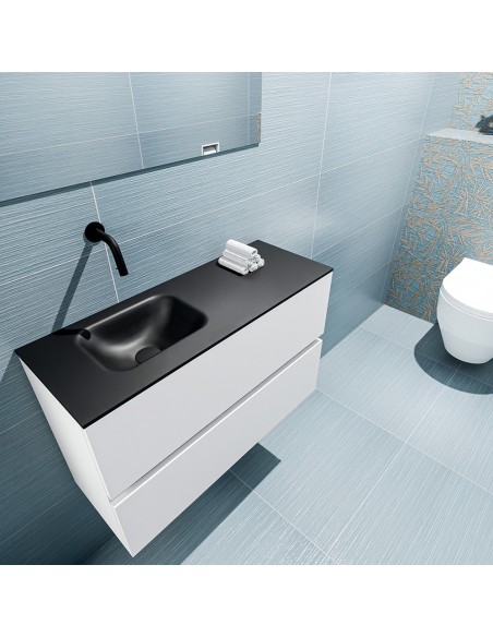 ADA Komplet badmiljø med venstrevendt håndvask til vægmonteret armatur. Badmiljøet kommer med 2 skuffer med fuldt udtræk, og er fremstillet i MDF. Håndvasken er fremstillet i sort solid surface. Badmiljøet måler 80 x 50 cm i bredde og højde. Det viste armatur medfølger ikke i sættet.