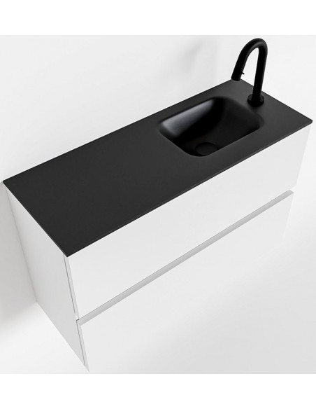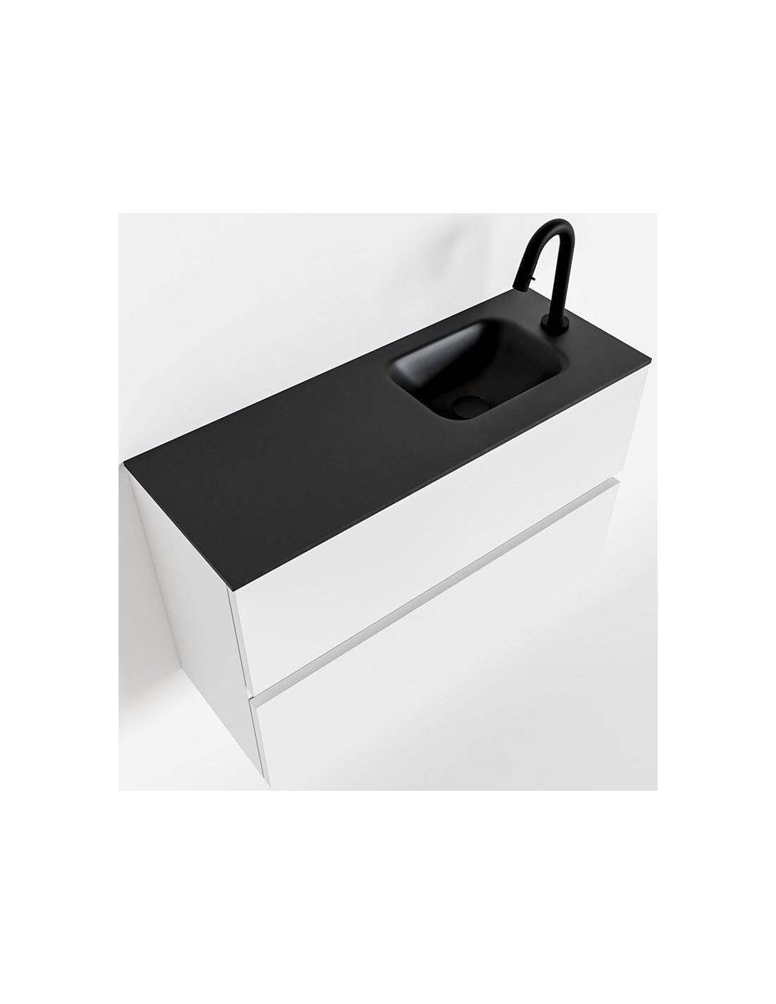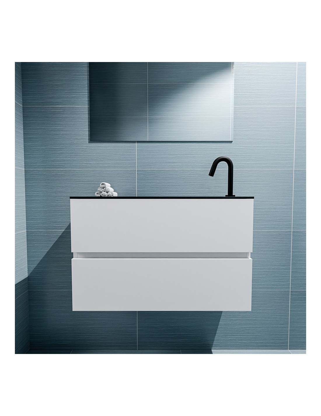ADA Komplet badmiljø med højrevendt håndvask til bordmonteret armatur. Badmiljøet kommer med 2 skuffer med fuldt udtræk, og er fremstillet i MDF. Håndvasken er fremstillet i sort solid surface. Badmiljøet måler 80 x 50 cm i bredde og højde. Det viste armatur medfølger ikke i sættet.