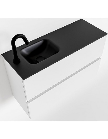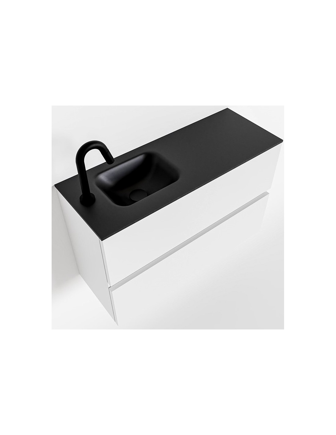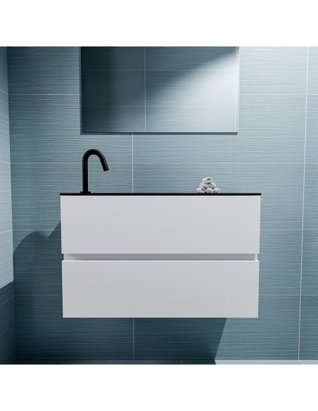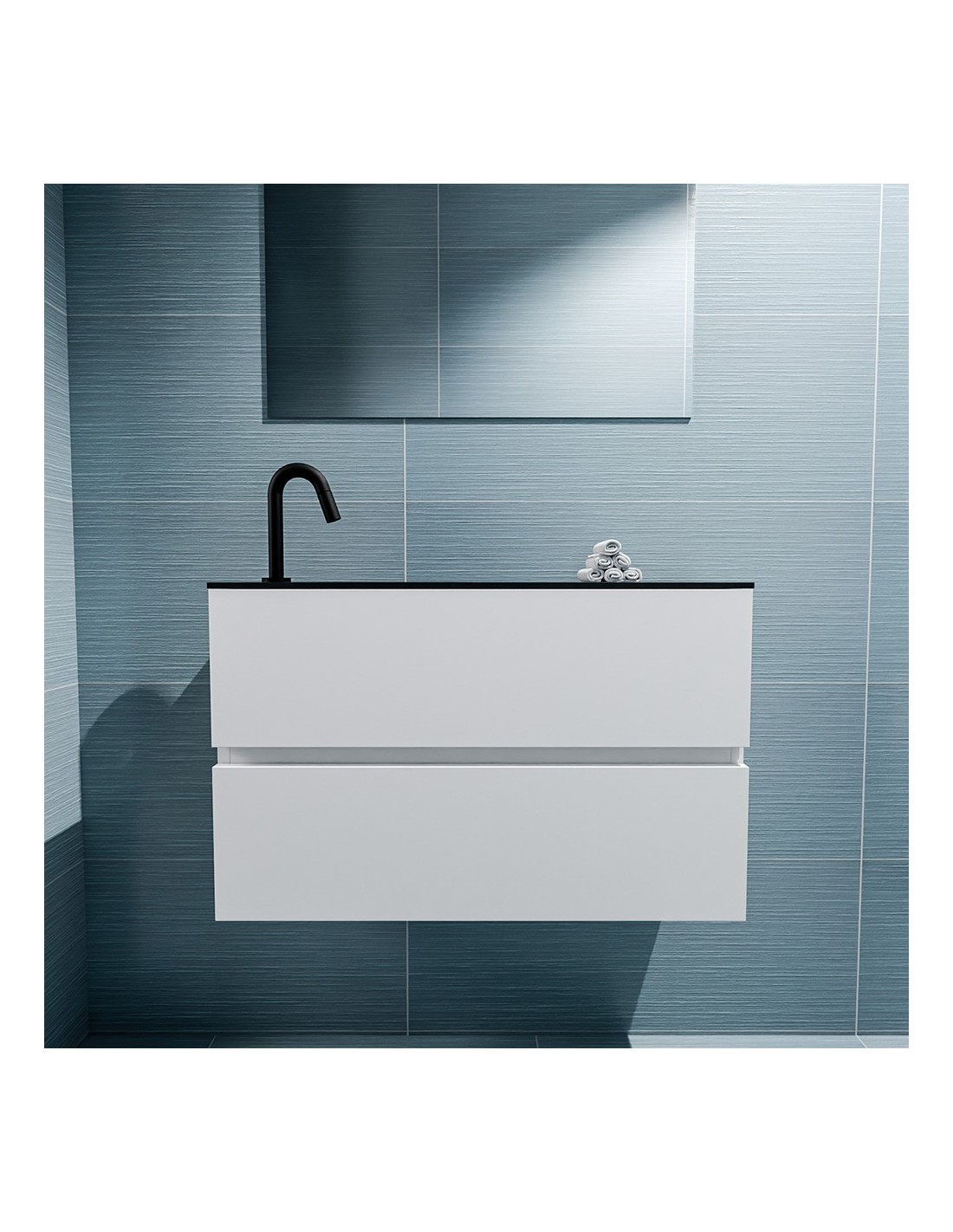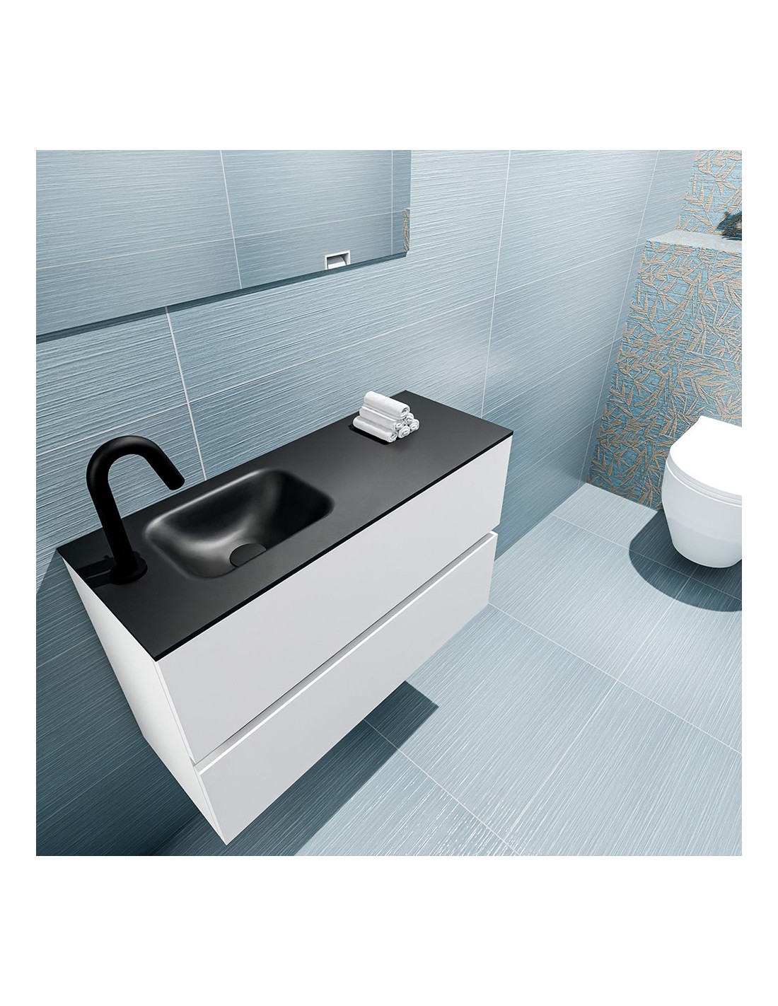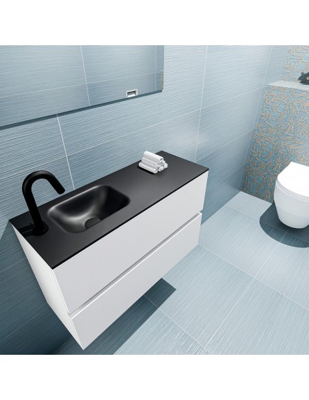 ADA Komplet badmiljø med venstrevendt håndvask til bordmonteret armatur. Badmiljøet kommer med 2 skuffer med fuldt udtræk, og er fremstillet i MDF. Håndvasken er fremstillet i sort solid surface. Badmiljøet måler 80 x 50 cm i bredde og højde. Det viste armatur medfølger ikke i sættet.