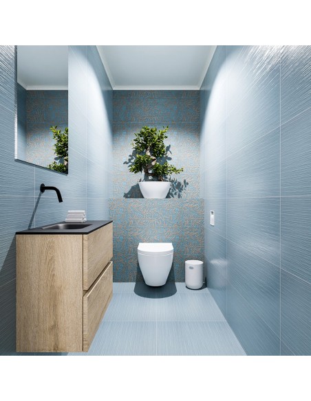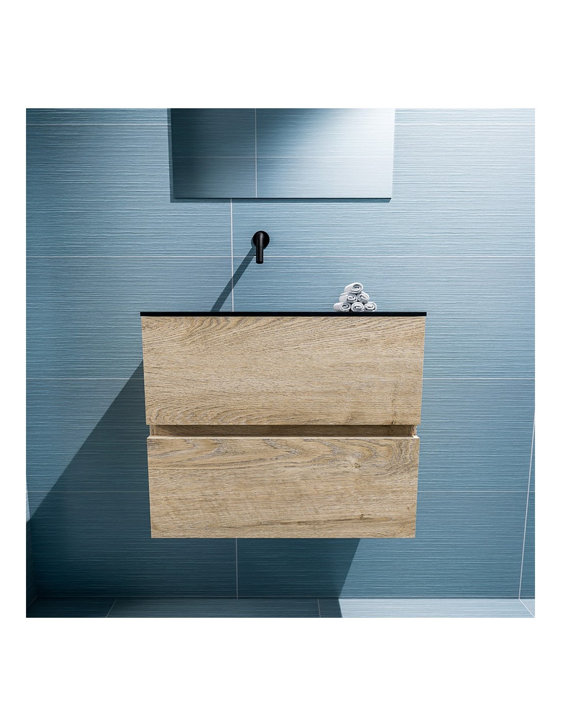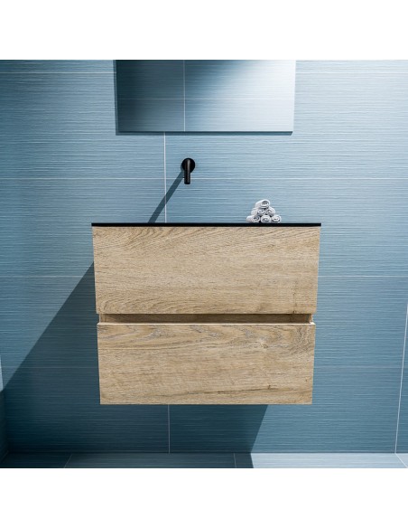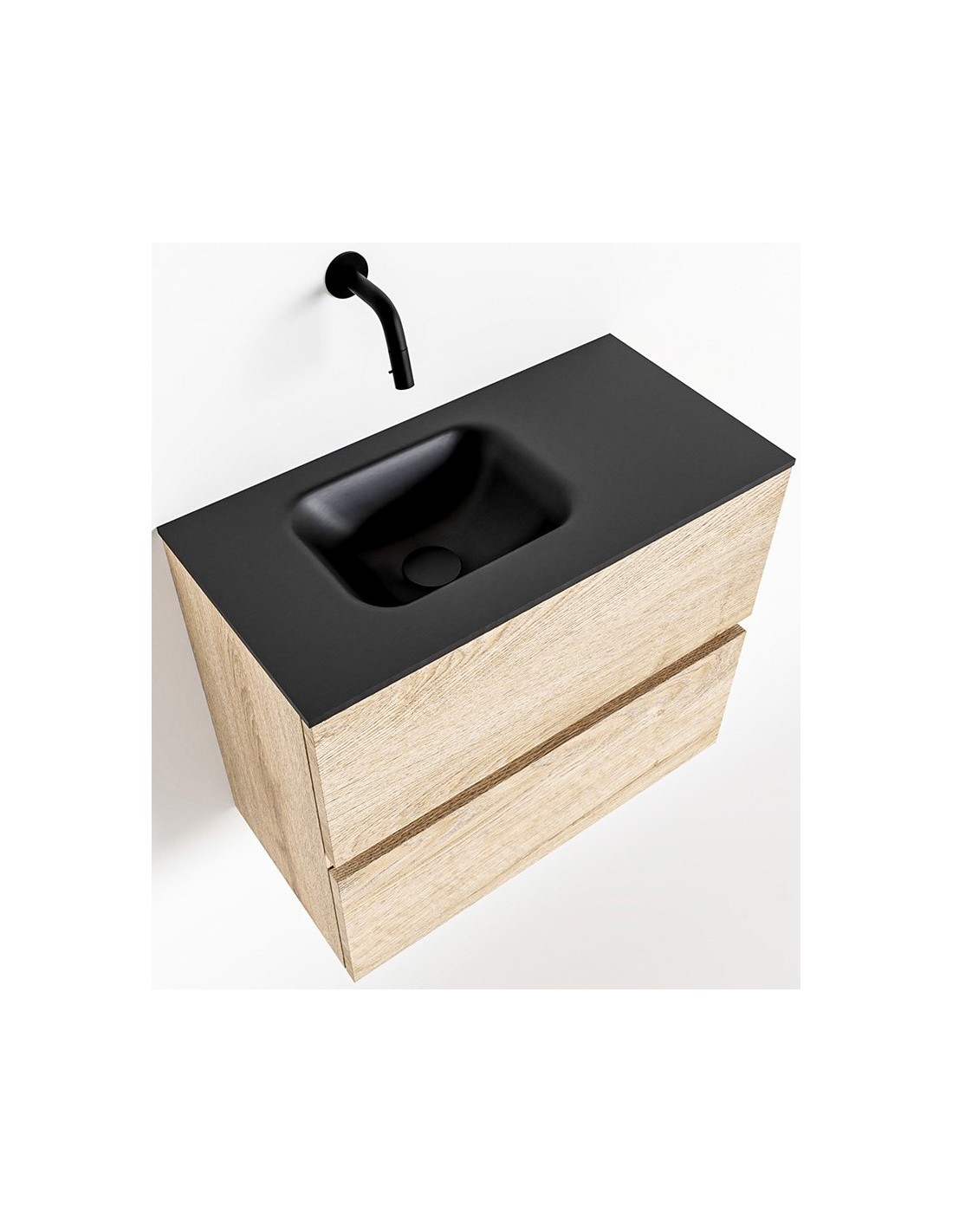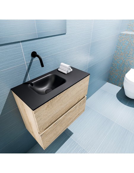 ADA Komplet badmiljø med venstrevendt håndvask til vægmonteret armatur. Badmiljøet kommer med 2 skuffer med fuldt udtræk, og er fremstillet i MDF med design af vasket eg. Håndvasken er fremstillet i sort solid surface. Badmiljøet måler 60 x 50 cm i bredde og højde. Det viste armatur medfølger ikke i sættet.