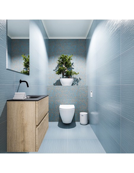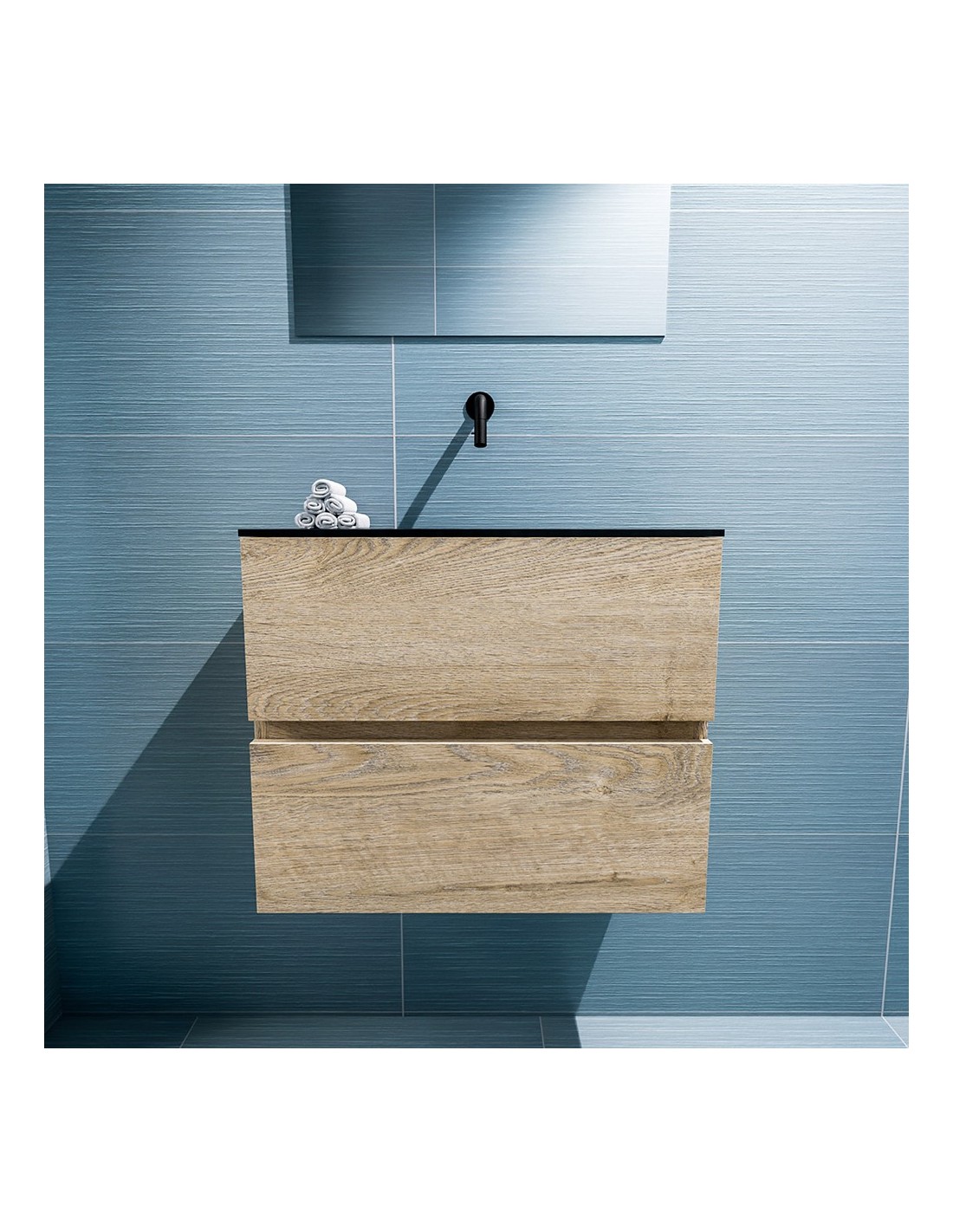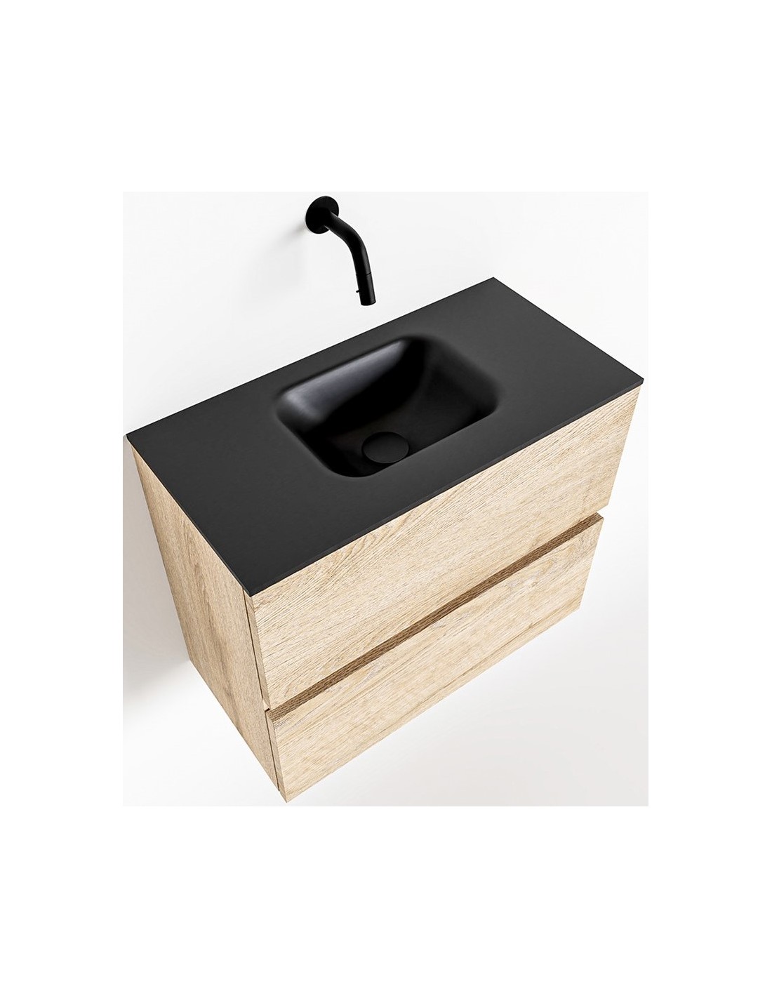 ADA Komplet badmiljø med centreret håndvask til vægmonteret armatur. Badmiljøet kommer med 2 skuffer med fuldt udtræk, og er fremstillet i MDF med design af vasket eg. Håndvasken er fremstillet i sort solid surface. Badmiljøet måler 60 x 50 cm i bredde og højde. Det viste armatur medfølger ikke i sættet.