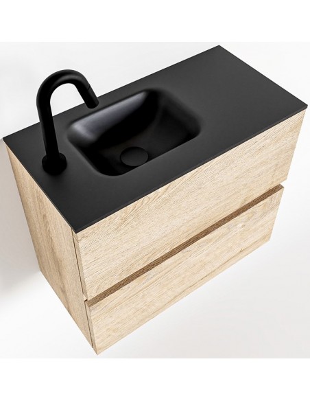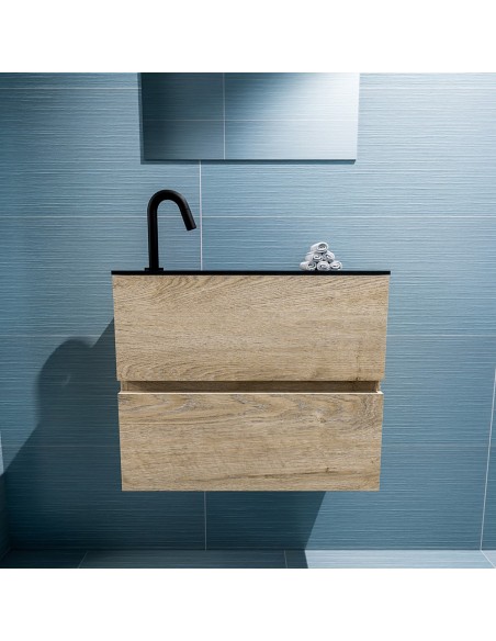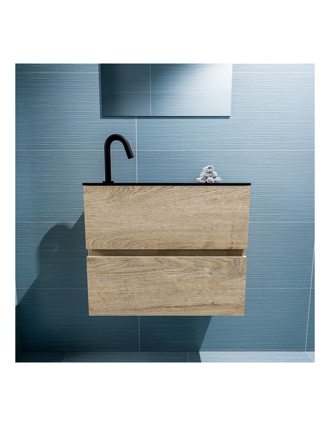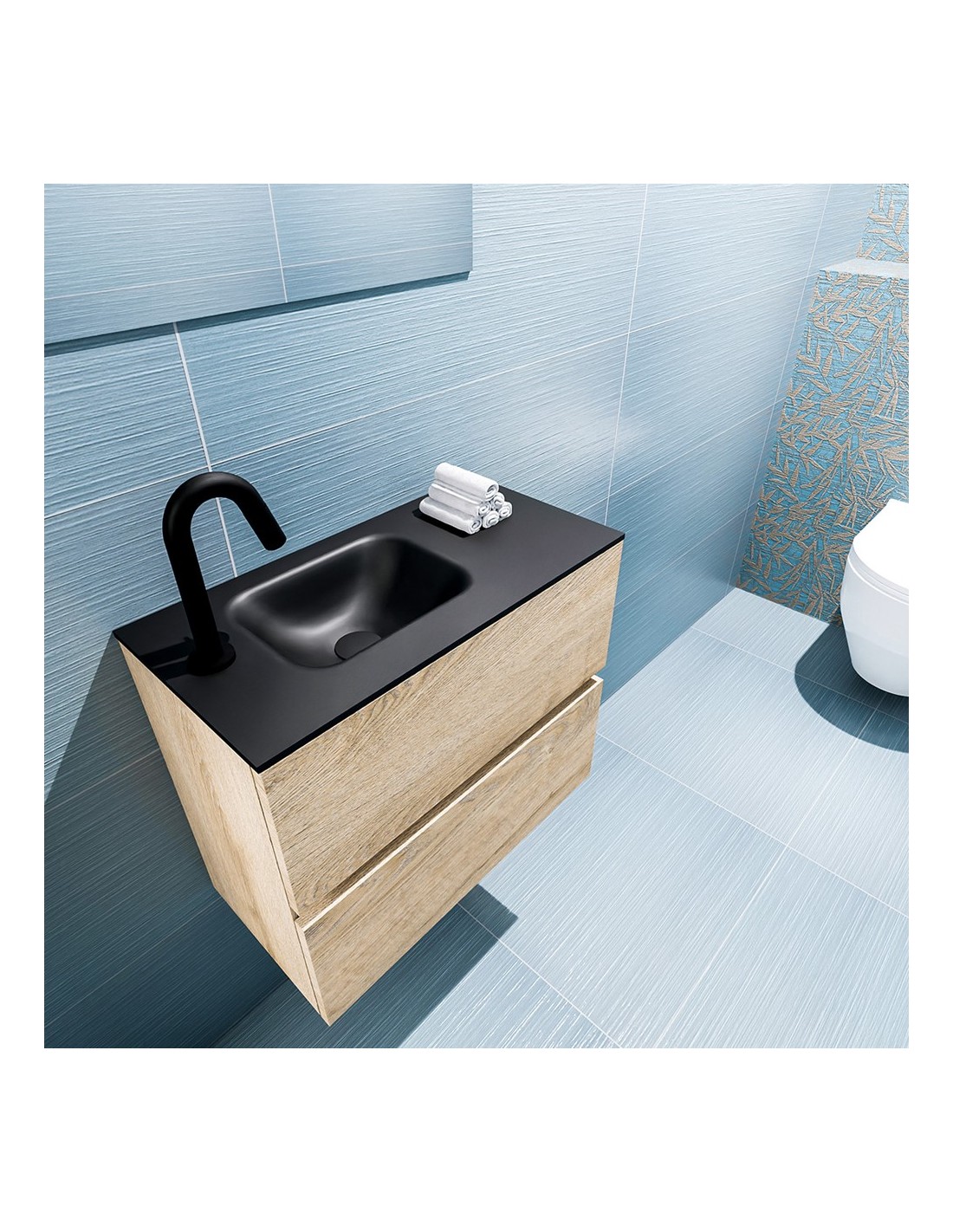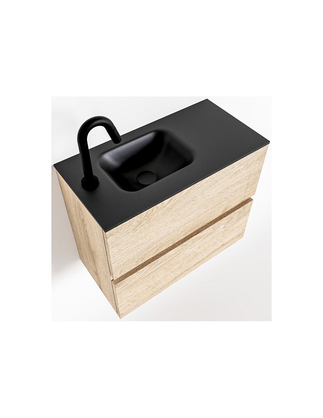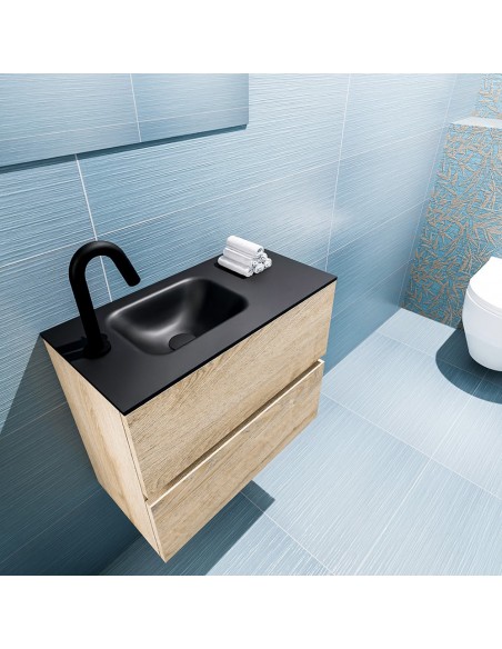 ADA Komplet badmiljø med venstrevendt håndvask til bordmonteret armatur. Badmiljøet kommer med 2 skuffer med fuldt udtræk, og er fremstillet i MDF med design af vasket eg. Håndvasken er fremstillet i sort solid surface. Badmiljøet måler 60 x 50 cm i bredde og højde. Det viste armatur medfølger ikke i sættet.