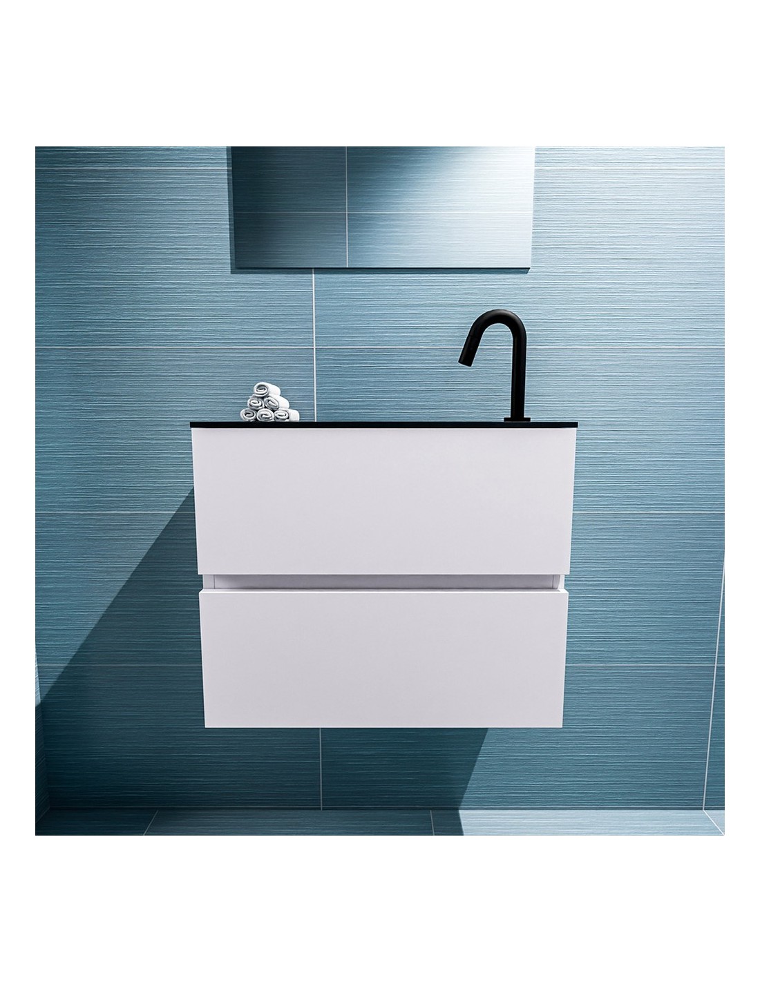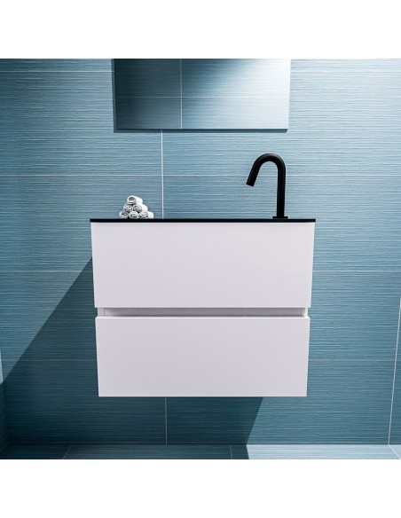 ADA Komplet badmiljø med højrevendt håndvask til bordmonteret armatur. Badmiljøet kommer med 2 skuffer med fuldt udtræk, og er fremstillet i MDF. Håndvasken er fremstillet i sort solid surface. Badmiljøet måler 60 x 50 cm i bredde og højde. Det viste armatur medfølger ikke i sættet.