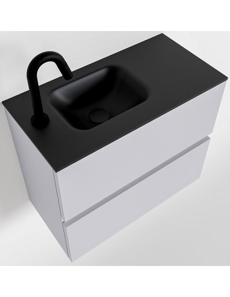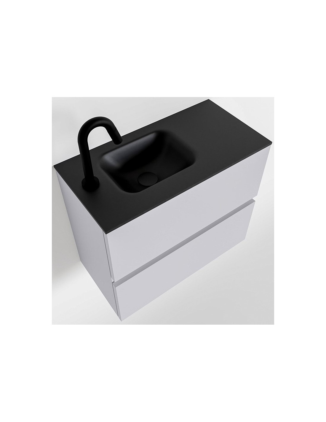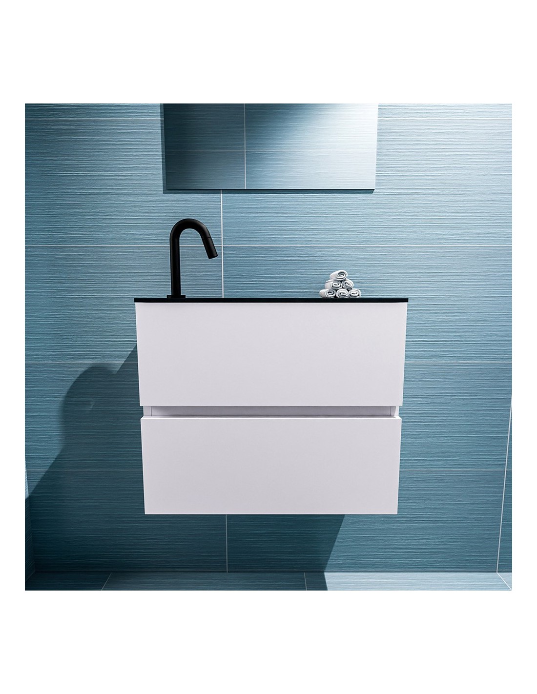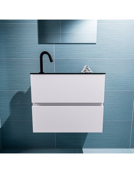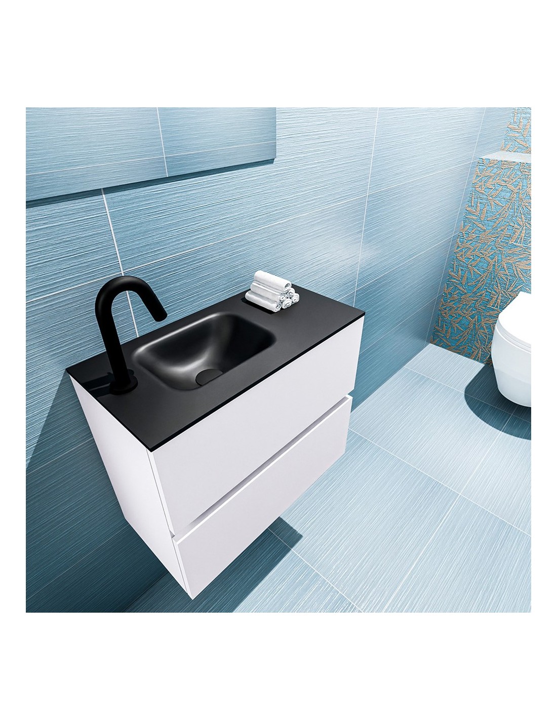 ADA Komplet badmiljø med venstrevendt håndvask til bordmonteret armatur. Badmiljøet kommer med 2 skuffer med fuldt udtræk, og er fremstillet i MDF. Håndvasken er fremstillet i sort solid surface. Badmiljøet måler 60 x 50 cm i bredde og højde. Det viste armatur medfølger ikke i sættet.
