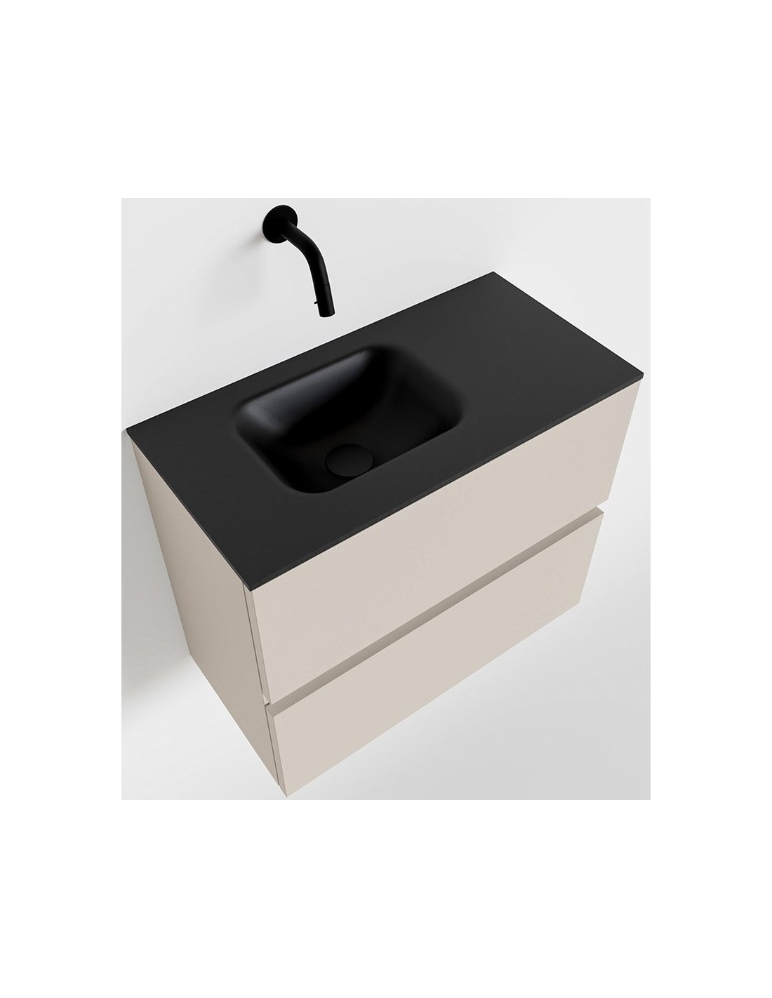 ADA Komplet badmiljø med venstrevendt håndvask til vægmonteret armatur. Badmiljøet kommer med 2 skuffer med fuldt udtræk, og er fremstillet i MDF. Håndvasken er fremstillet i sort solid surface. Badmiljøet måler 60 x 50 cm i bredde og højde. Det viste armatur medfølger ikke i sættet.