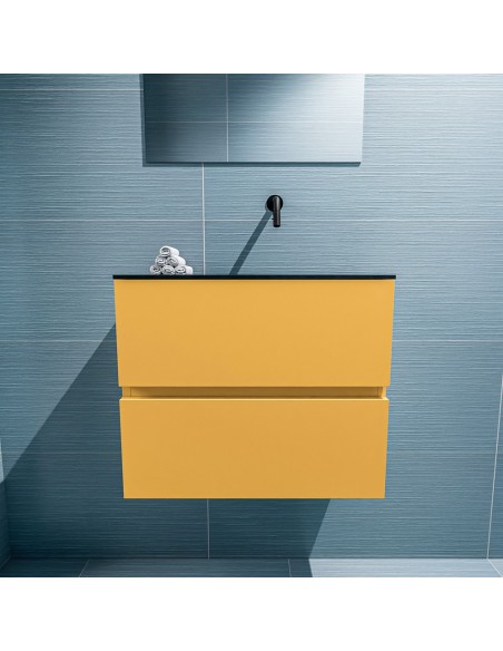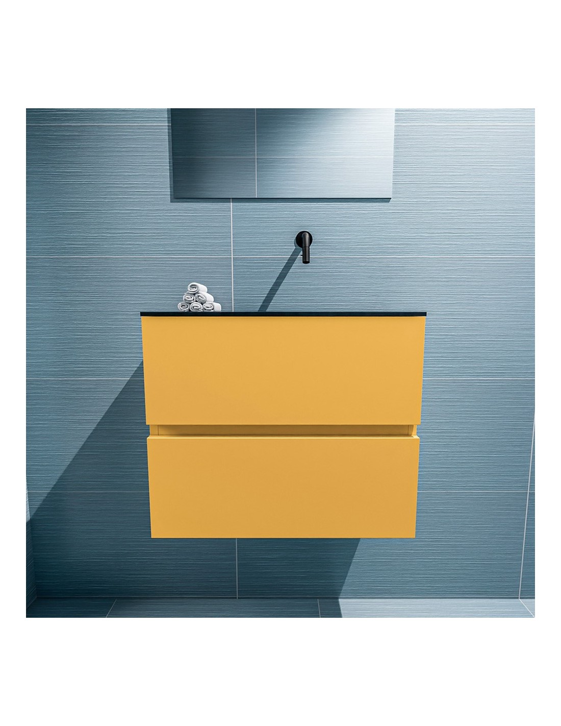 ADA Komplet badmiljø med højrevendt håndvask til vægmonteret armatur. Badmiljøet kommer med 2 skuffer med fuldt udtræk, og er fremstillet i MDF. Håndvasken er fremstillet i sort solid surface. Badmiljøet måler 60 x 50 cm i bredde og højde. Det viste armatur medfølger ikke i sættet.