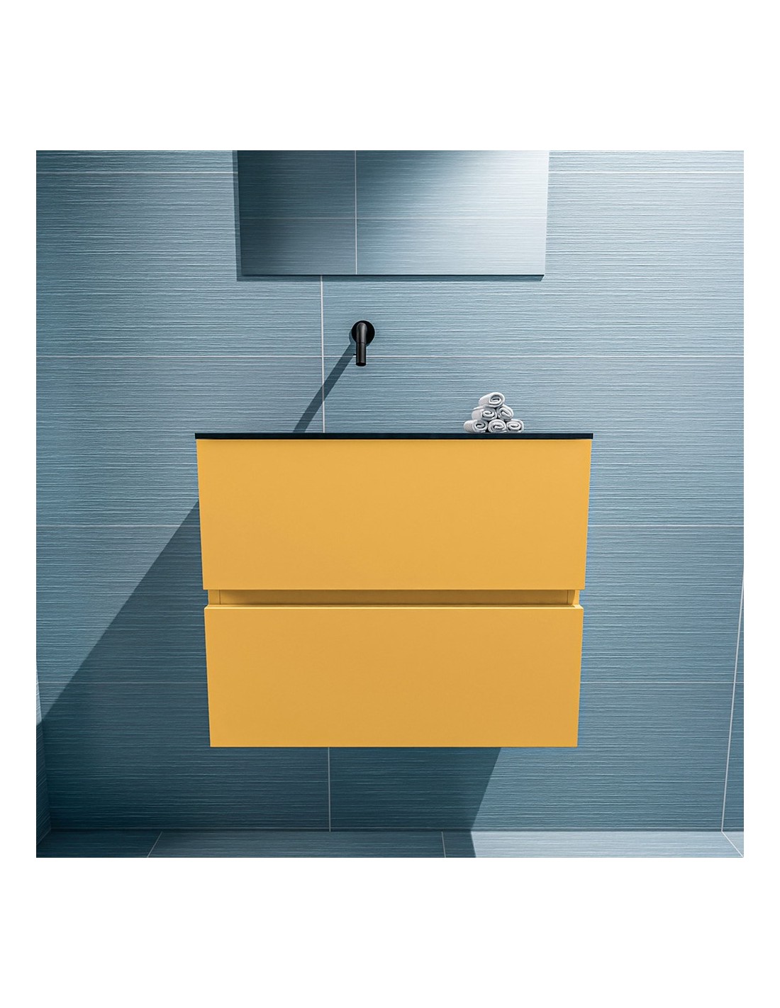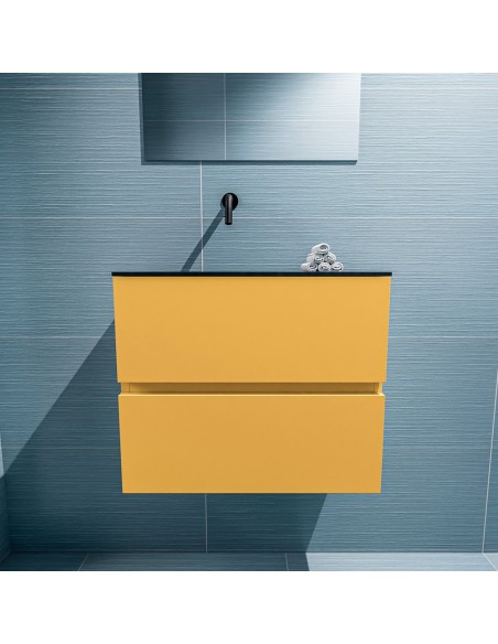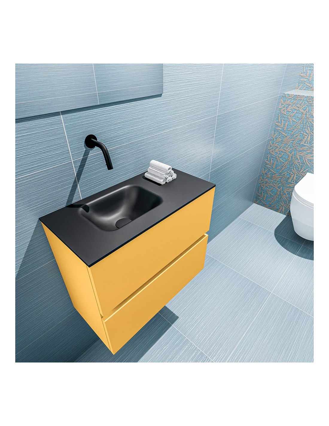 ADA Komplet badmiljø med venstrevendt håndvask til vægmonteret armatur. Badmiljøet kommer med 2 skuffer med fuldt udtræk, og er fremstillet i MDF. Håndvasken er fremstillet i sort solid surface. Badmiljøet måler 60 x 50 cm i bredde og højde. Det viste armatur medfølger ikke i sættet.