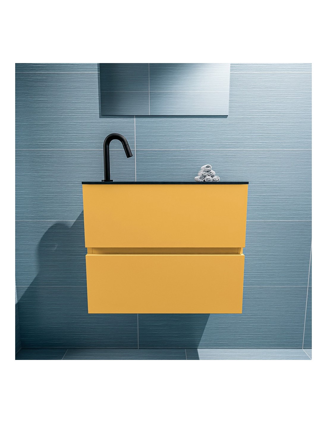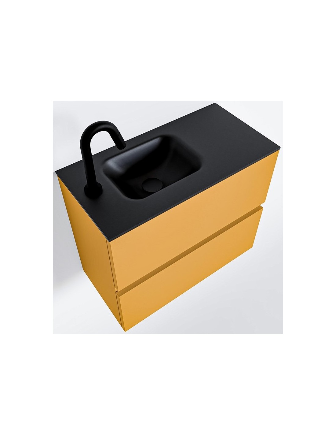 ADA Komplet badmiljø med venstrevendt håndvask til bordmonteret armatur. Badmiljøet kommer med 2 skuffer med fuldt udtræk, og er fremstillet i MDF. Håndvasken er fremstillet i sort solid surface. Badmiljøet måler 60 x 50 cm i bredde og højde. Det viste armatur medfølger ikke i sættet.