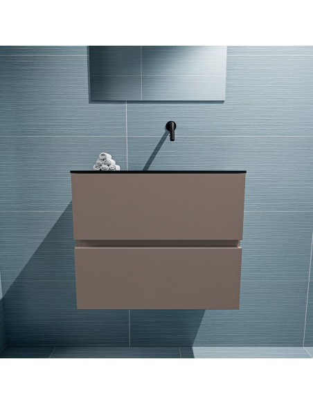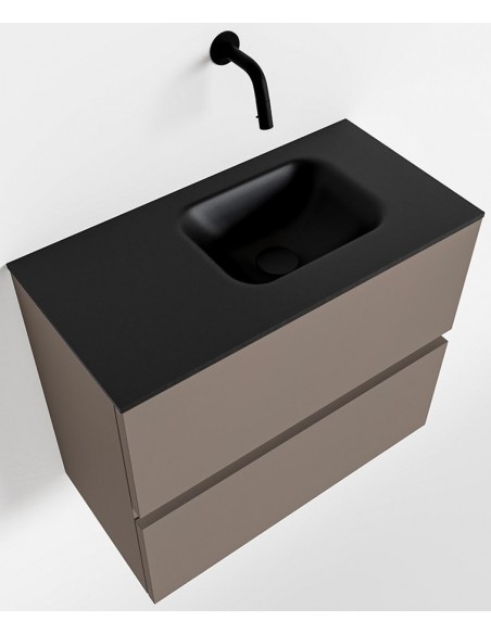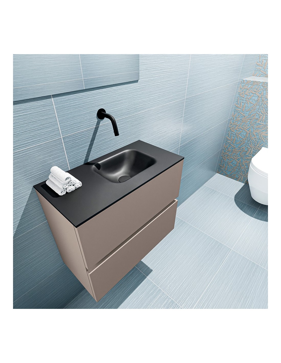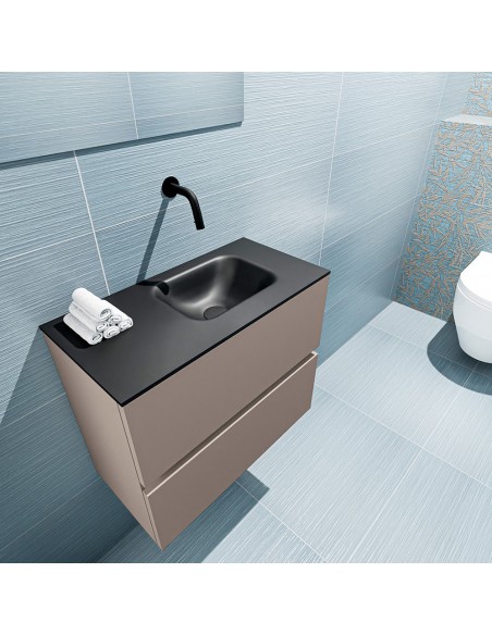 ADA Komplet badmiljø med højrevendt håndvask til vægmonteret armatur. Badmiljøet kommer med 2 skuffer med fuldt udtræk, og er fremstillet i MDF. Håndvasken er fremstillet i sort solid surface. Badmiljøet måler 60 x 50 cm i bredde og højde. Det viste armatur medfølger ikke i sættet.