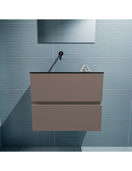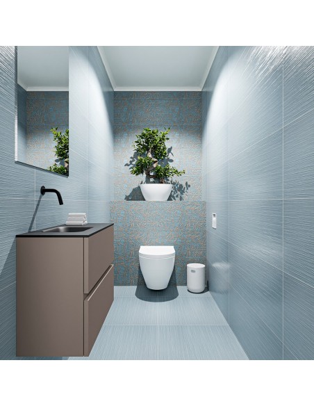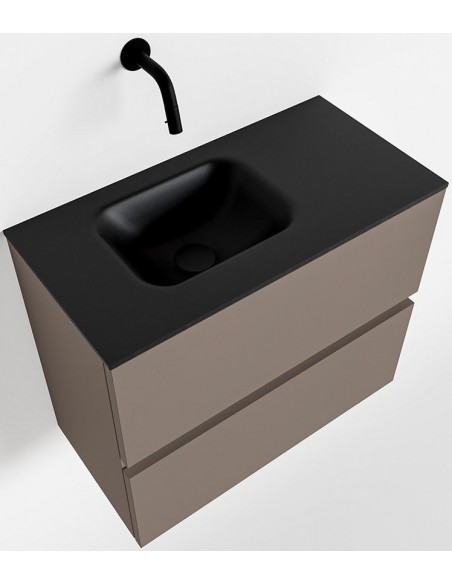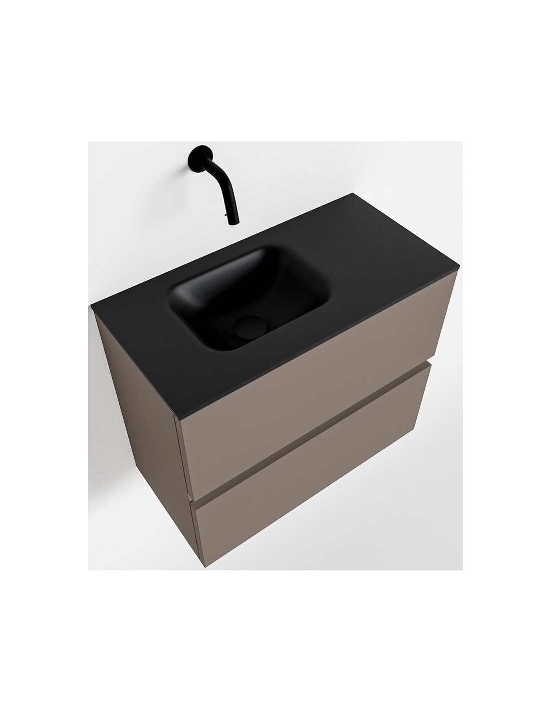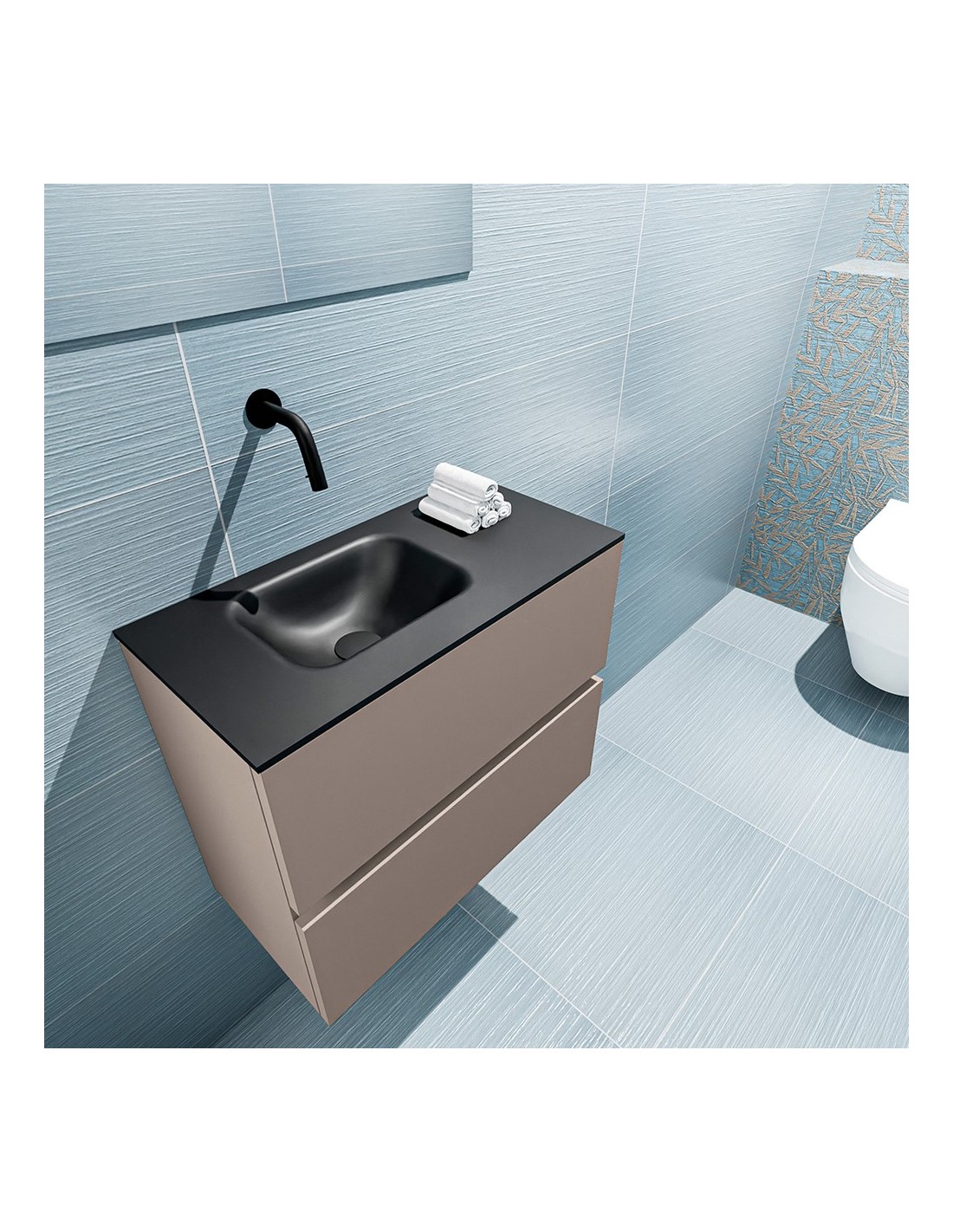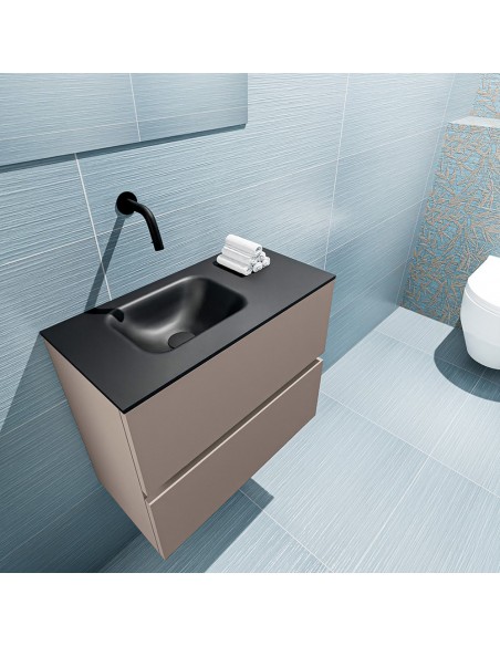ADA Komplet badmiljø med venstrevendt håndvask til vægmonteret armatur. Badmiljøet kommer med 2 skuffer med fuldt udtræk, og er fremstillet i MDF. Håndvasken er fremstillet i sort solid surface. Badmiljøet måler 60 x 50 cm i bredde og højde. Det viste armatur medfølger ikke i sættet.