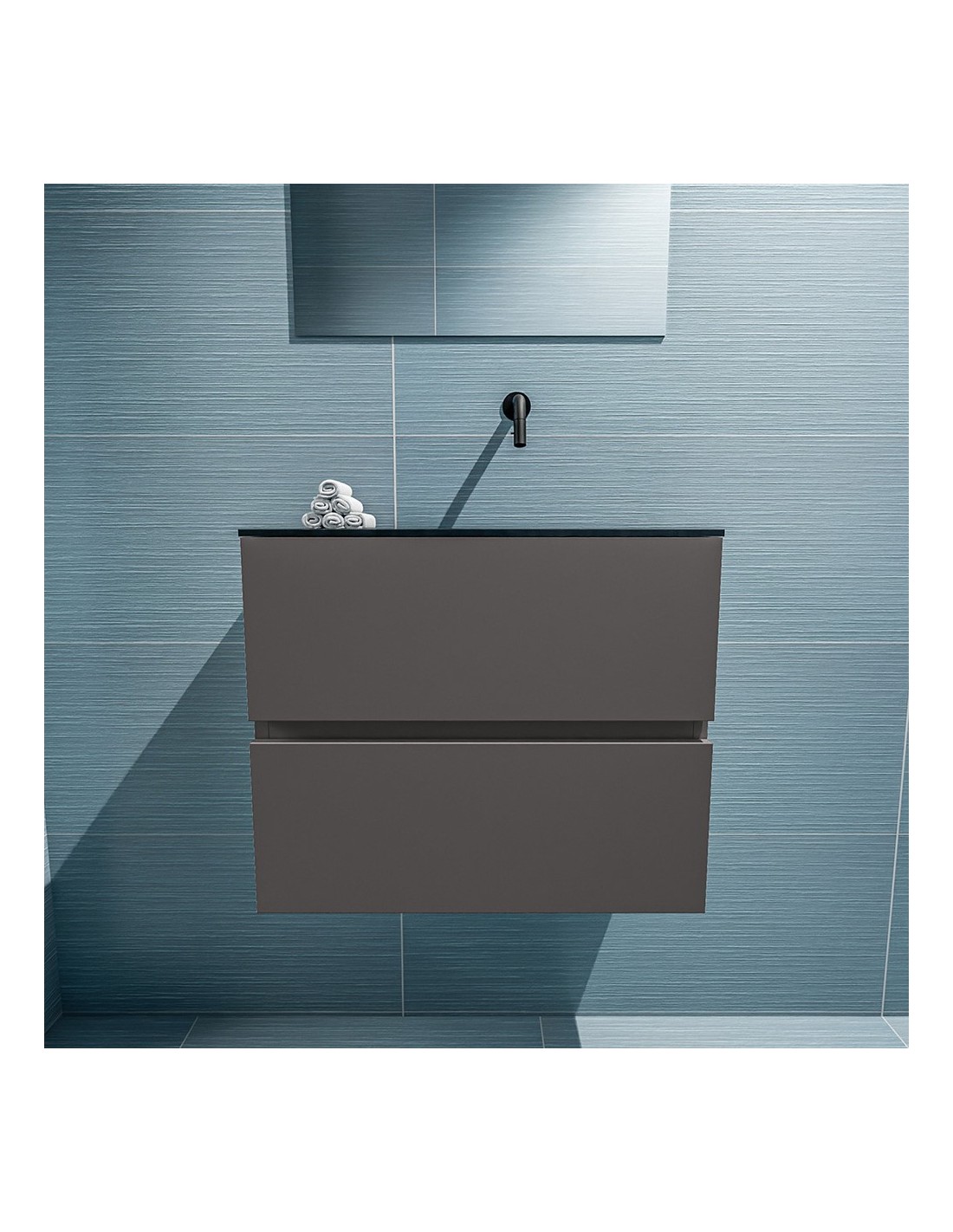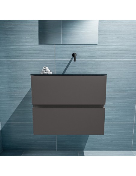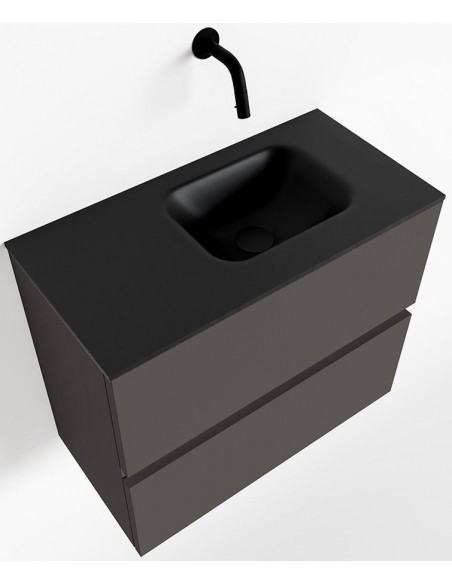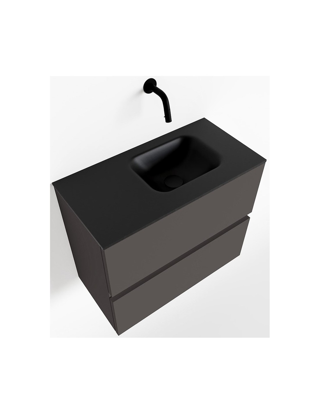 ADA Komplet badmiljø med højrevendt håndvask til vægmonteret armatur. Badmiljøet kommer med 2 skuffer med fuldt udtræk, og er fremstillet i MDF. Håndvasken er fremstillet i sort solid surface. Badmiljøet måler 60 x 50 cm i bredde og højde. Det viste armatur medfølger ikke i sættet.